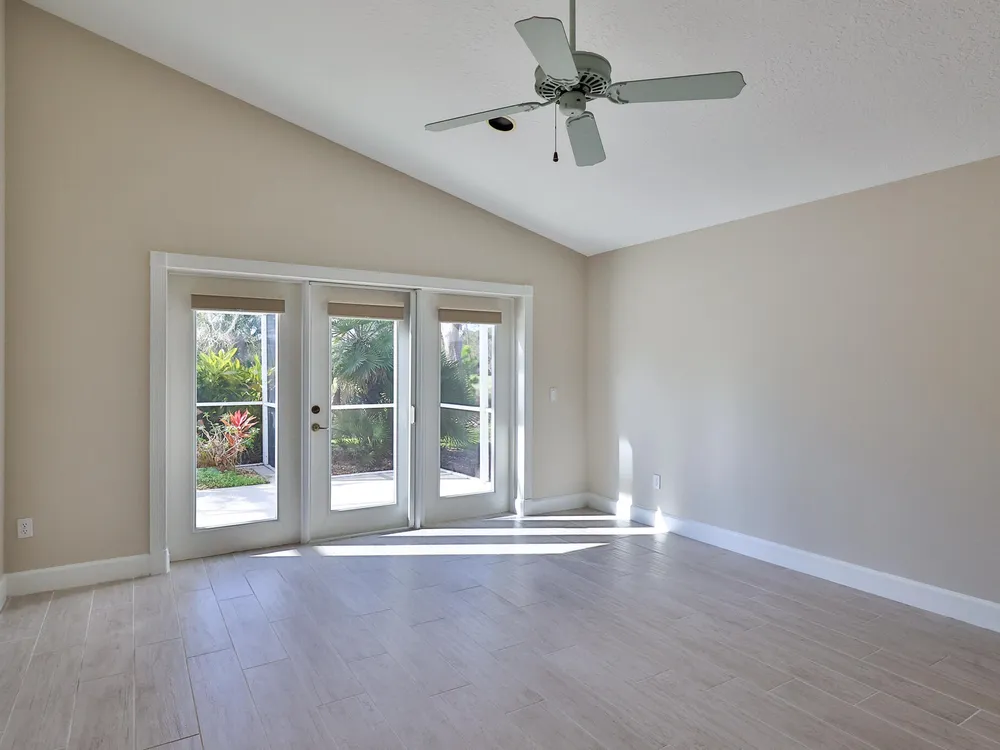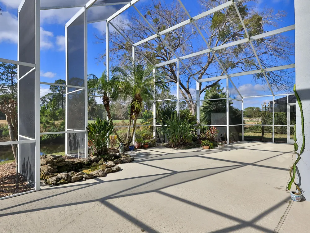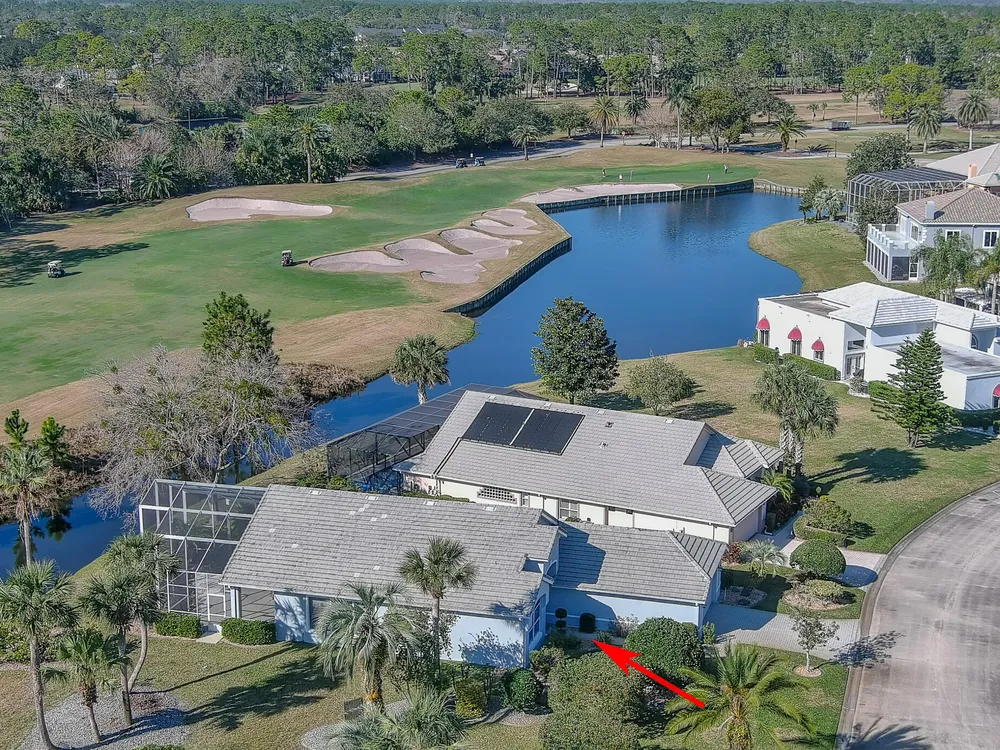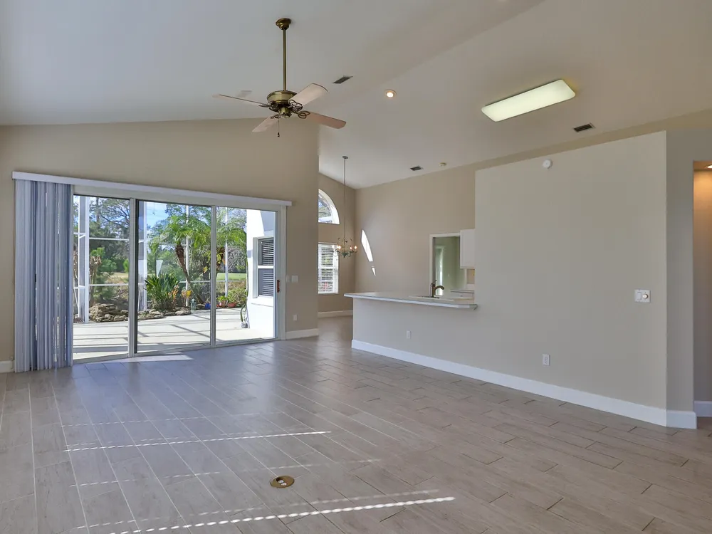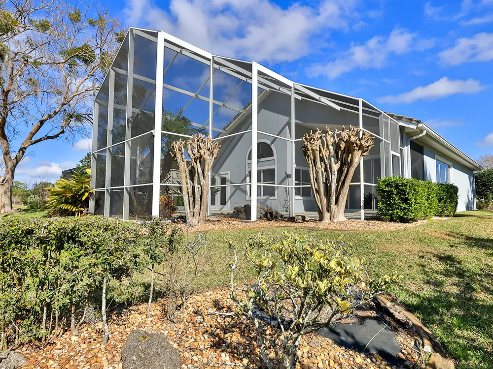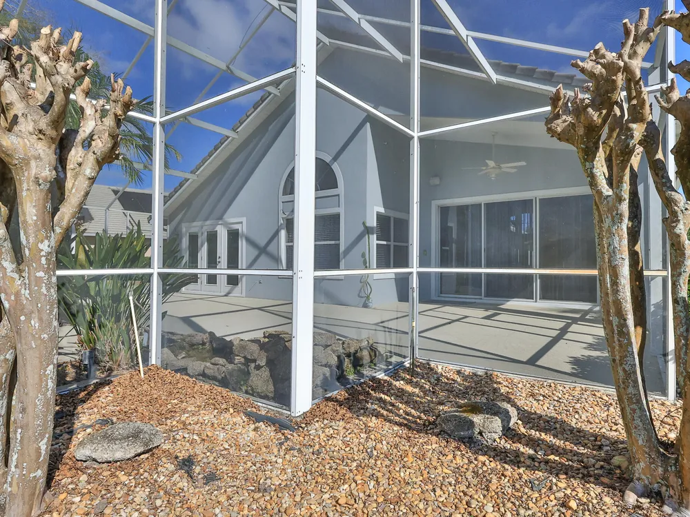 This lovely 3BR 2 BA home is located in the highly desirable Plantation Bay golf community. This spacious home is situated in the heart of the Bay Pointe neighborhood with water and golf course views. The home boasts large rooms with volume ceilings and huge windows for a light and bright home. The large living/dining area opens to lanai, The kitchen has large eating area with views of golf course. The extended screened lanai is perfect for entertainment. The 3rd BR is used as a den with built-in shelves and cabinets. The master suite has doors to lanai and vaulted ceiling and large master bath with double vanity, tub and separate shower and walk in closet. Guest bedroom is oversized with large closet. Guest bath with shower. Oversized garage with sink and tons of storage cabinets. New a/c installed 2024. Exterior painted in 2022. New tile flooring installed in 2021. Located on a cul de sac, close to the fabulous new clubhouse. OWNER FINANCING POSSIBLE.