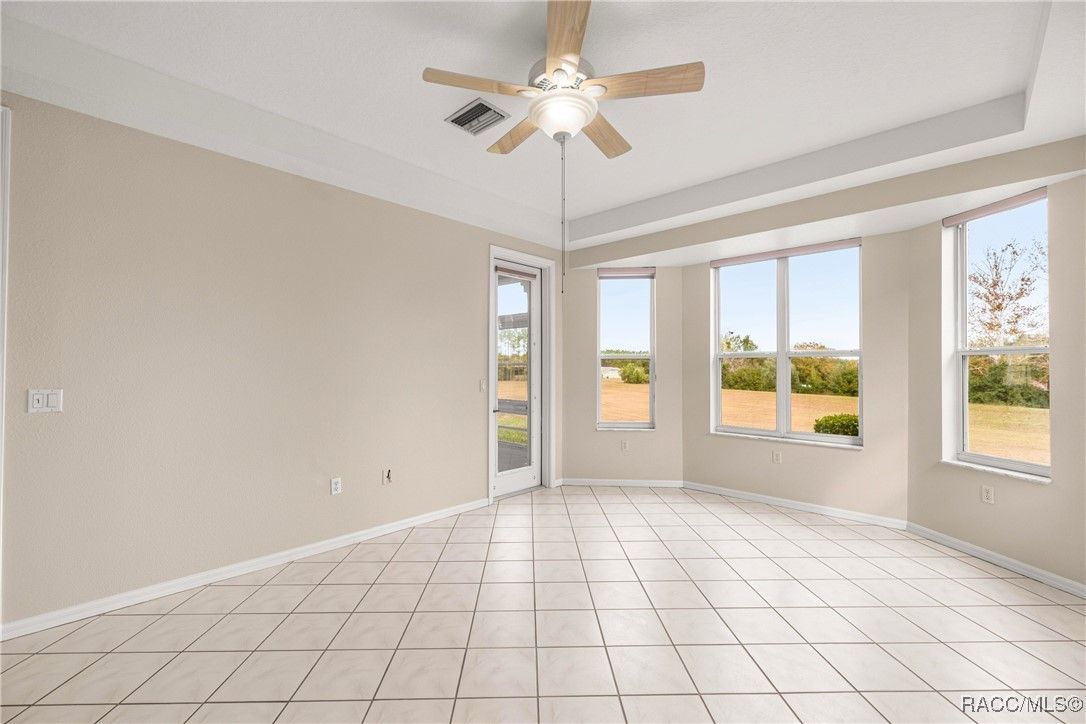 Don't miss this beautiful Carefree Lantana style home in the amenity rich community of Terra Vista! It's freshly painted, professionally cleaned, clean windows and power washed, making it move in ready for you! And...it is walking distance to the pickleball courts, Activity Center and Swimming Pool! Behind the home is an expansive neatly manicured DRA that give privacy and space between the other homes; imagine enjoying the Sun rising in the morning as you are having coffee in the large Sunroom. Home has tile throughout, with a flush tile countertop in the kitchen. With 3 bedrooms, a dining room and the great room, the open feel of this home is amazing. The Tray Ceilings will greet you as you walk through the fused Glass front door. All the windows are double pane, with custom silhouette blinds and the third bedroom has French doors. The Butler bar is perfect for entertaining as you fill this home with your new friends! Every room is large and spacious. Don't want a dining room, ask your Agent to have the Listing agent send you a picture of how easy it is to make it an open office, truly beautiful. The Sunroom is perfect to enjoy the expansive view of the trees, homes and gorgeous sky. With the lush landscaping to view, enjoying this home will give you peace and serenity. Want to play pickleball, or go dancing? It all here with the amenities as the Spa, Fitness Center, 3 restaurants, Swimming Pools, club houses, Tiki Bar, Bacci, taking fido for a walk. Or cycling in the community or on the custom trails just outside, there is so much to do! What is stopping you from making this home, yours.