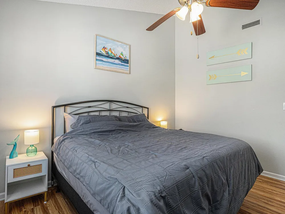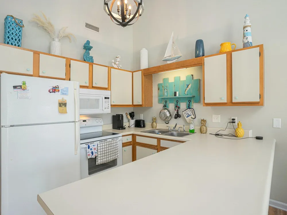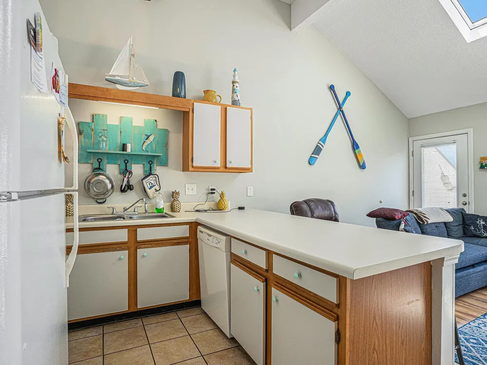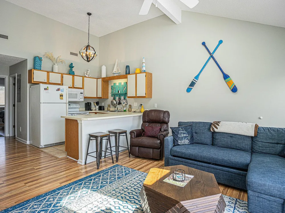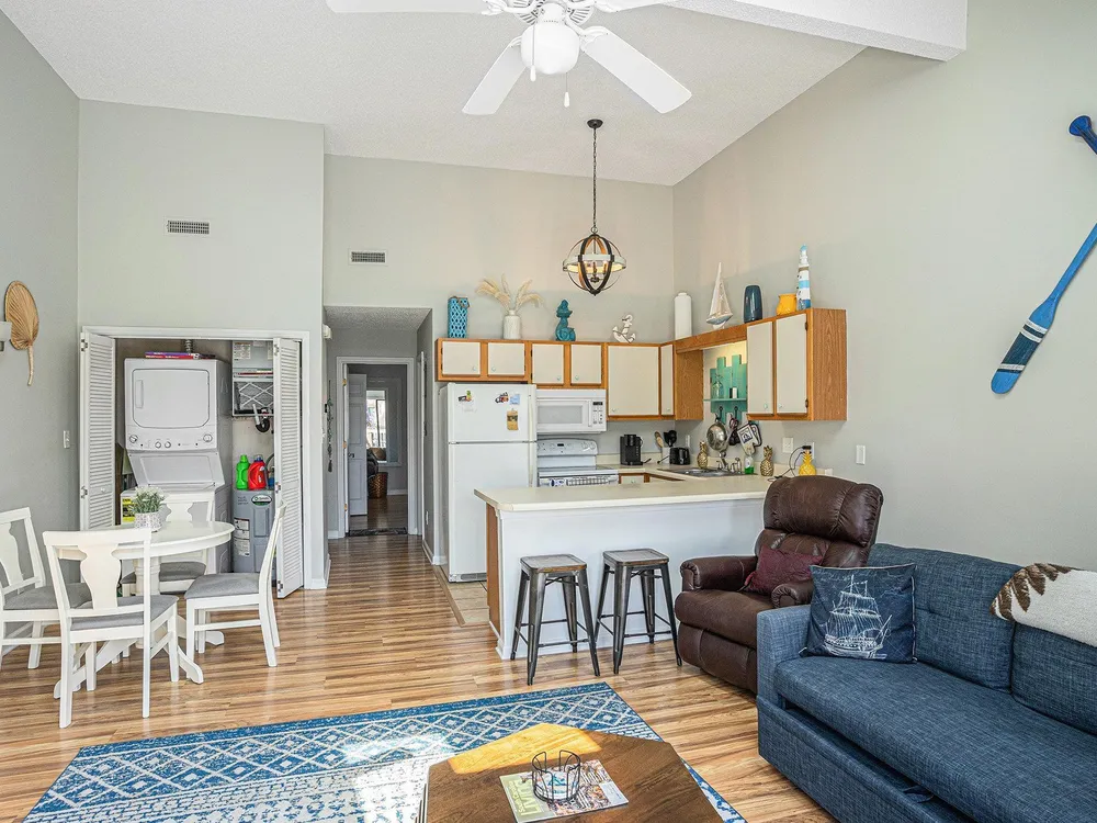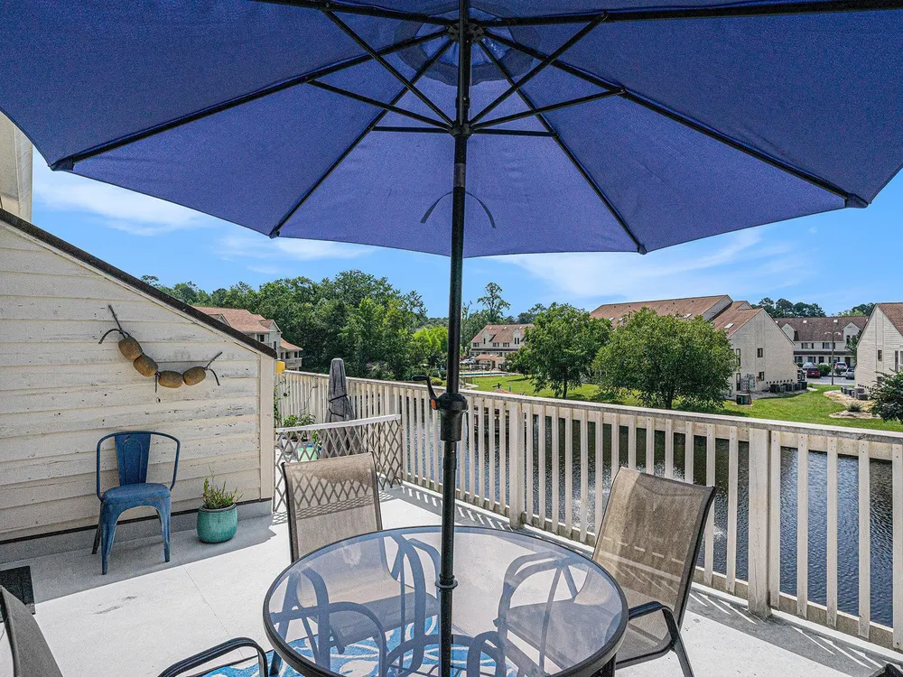 This is a beautiful sun-filled, top-floor, 1-bedrooom, 1-bathroom end unit. Vaulted ceilings with skylights fill the space with natural light, creating an airy, open feel. The spacious balcony provides relaxing water views perfect for enjoying your morning coffee or evening sunsets. The open-concept layout connects the kitchen, dining area, and living room, with plenty of storage in the kitchen for added convenience. This unit is ideal as a primary residence, vacation getaway, or investment property. Located in Fairwood Lakes, part of the Island Green community, residents enjoy access to two community pools. Just minutes from Surfside Beach, with quick access to local attractions, the airport, and Murrells Inlet.