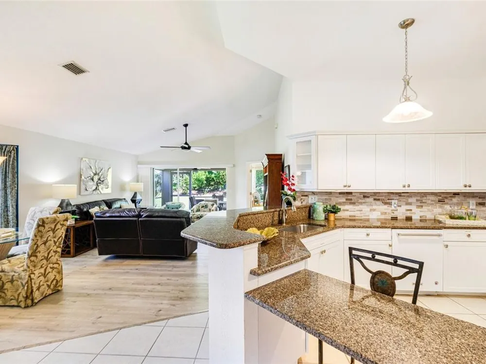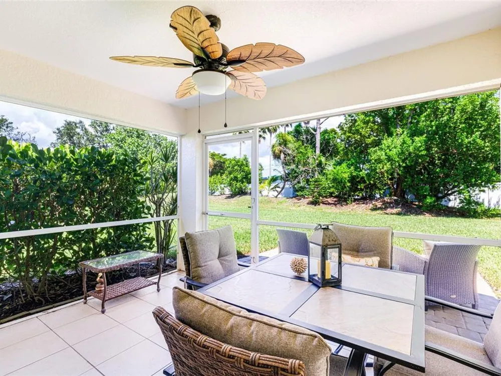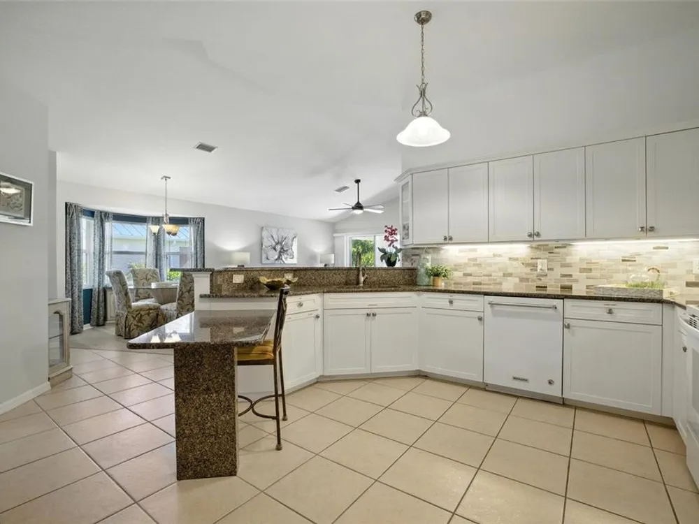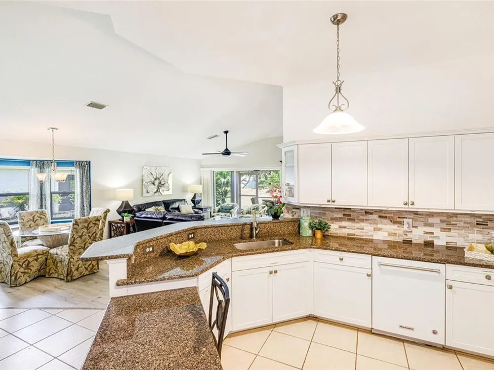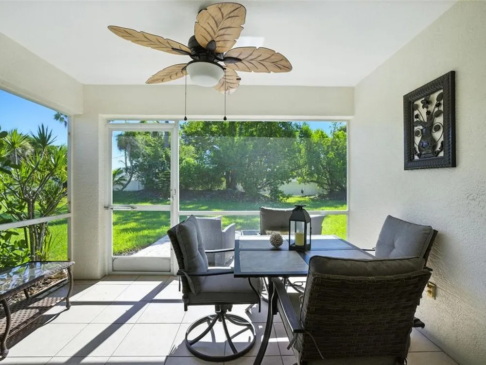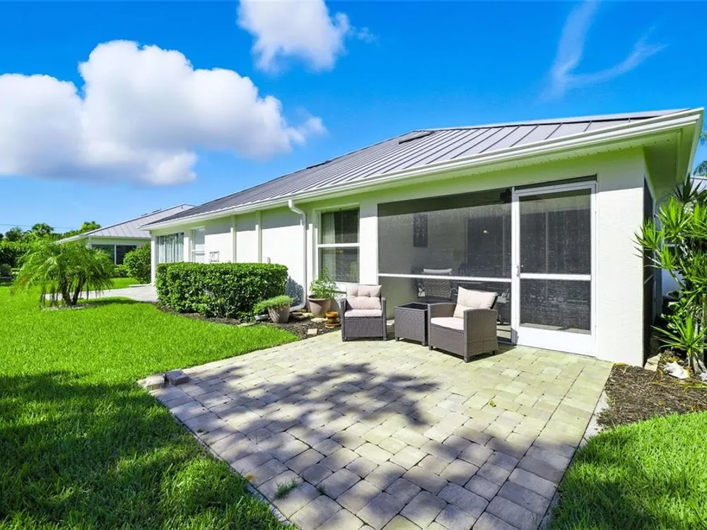 Looking for the perfect Florida get away? This maintenance-free two bedroom villa is located in the gated resort community of Burnt Store Marina and offers a fabulous option. Move right in without lifting a finger as it comes with a tasteful turnkey furniture package so you can settle in and start enjoying paradise right away. This desirable end unit boasts a pleasing open floorplan filled with an abundance of natural light and soaring ceilings. The expansive kitchen features abundant cabinetry finished with top molding, tile backsplash and granite countertops. A handy built in dining table and breakfast bar provide casual dining options. A new Frigidaire refrigerator was added in 2025, and dishwasher and disposal a few years ago. Additional storage is available in the convenient pantry closet. The inviting living and dining area boasts neutral laminate flooring and sliding glass doors that open to a charming tiled, screened lanai. From here, you’ll enjoy a serene, park-like backyard view, along with a bonus paver patio—perfect for morning coffee or evening relaxation. Delight in the tropical breezes when you open the door to the front and back lanais and feel like you have found heaven. The generously sized primary suite enjoys a dramatic vaulted ceiling and large window overlooking the yard, walk-in closet and ensuite bathroom with a tiled walk-in shower and stone-topped vanity. The guest bedroom is located on the opposite side of the residence and features a bump out large window to welcome in the Florida sunshine with an adjacent upgraded guest bath creating a comfortable and private space for visitors. The laundry room leads you to the attached oversized one car garage to store all of your recreational gear. The complex boasts a handsome metal roof and takes care of all exterior maintenance. The monthly fee also includes internet and cable. Best of all is the incredible lifestyle that is offered at Burnt Store Marina which offers an impressive array of amenities, including a 27-hole golf course, waterfront dining, fitness and racquet club, and the largest deepwater marina on Florida’s west coast. Whether you’re boating, golfing, playing pickleball, or simply lounging by the pool, every day feels like vacation.