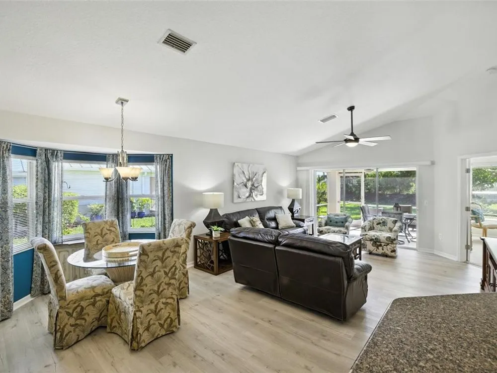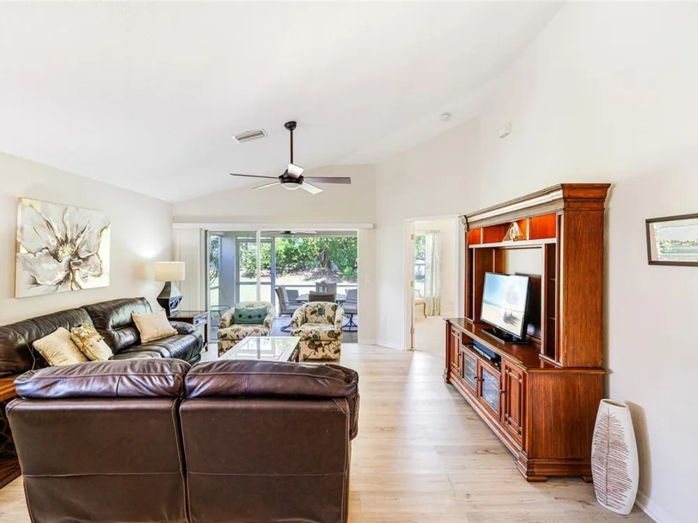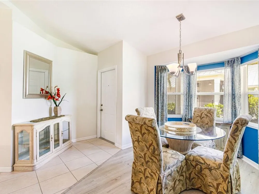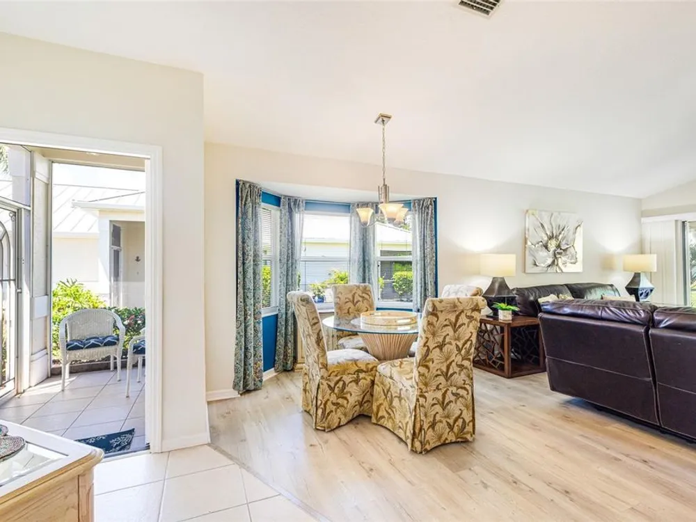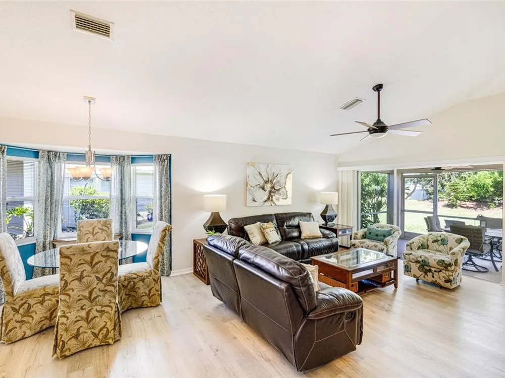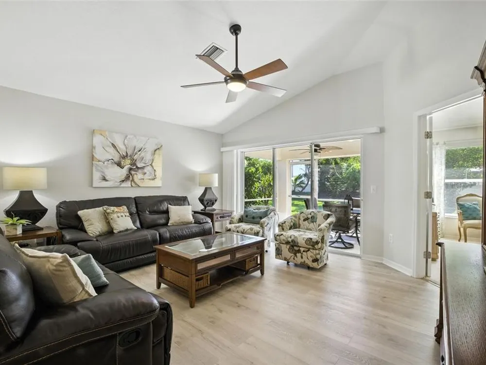 Looking for the perfect Florida get away? This maintenance-free two bedroom villa is located in the gated resort community of Burnt Store Marina and offers a fabulous option. Move right in without lifting a finger as it comes with a tasteful turnkey furniture package so you can settle in and start enjoying paradise right away. This desirable end unit boasts a pleasing open floorplan filled with an abundance of natural light and soaring ceilings. The expansive kitchen features abundant cabinetry finished with top molding, tile backsplash and granite countertops. A handy built in dining table and breakfast bar provide casual dining options. A new Frigidaire refrigerator was added in 2025, and dishwasher and disposal a few years ago. Additional storage is available in the convenient pantry closet. The inviting living and dining area boasts neutral laminate flooring and sliding glass doors that open to a charming tiled, screened lanai. From here, you’ll enjoy a serene, park-like backyard view, along with a bonus paver patio—perfect for morning coffee or evening relaxation. Delight in the tropical breezes when you open the door to the front and back lanais and feel like you have found heaven. The generously sized primary suite enjoys a dramatic vaulted ceiling and large window overlooking the yard, walk-in closet and ensuite bathroom with a tiled walk-in shower and stone-topped vanity. The guest bedroom is located on the opposite side of the residence and features a bump out large window to welcome in the Florida sunshine with an adjacent upgraded guest bath creating a comfortable and private space for visitors. The laundry room leads you to the attached oversized one car garage to store all of your recreational gear. The complex boasts a handsome metal roof and takes care of all exterior maintenance. The monthly fee also includes internet and cable. Best of all is the incredible lifestyle that is offered at Burnt Store Marina which offers an impressive array of amenities, including a 27-hole golf course, waterfront dining, fitness and racquet club, and the largest deepwater marina on Florida’s west coast. Whether you’re boating, golfing, playing pickleball, or simply lounging by the pool, every day feels like vacation.
