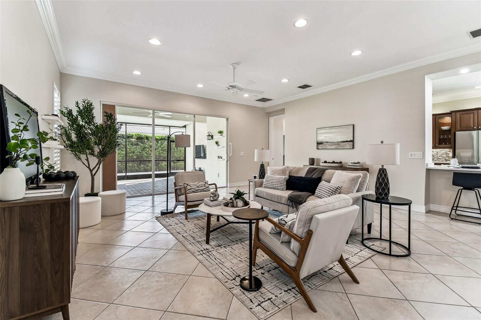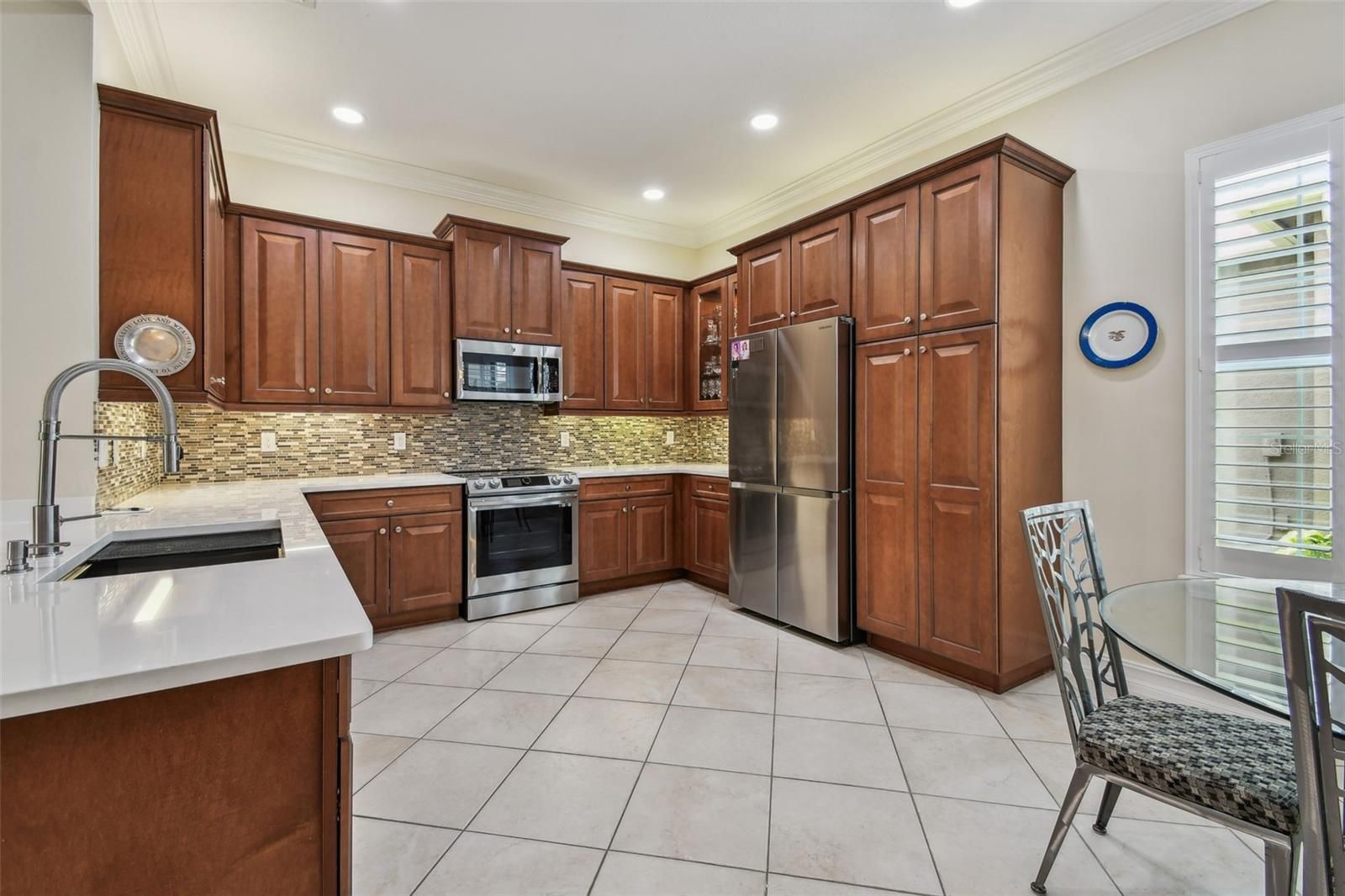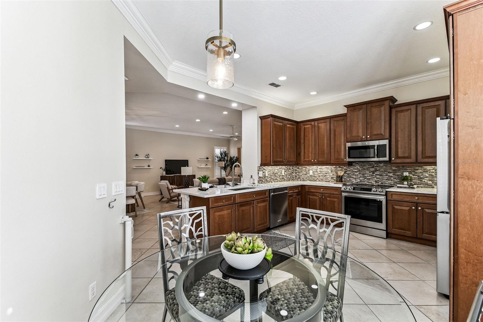 - Ceiling Fan(s), Crown Molding, Eat-in Kitchen, Living/Dining Room, Open Floorplan, Main Level Primary, Solid-Wood Cabinets, Split Bedrooms, Stone Counters, Tray Ceiling(s), Walk-In Closet(s), Window Treatments