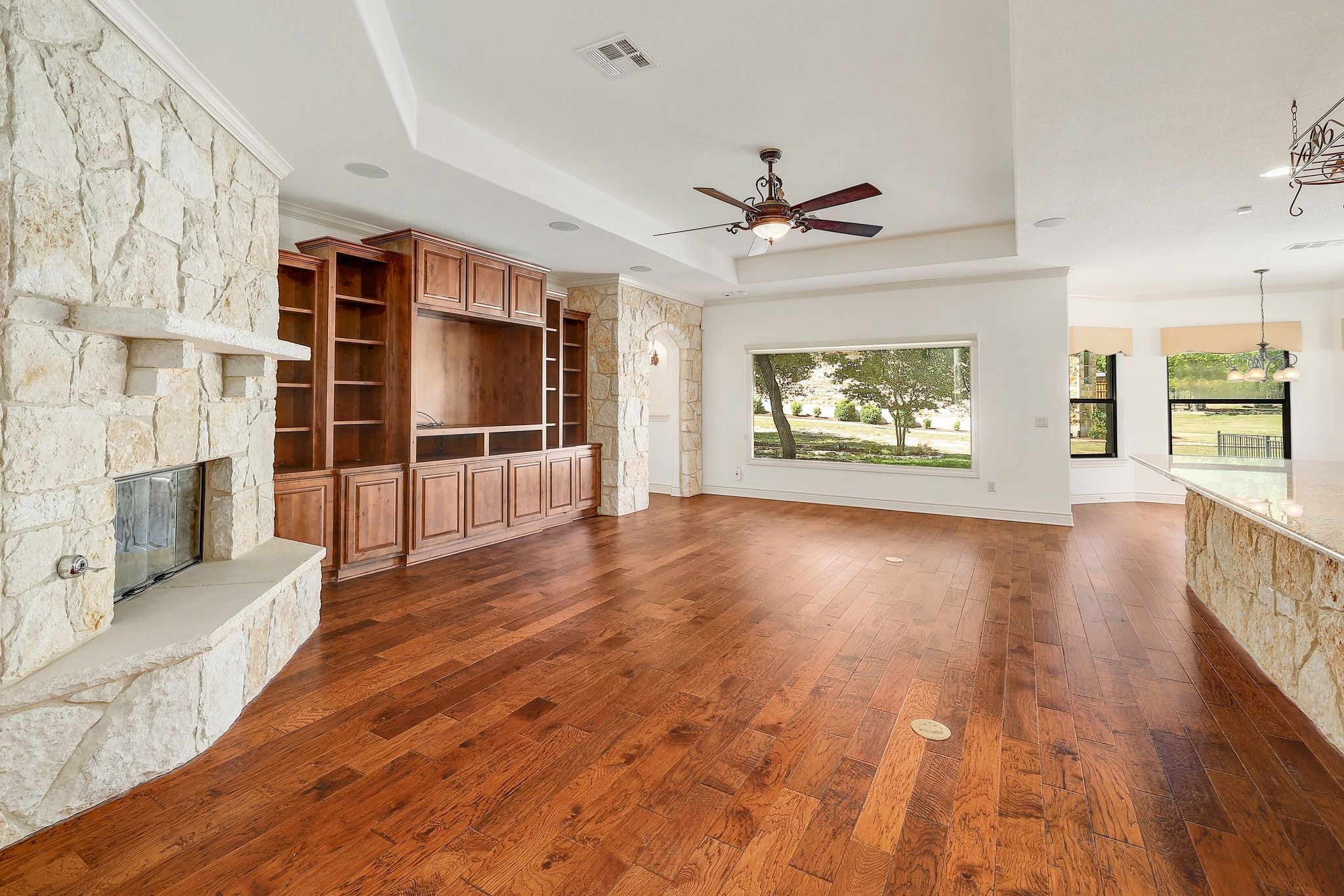 This Heritage Oaks one-story single-family home features 3 bedrooms, 2.5 bathrooms and a dedicated office, designed for those looking to enjoy their best years in a premier 55+ community where the neighbors feel like family. Coming home to Heritage Oaks means pulling onto a street lined with mature trees and a sense of quiet you won't find just anywhere. This is a neighborhood where people spend time together, whether it’s at the incredible clubhouse, in the fitness center, or catching up on the walking trails. The stone siding and thoughtful landscaping fits right into the relaxed pace of the community. Inside, the layout makes sense for daily life. Tucked away at the front of the home is a dedicated office, perfectly placed for quiet time, with a half bath nearby for convenience. Down the foyer, the formal dining room is waiting for those holiday dinners or a Friday night card game with friends. As you move into the back of the house, the living room opens up with gorgeous wood flooring, built-in wood entertainment center and a large stone fireplace. The kitchen is open to the living area, featuring a center island with a breakfast bar, granite countertops, and wood cabinetry. With a wine fridge, built-in oven, and a breakfast area surrounded by a bay window, it's easy to host a crowd or just enjoy a quiet cup of coffee while looking out at the yard. The primary suite is located in its own wing of the house for plenty of privacy. The ensuite bathroom feels like a personal spa with a dual vanity, a soaking tub, and a separate step-in shower, plus two walk-in closets. Out back, the large covered patio, with an automatic screen, is the best spot in the house to watch the birds or just enjoy the shade. Plus the entire home is wired with Bose surround sound! Living here means you are never far from what you need. You are only minutes from a peaceful afternoon at Lake Georgetown and just down the road from the local HEB and the various dining options along Williams Dr.