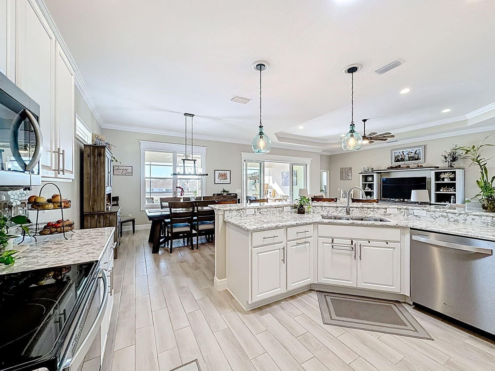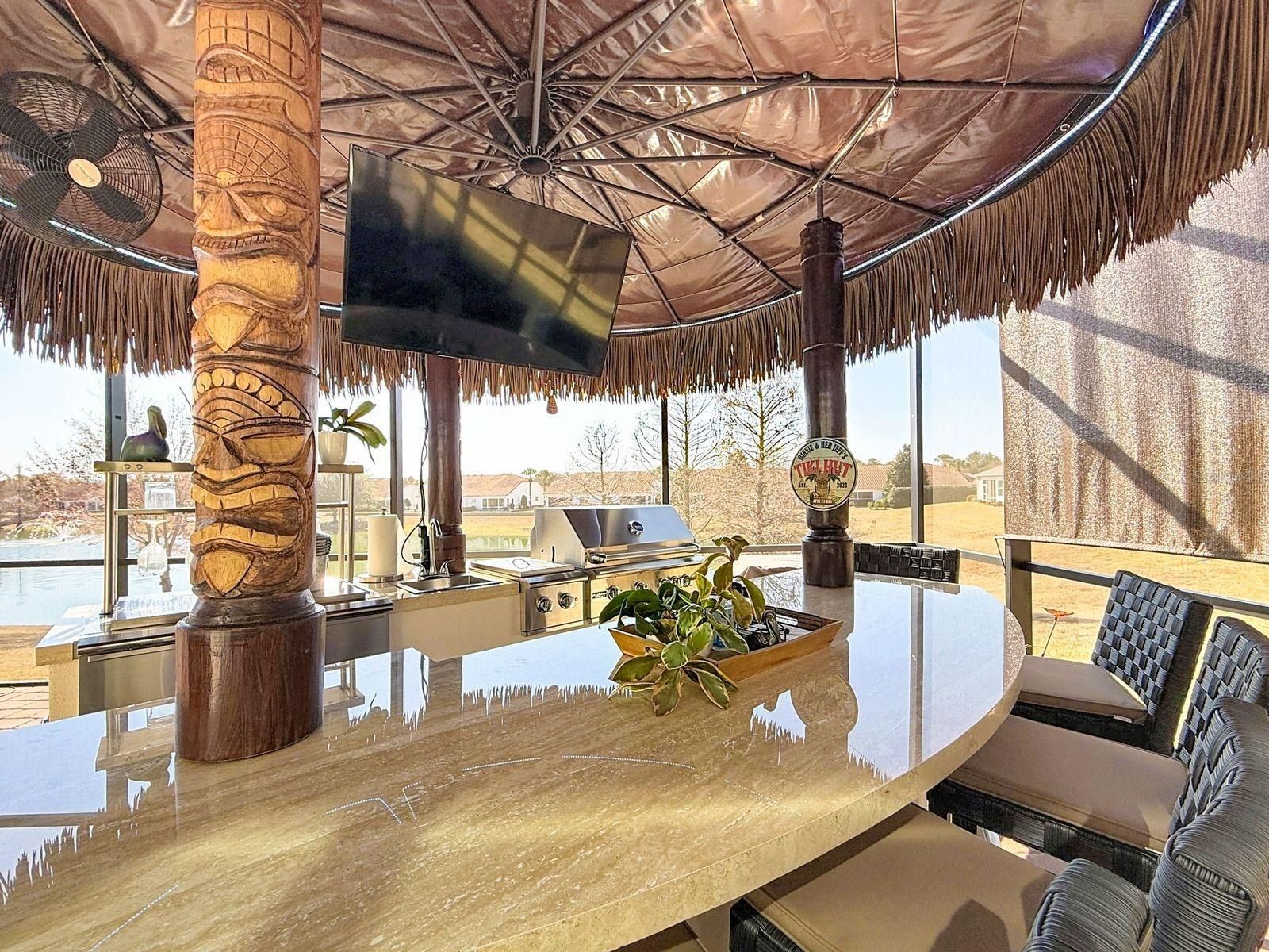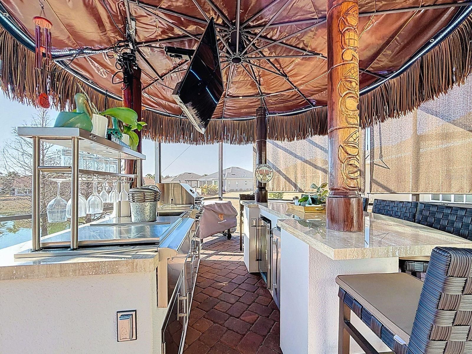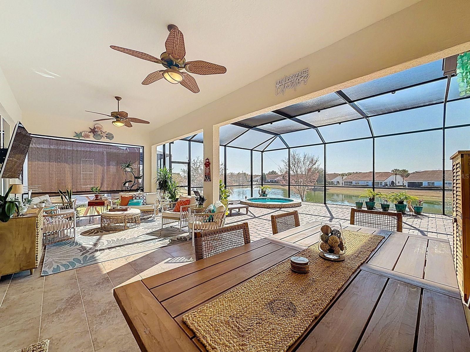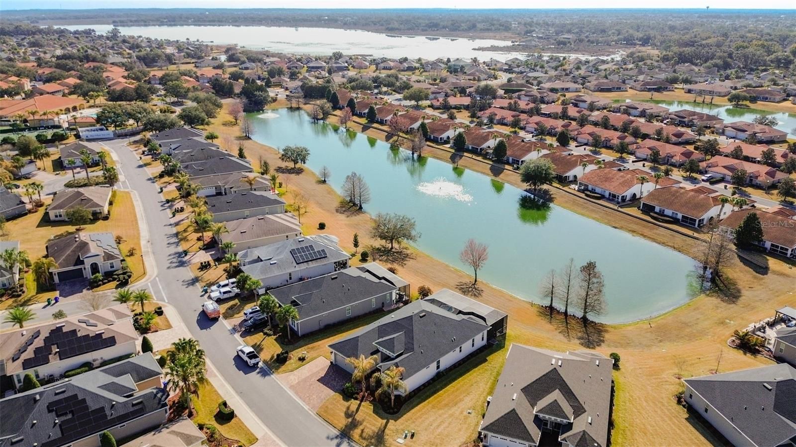 The Stylishness of Outdoor Living at its finest. An extraordinary, unique 4 year old home is a 3 bedroom/2 bath Designer home with an office, its a Berkshire representation located in the highly sought after gated community of the favored Lakeside Landing community. The community is located right next to the Villages entrance (3/10 of a mile) which is golf cart accessible. The community has Resort Style Amenities with 2 pools heated and the eccentric Clubhouse pool is one of the largest walk-in heated pools with a waterfall in Central Florida. Both outdoor community pools have hot-tubs, the main pool has an oversized Cabana with TV's & there is scheduled monthly community gatherings and is available for personal rentals, with walking access to the pickle ball, ping pong tables, shoot pool in the Billiard room, or use the gym while your enjoying the sun and the premium resort pool amenities. This HOME is a MUST SEE Treasure, built in May of 2022, where Comfort, cordiality, tranquility and peacefulness were kept in mind when designing this sumptuous lavish home. You walk into the Foyer and instantly have breathtaking views that make for an astonishing surprise to observe from the 28.8' x 12.9' covered lanai with ceramic flooring, along with the upgraded attached 24'x48' Birdcage. That immense Birdcage covers a 9' round in ground 2 in 1 (hot and cold) SPA with stonework surrounding the outside. It doesn't end there with the extras under the Birdcage, there is a Tiki Bar with 6 upgraded outdoor quality Bar stools, 2 loungers, a FULL Kitchen with a wine refrigerator, food refrigerator, running water, LED lighting, storage, grill, warmer, and burners, lets not forget that View. At Sunset there is no other place you would want to be, the panorama sight from your own lanai is unspeakable, accompanying the color changing fountains in the pond and the moonlit skies make for a magical evening steps from your own sliding doors. Interior was Painted in 2024. Prepare your infamous family secret recipes in your chef's style kitchen, with plentiful cabinets, full surround backsplash, Solar Tube, High Grade appliances (2022), under cabinet lighting, Quartz stone prolonged counter for quick breakfasts, and for having that memorable girls night of appetizers and laughter replayable for years to come. The OPEN Floor plan makes for gratifying family and friends gatherings. The Grand room 18.7' x 21' is satisfying for any number of guests with the crown molding and tray 10' ceilings for the sophistication this home exuberates all through out. Interior decorative molding around lanai patio doors, dining room window and the Front entry window to enhance the uniqueness even more. The Master bedroom has an adjoined Master bathroom with double sinks and ceramic tile flooring with a built in shower bench. The 4th room can be used as an office, den or a gym, the possibilities are endless. The separate Laundry room has a doorway with a new storm door (leave open for fresh air) into the 2 car garage. The completed extended driveway (2025) will accommodate up to 4 cars. The driveway extension allows for an addition of a golf cart garage if so intended. Let this meticulous attention to detail Home be your New Home. Book a showing now, easy to show.