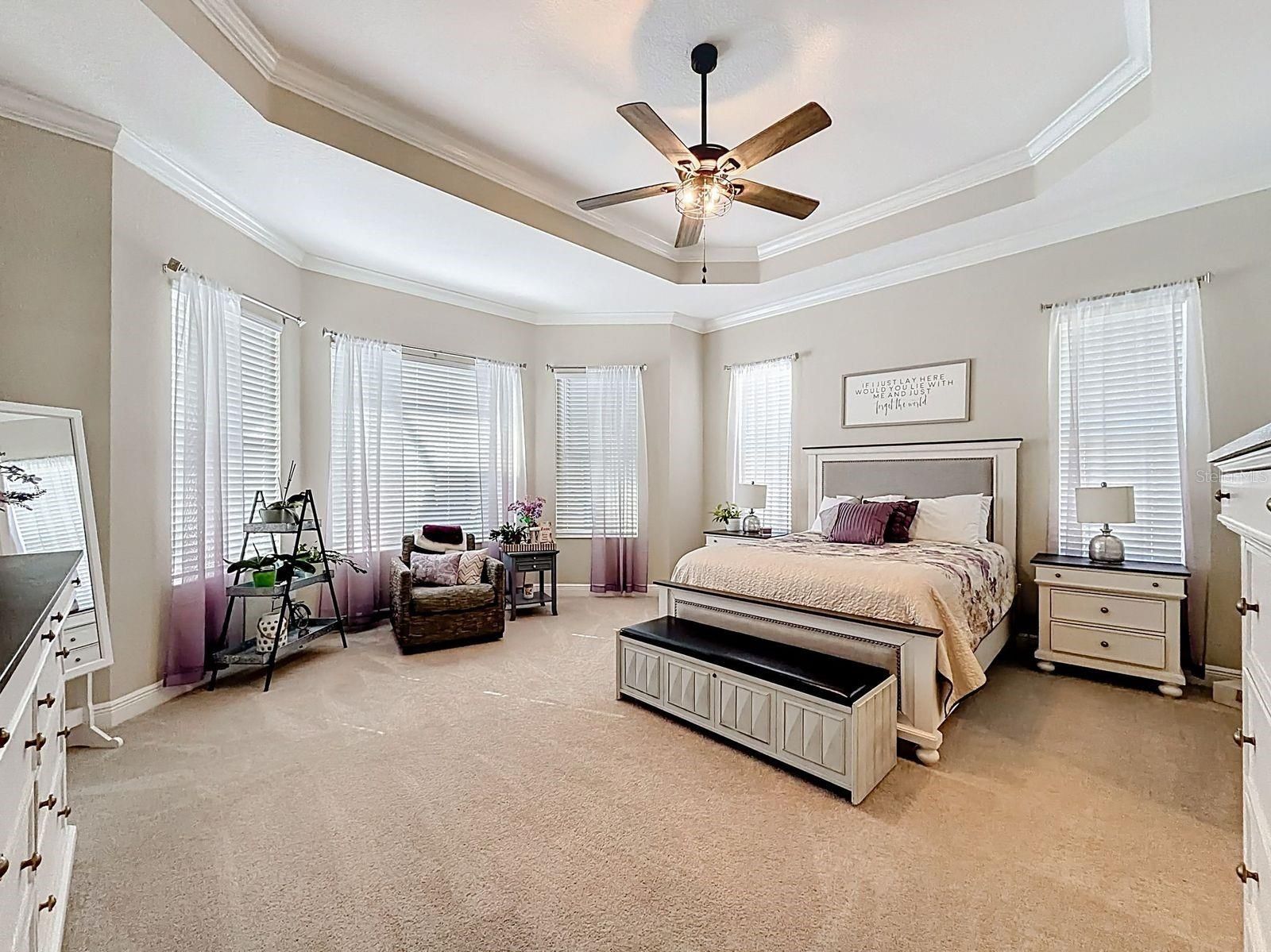 - Ceiling Fan(s), Crown Molding, High Ceilings, Living/Dining Room, Open Floorplan, Main Level Primary, Thermostat, Tray Ceiling(s), Walk-In Closet(s), Window Treatments