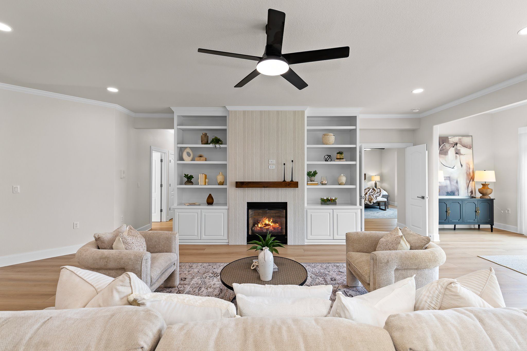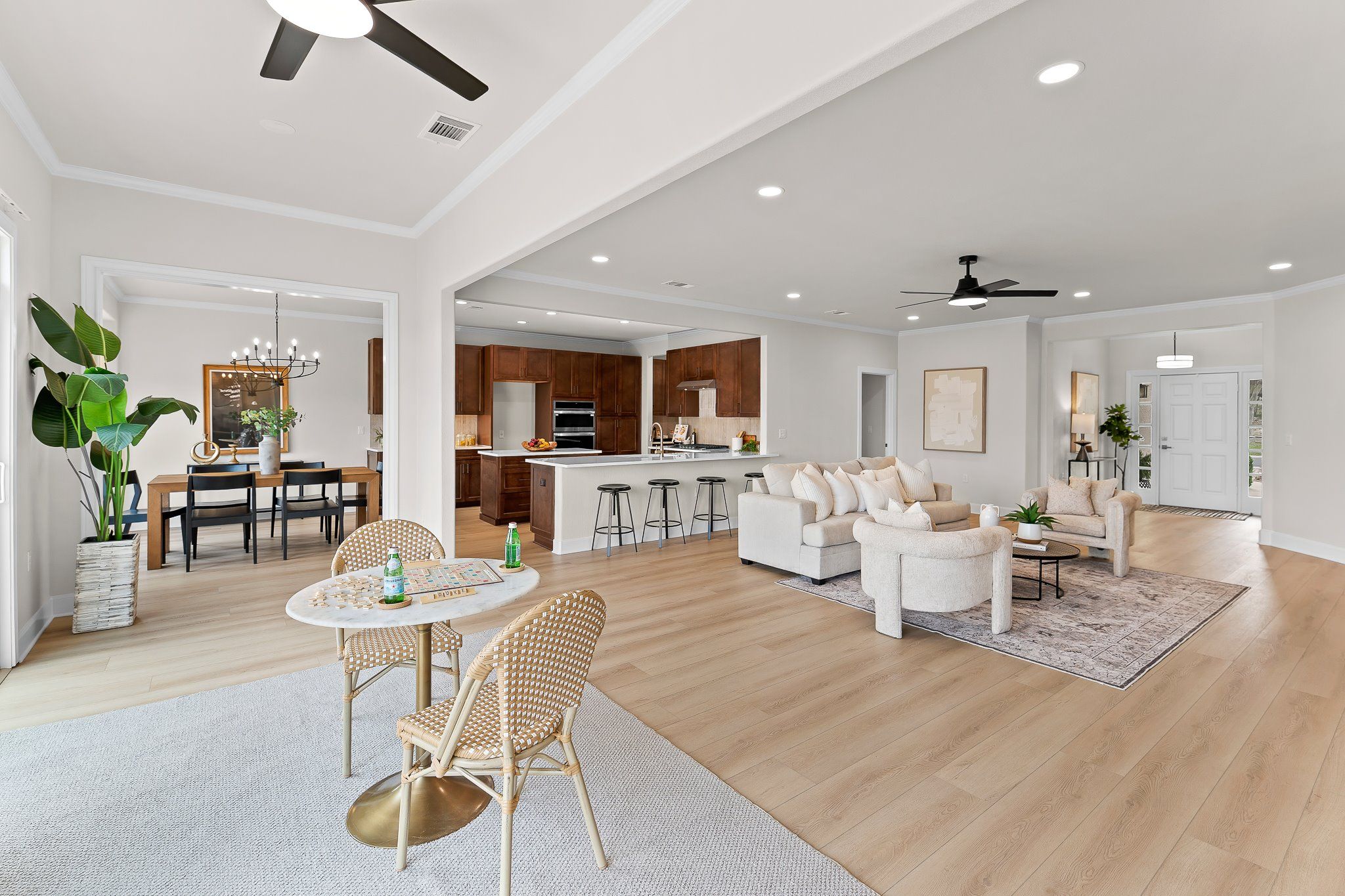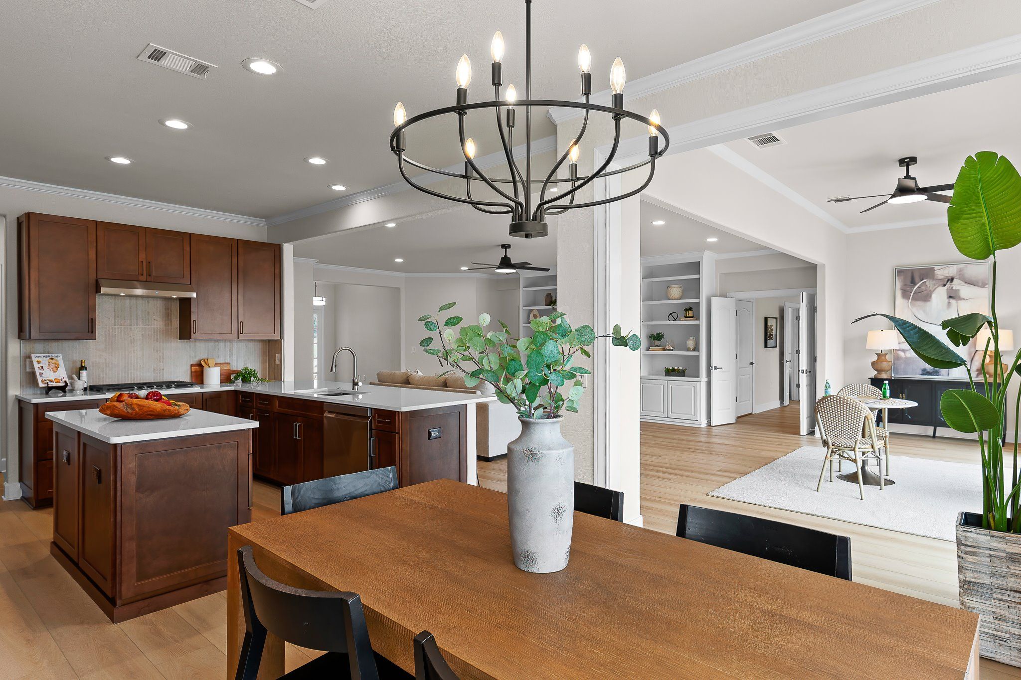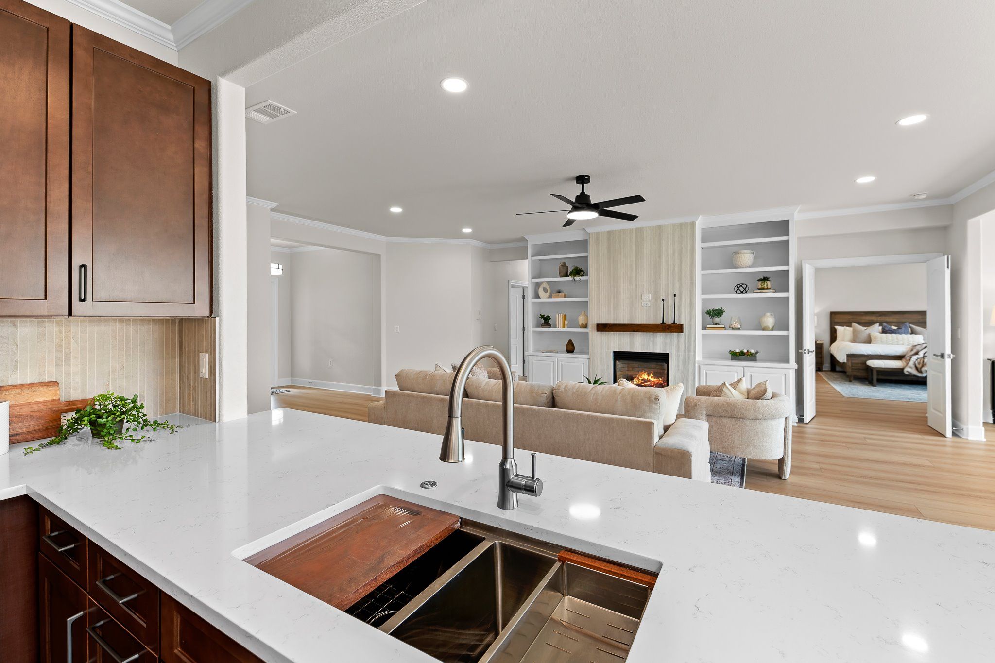 - Built-in Features, Ceiling Fan(s), Chandelier, Crown Molding, Double Vanity, Entrance Foyer, Kitchen Island, Main Level Primary, NoInteriorSteps, Pantry, Quartz Countertops, Recessed Lighting, Walk-In Closet(s), High Speed Internet