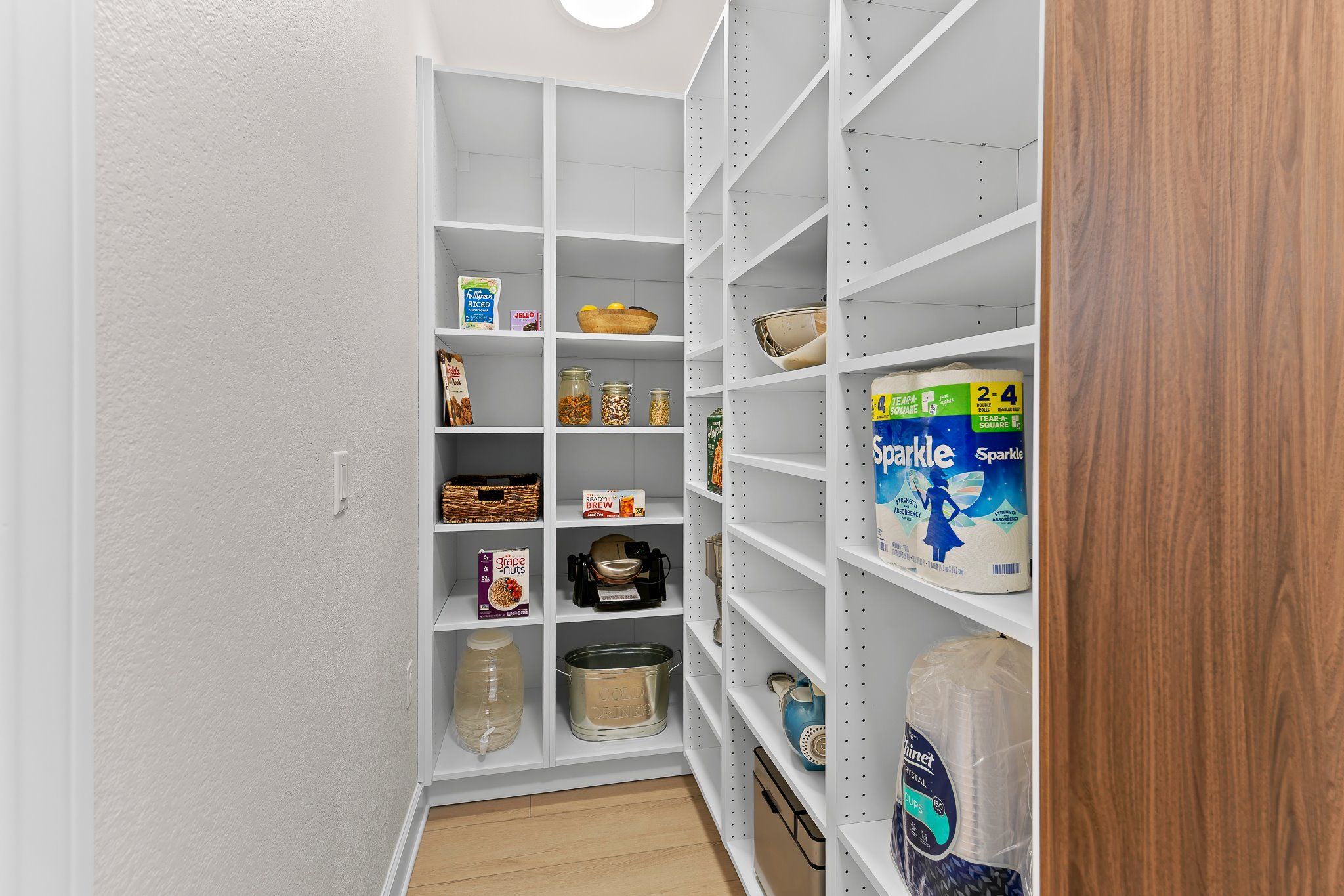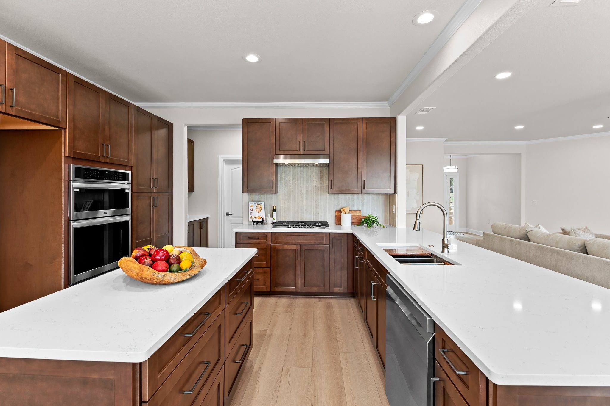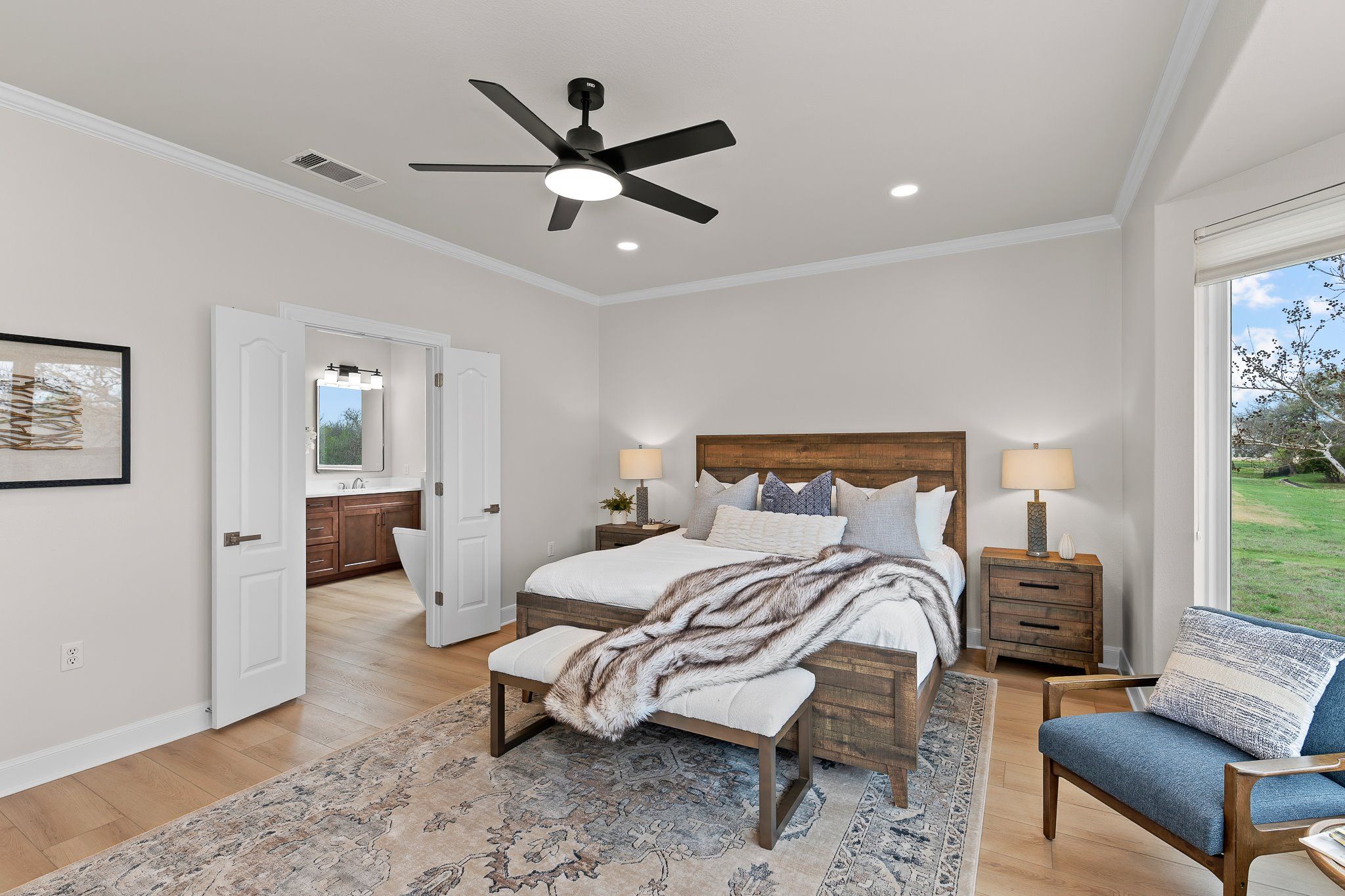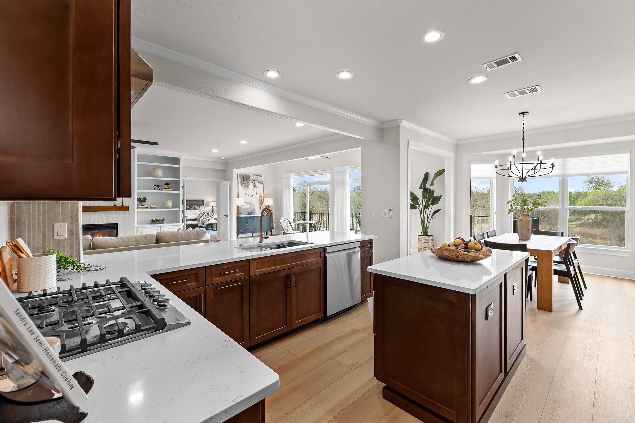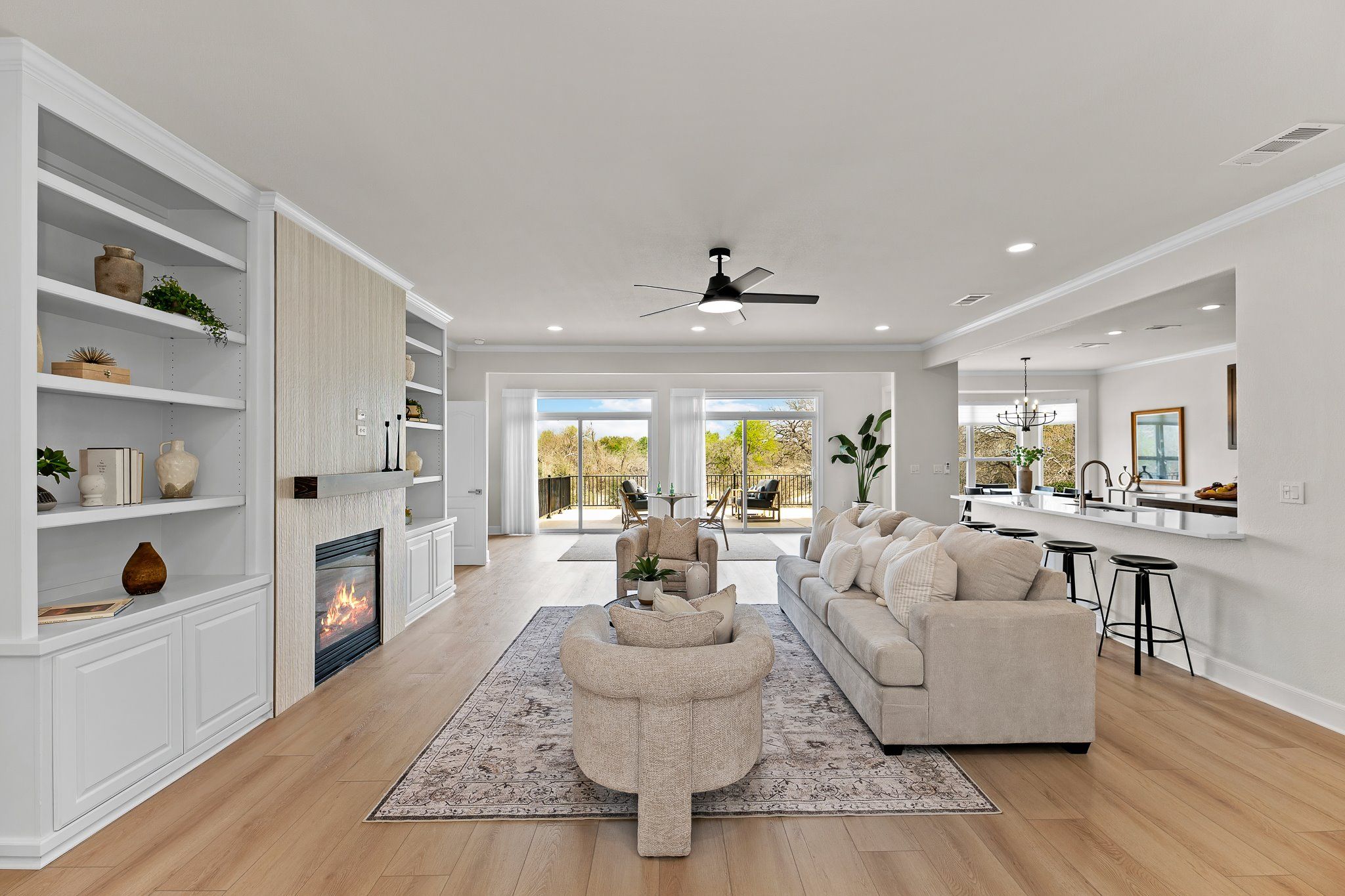- Built-in Features, Ceiling Fan(s), Chandelier, Crown Molding, Double Vanity, Entrance Foyer, Kitchen Island, Main Level Primary, NoInteriorSteps, Pantry, Quartz Countertops, Recessed Lighting, Walk-In Closet(s), High Speed Internet