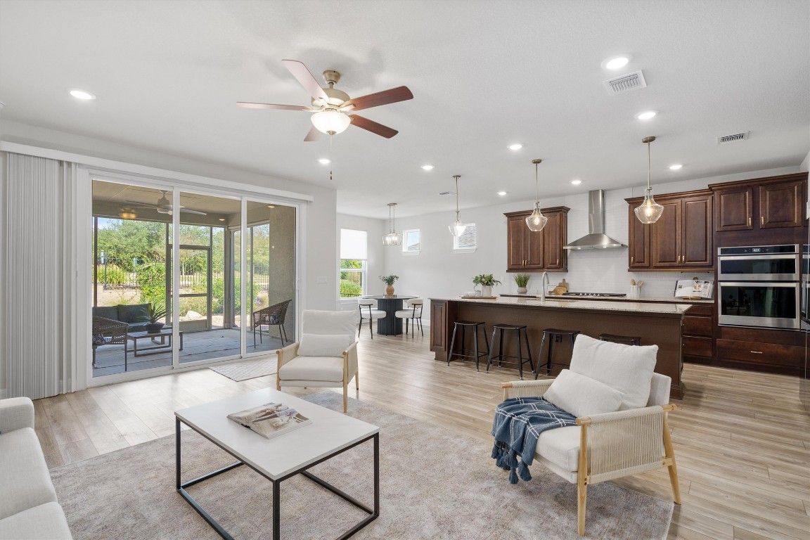 Prepare to be enchanted by this stunning 2021 home located in the premier 55+ Sun City community. Resale homes in this neighborhood are available to those that are 50 years young, and up. Meticulously upgraded, this beautiful Prestige floorplan offers the perfect blend of luxury, comfort, and functionality. Step through the wide, welcoming entryway into an expansive open concept living space, perfectly designed for entertaining and effortless everyday living. The gourmet chef's kitchen serves as the heart of the home, featuring a large island with seating, stainless steel appliances, a 36 inch 5 burner gas cooktop, built in oven and microwave, and a sleek vent hood. The kitchen flows seamlessly into the living and dining areas, creating a harmonious setting for hosting dinner parties or enjoying quiet evenings in. Triple sliding glass doors fill the home with natural light and open to a tranquil, enclosed outdoor dining space - complete with no rear neighbors for ultimate privacy. The xeriscaped yard enhances the beauty of the property while offering low maintenance, lock and leave convenience. Retreat to the secluded primary suite, where you find a deluxe en suite bath boasting two generous walk in closets. Two additional bedrooms provide flexible options for guest accommodations, a home office, library, or creative studio. A discreet half bath adds convenience and privacy for visitors. Additional features include abundant storage throughout, plus a garage extended by four feet for extra space to meet all your storage needs. Located just a short walk from the community's newest amenity center, you'll enjoy access to an array of resort style facilities designed to enhance your active lifestyle - all within this highly sought after neighborhood.
