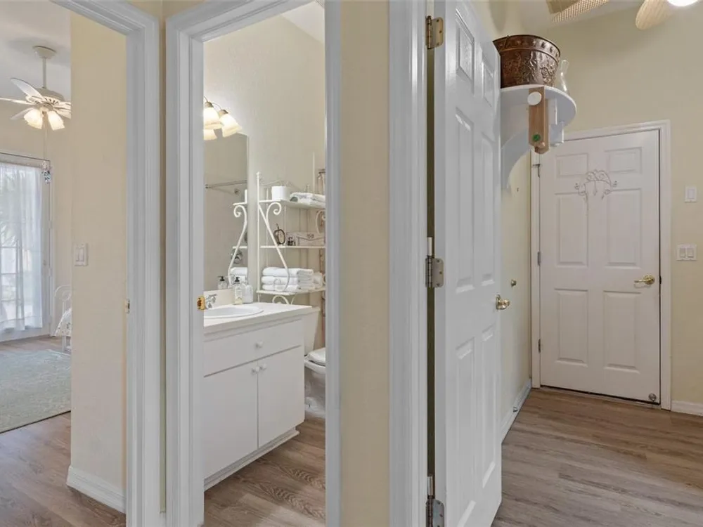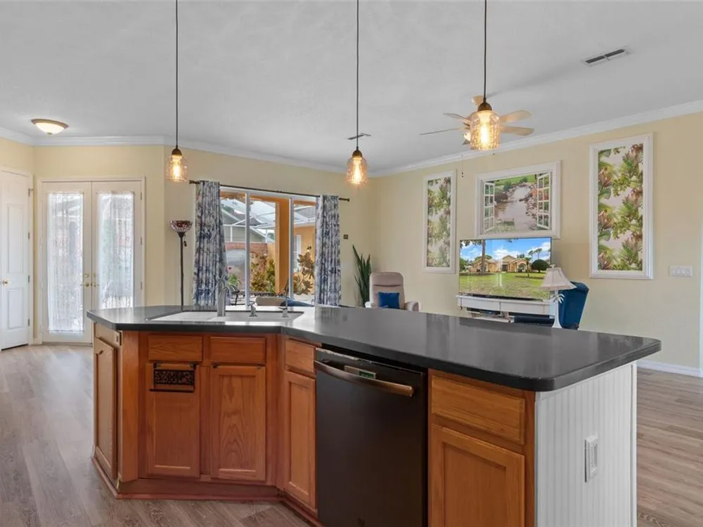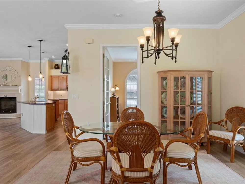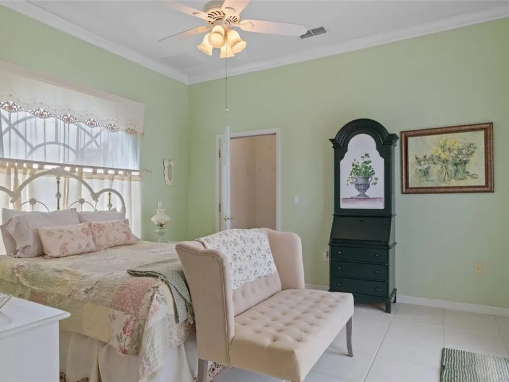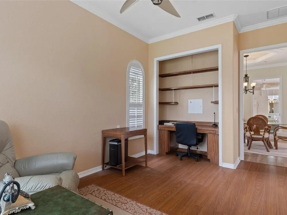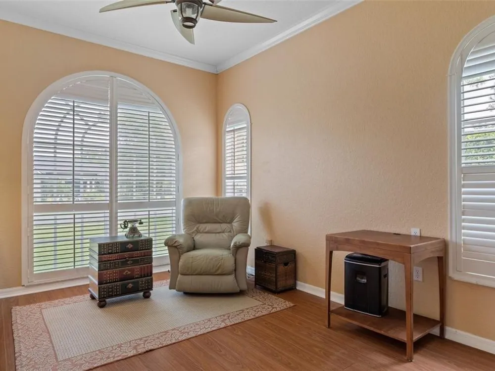 - Ceiling Fan(s), Crown Molding, High Ceilings, In-Wall Pest Control, Kitchen/Family Room Combo, Living/Dining Room, Main Level Primary, Solid Surface Counters, Solid-Wood Cabinets, Split Bedrooms, Walk-In Closet(s), Window Treatments