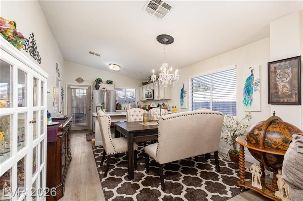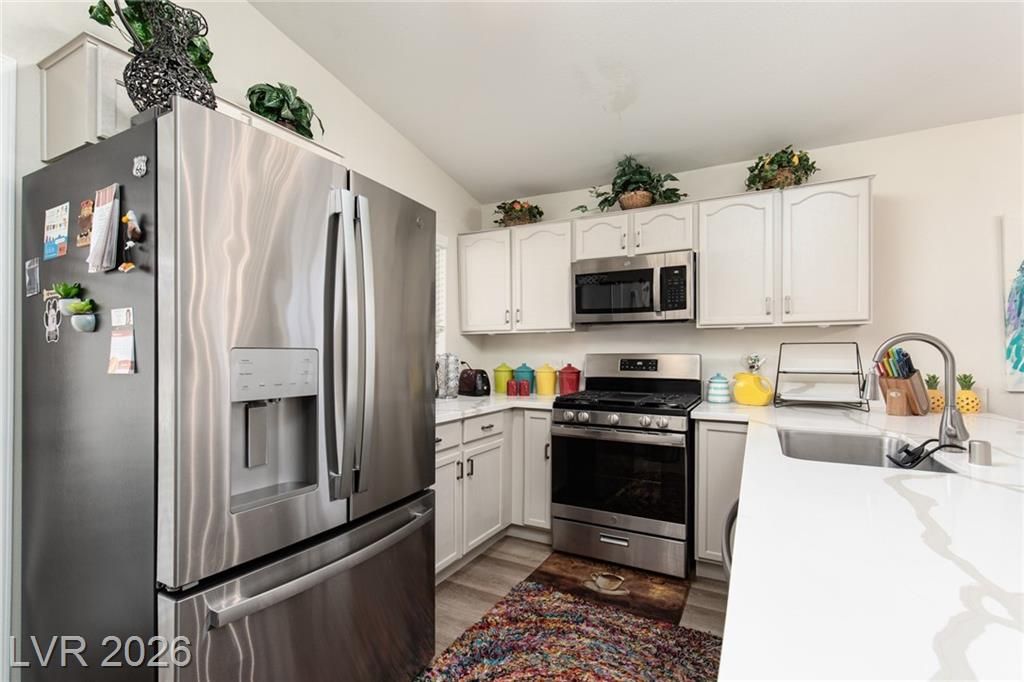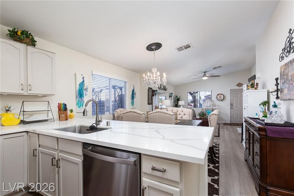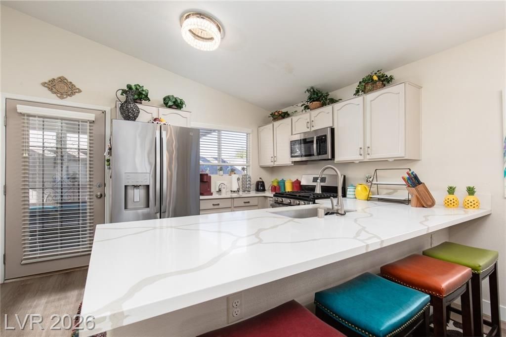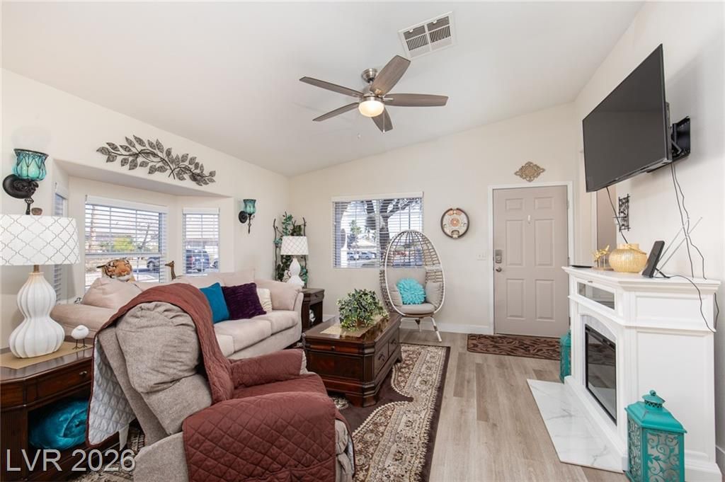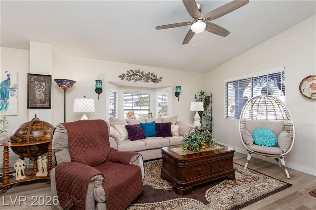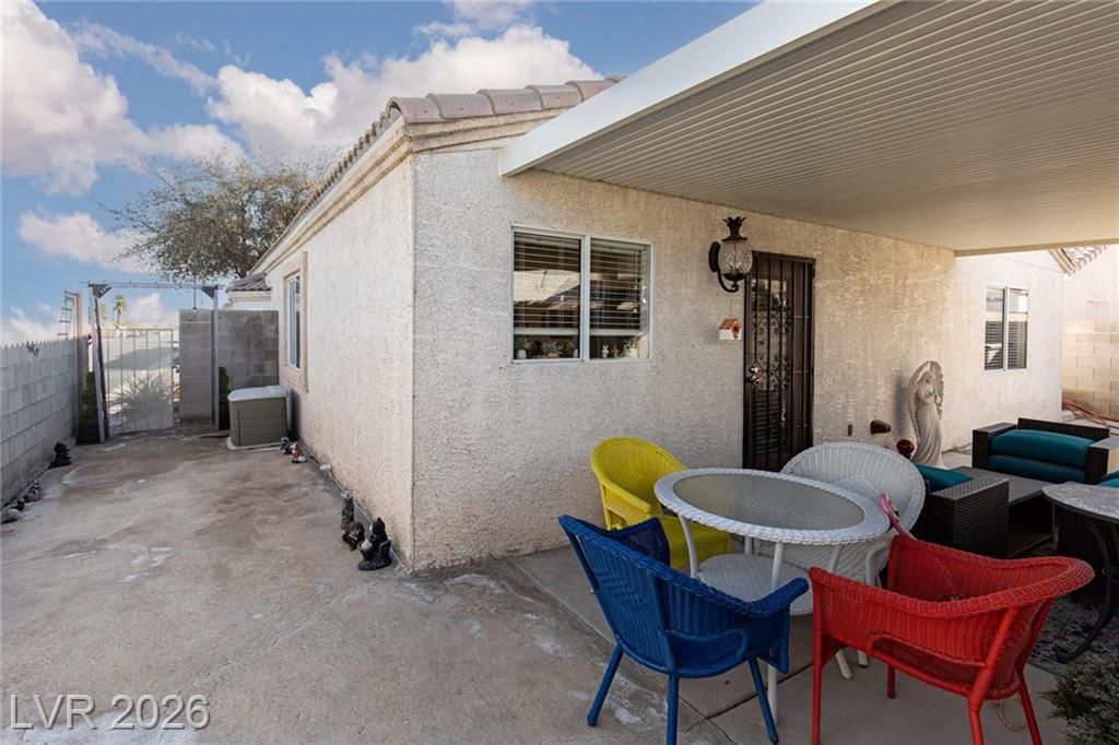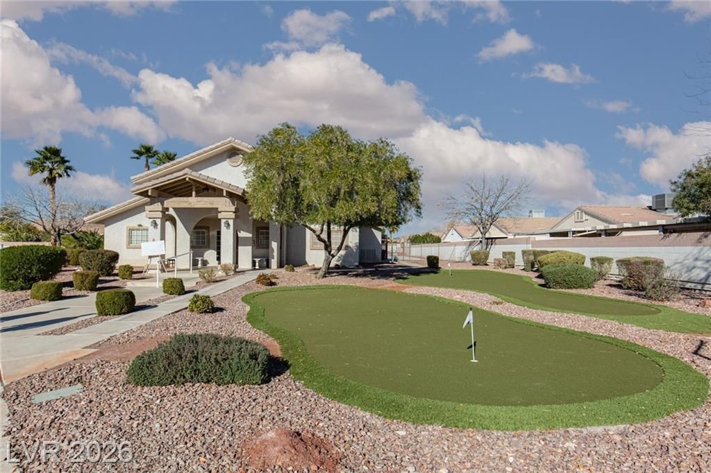 2.75% ASSUMABLE VA LOAN AVAILABLE!! Charming single-family home nestled in a 55+ community in Las Vegas, NV 89122. This well-maintained residence boasts 3 bedrooms, 2 bathrooms, and a favorable layout that spans across a single story. The inviting interior features a modern kitchen with sleek white countertops and stainless-steel appliances, a cozy dining area, and a spacious living room. Natural light floods the home through ample windows, creating a warm and welcoming atmosphere. Outdoors, enjoy a private backyard with a covered patio perfect for relaxing or entertaining guests. Additional amenities include an in-unit laundry room and an attached 2-car garage. Situated in a friendly neighborhood with access to community facilities such as a swimming pool, golf putting green, and more. This home is ideally located close to shopping, dining, and entertainment options. The Wetlands are just around the corner! A perfect blend of comfort and convenience; your Las Vegas sanctuary awaits!