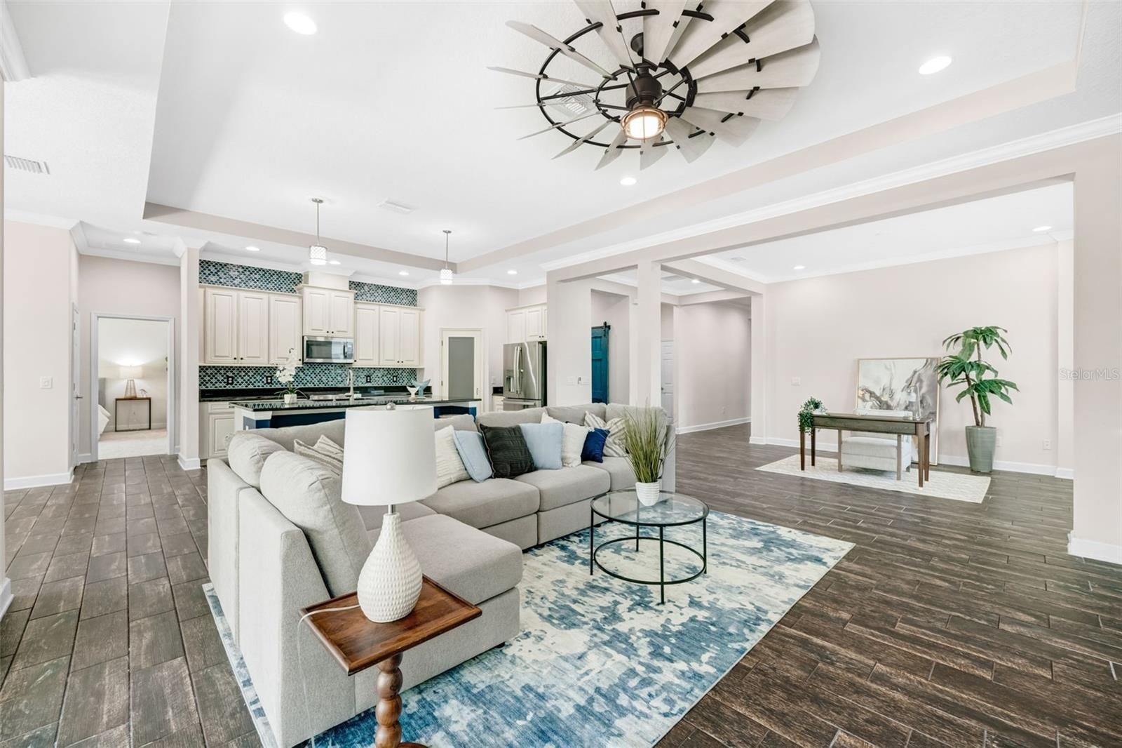 - Ceiling Fan(s), High Ceilings, Kitchen/Family Room Combo, Open Floorplan, Main Level Primary, Stone Counters, Thermostat, Walk-In Closet(s)