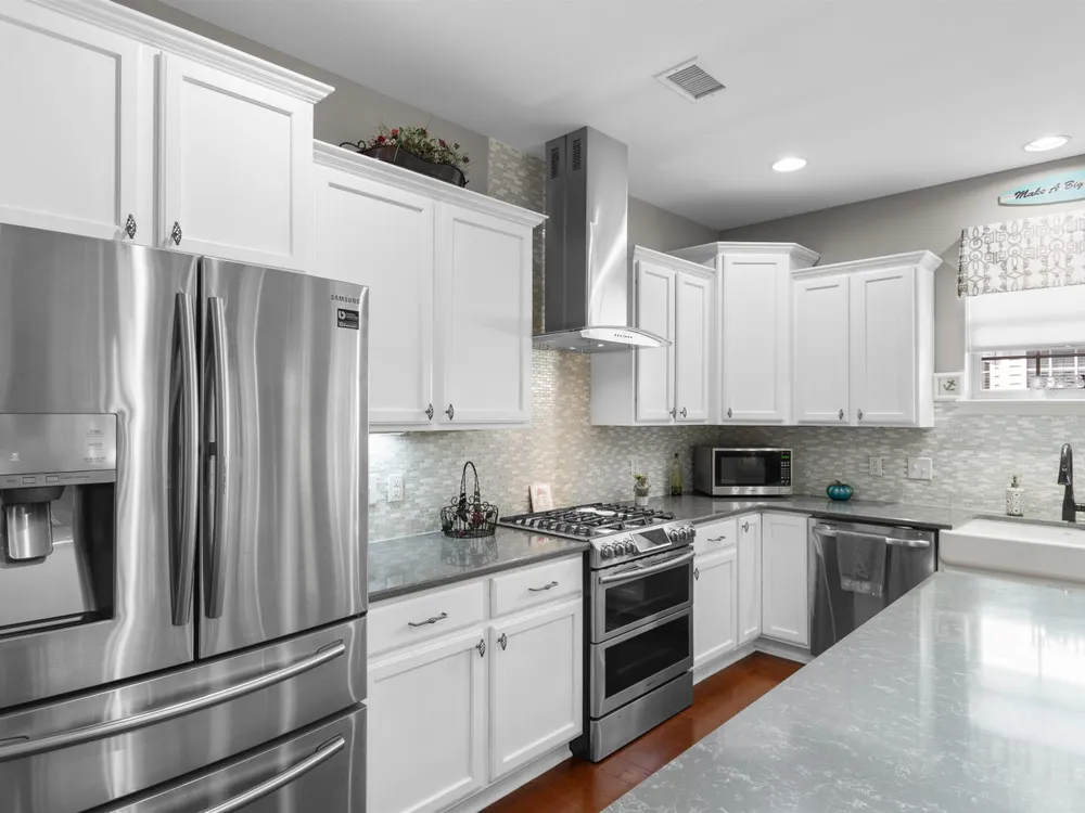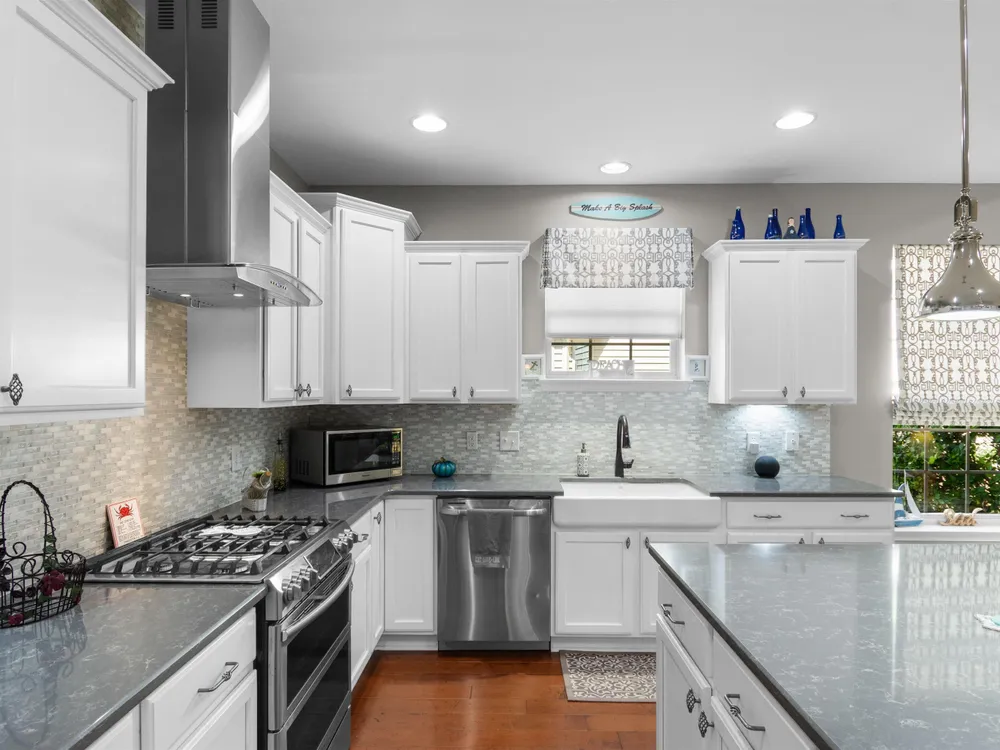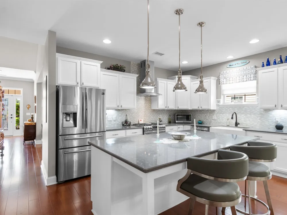 - Breakfast Bar, Kitchen Island, Stainless Steel Appliances, Solid Surface Counters