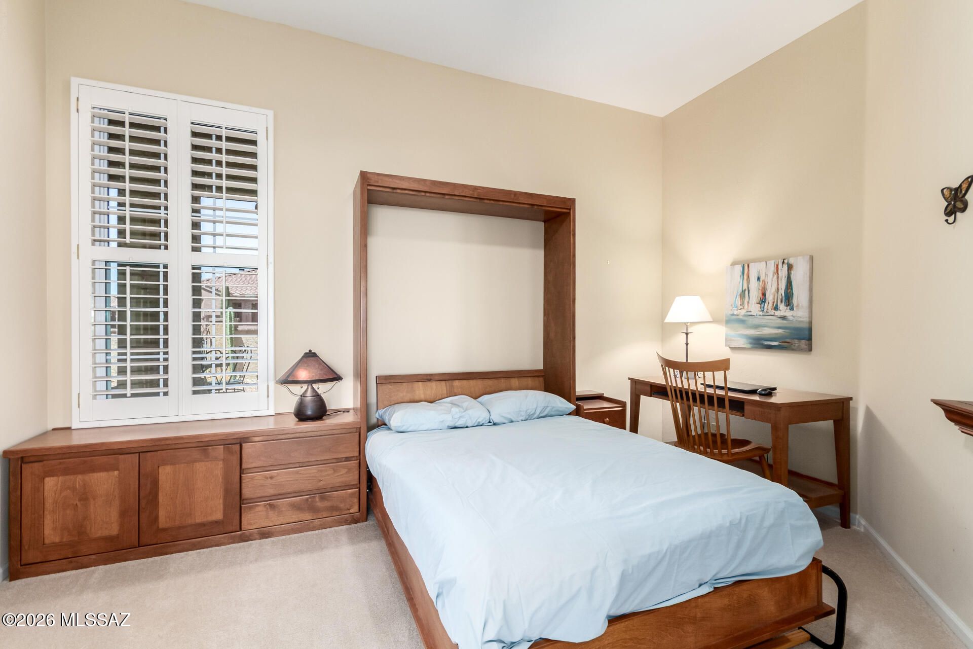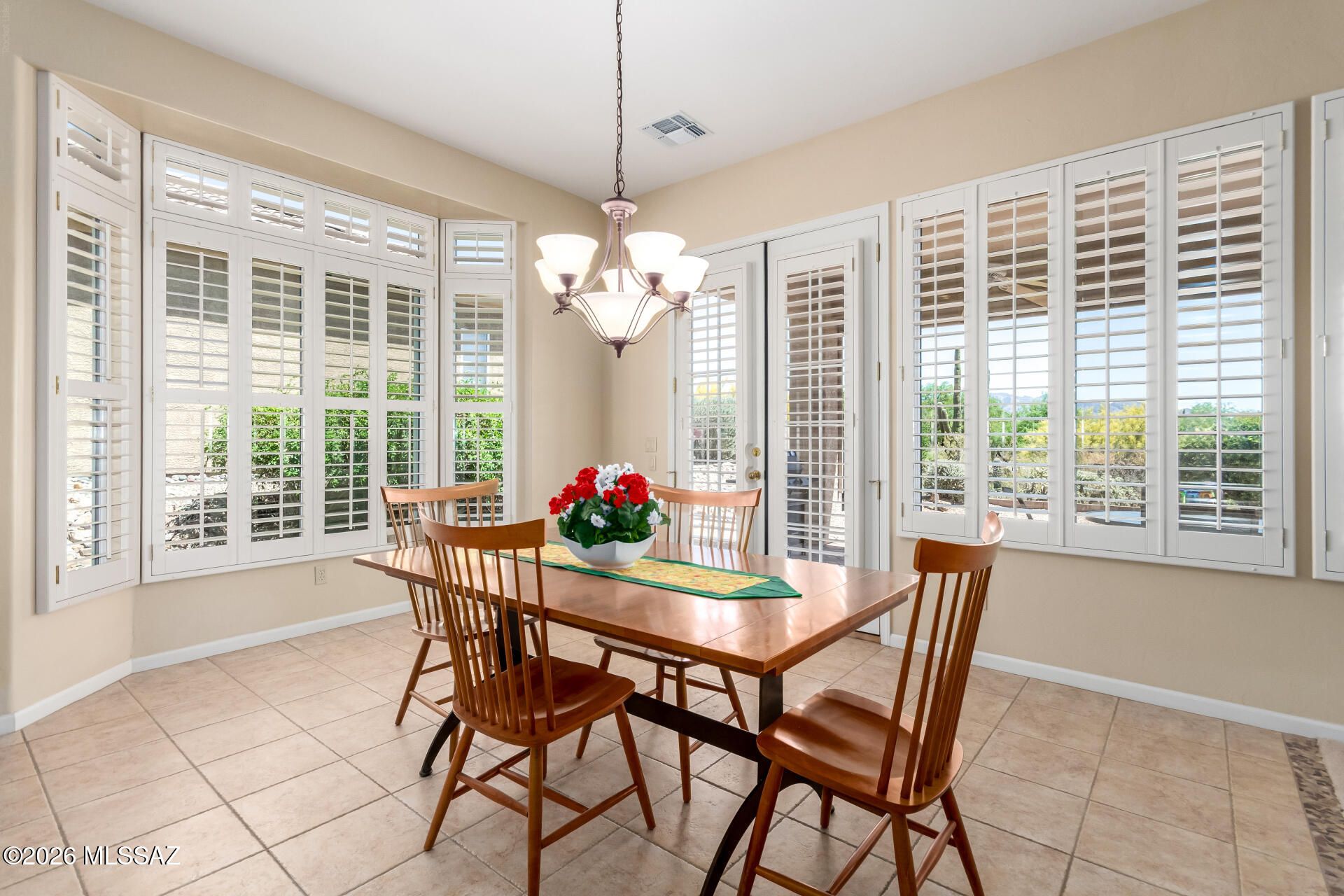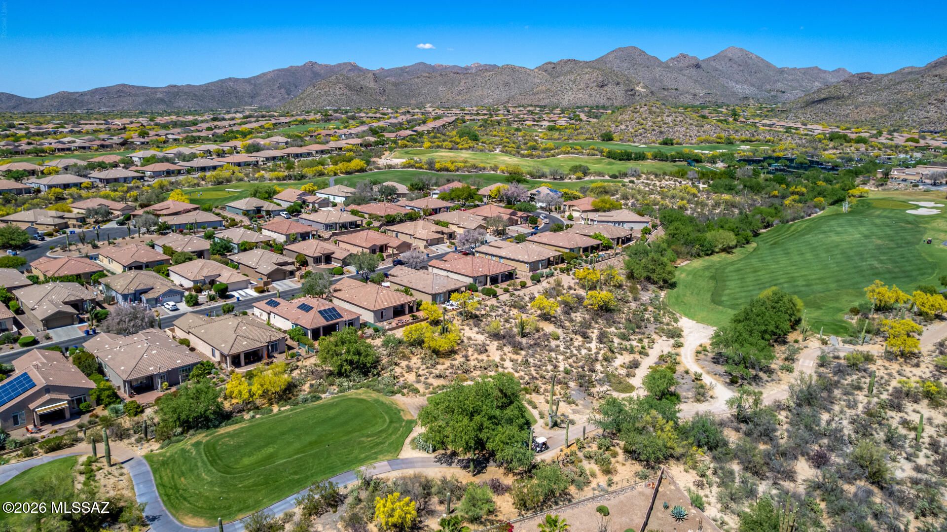 Welcome to this immaculate Santa Rosa home in the prestigious Highlands at Dove Mountain, where breathtaking golf course, city lights, and mountain views greet you every day. Featuring 2 oversized bedrooms, a den with a built-in Murphy bed and a spacious great room with walls of windows dressed in gorgeous plantation shutters that flood the home with natural light. Bay windows in the dining area, primary, and guest bedroom frame the incredible views, while the natural habitat buffer along the 9th Tee provides wonderful privacy. The updated bathrooms, extended laundry room, new Lennox HVAC (2024), newer hot water heater, new irrigation system, and electronic rolling shutters make this home truly move-in ready. Outside, a large front paver courtyard and extended back paver patio offer the