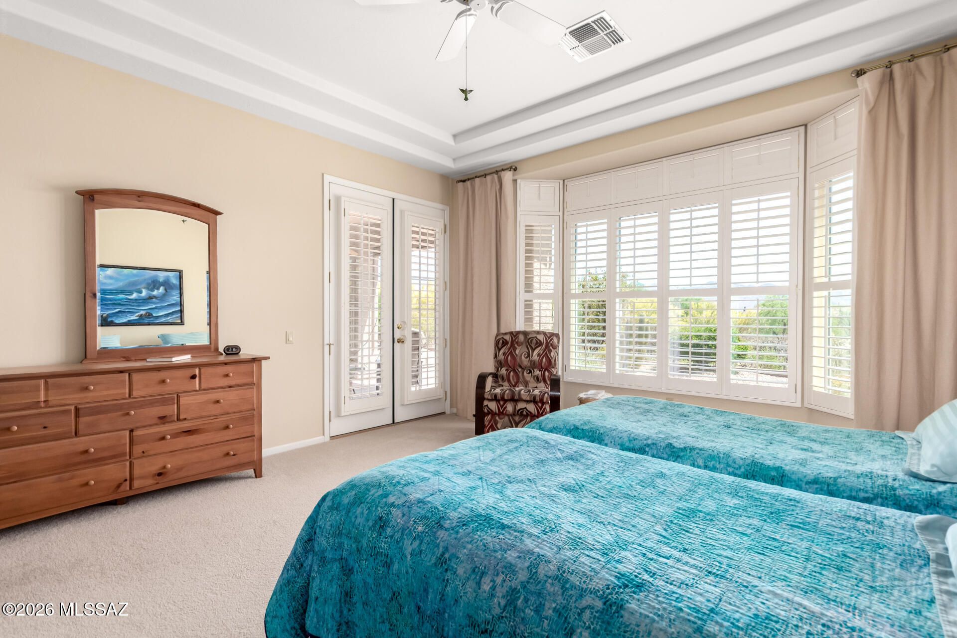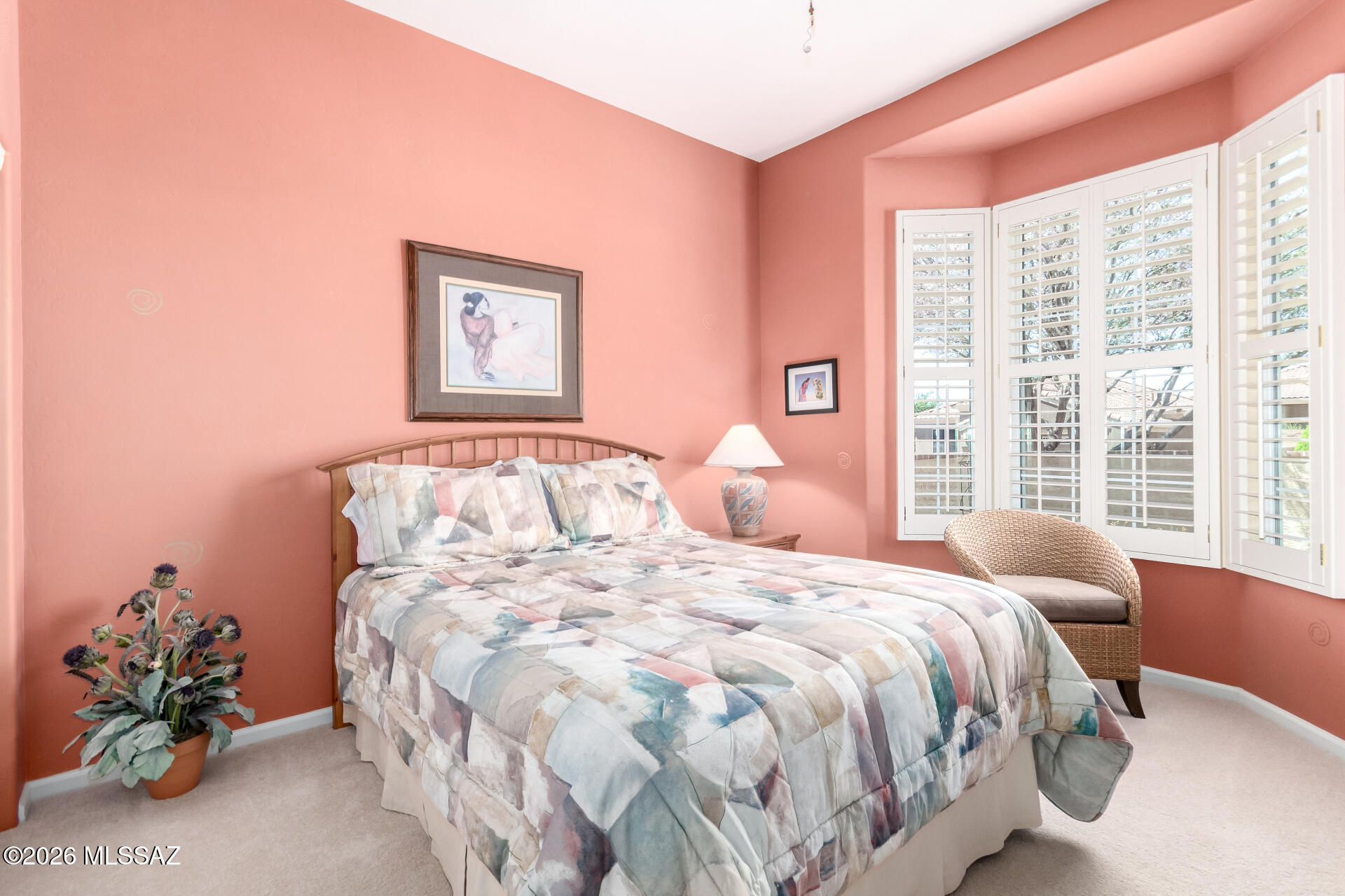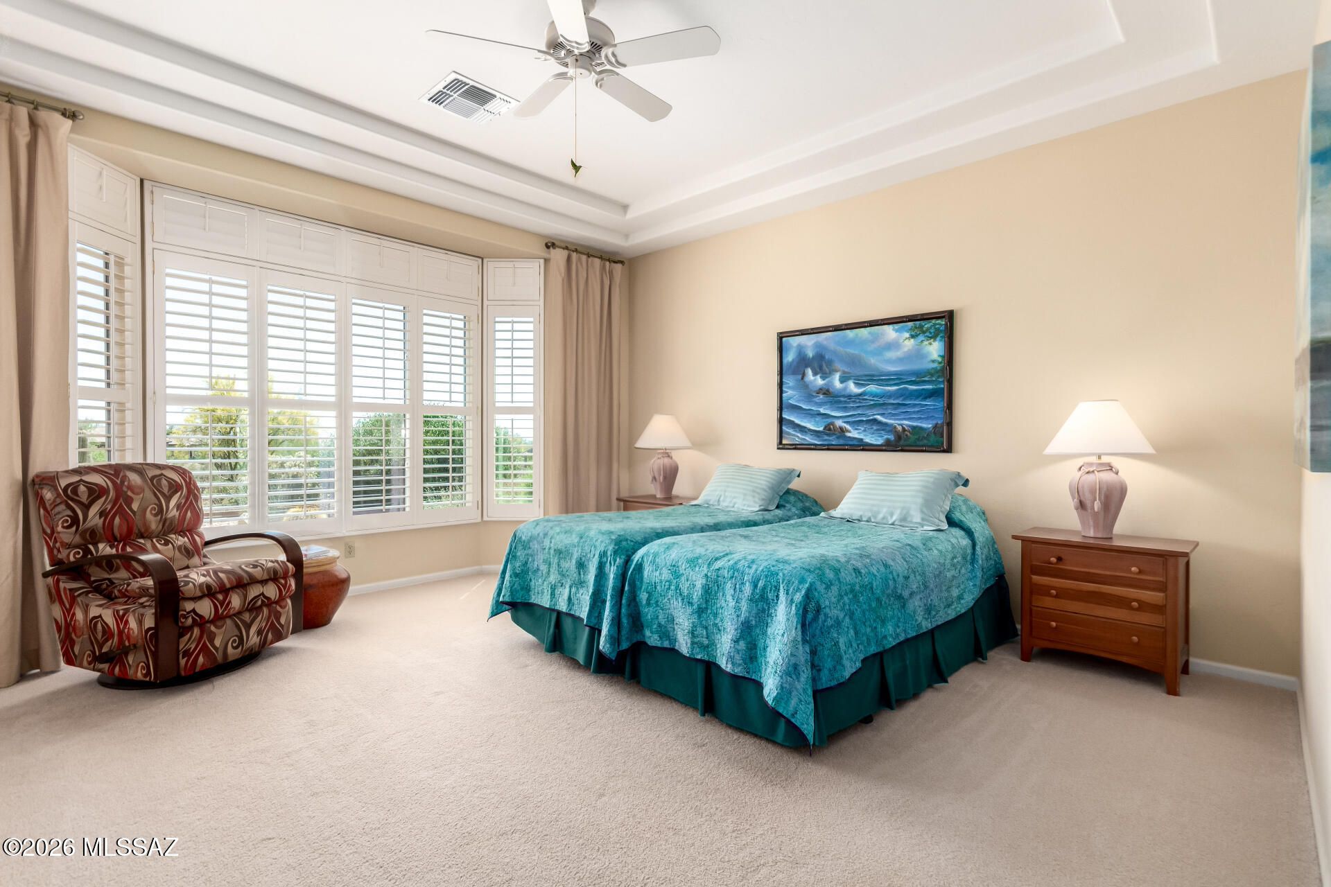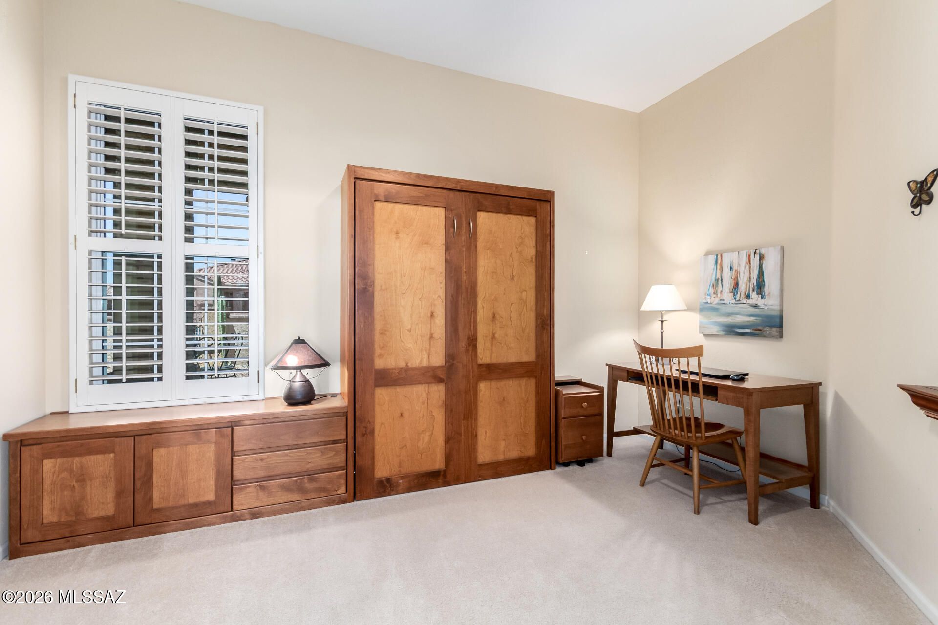 Welcome to this immaculate Santa Rosa home in the prestigious Highlands at Dove Mountain, where breathtaking golf course, city lights, and mountain views greet you every day. Featuring 2 oversized bedrooms, a den with a built-in Murphy bed and a spacious great room with walls of windows dressed in gorgeous plantation shutters that flood the home with natural light. Bay windows in the dining area, primary, and guest bedroom frame the incredible views, while the natural habitat buffer along the 9th Tee provides wonderful privacy. The updated bathrooms, extended laundry room, new Lennox HVAC (2024), newer hot water heater, new irrigation system, and electronic rolling shutters make this home truly move-in ready. Outside, a large front paver courtyard and extended back paver patio offer the