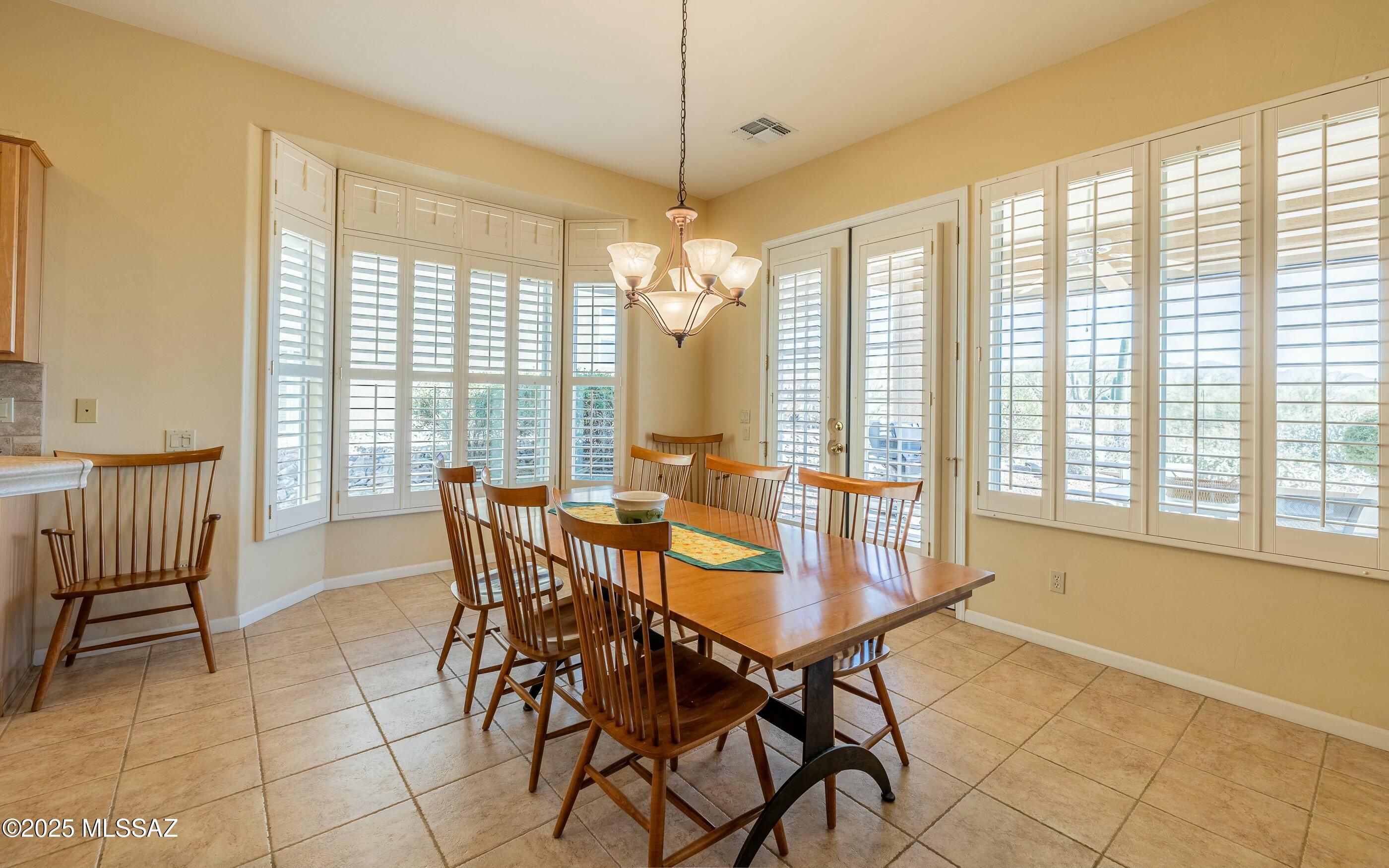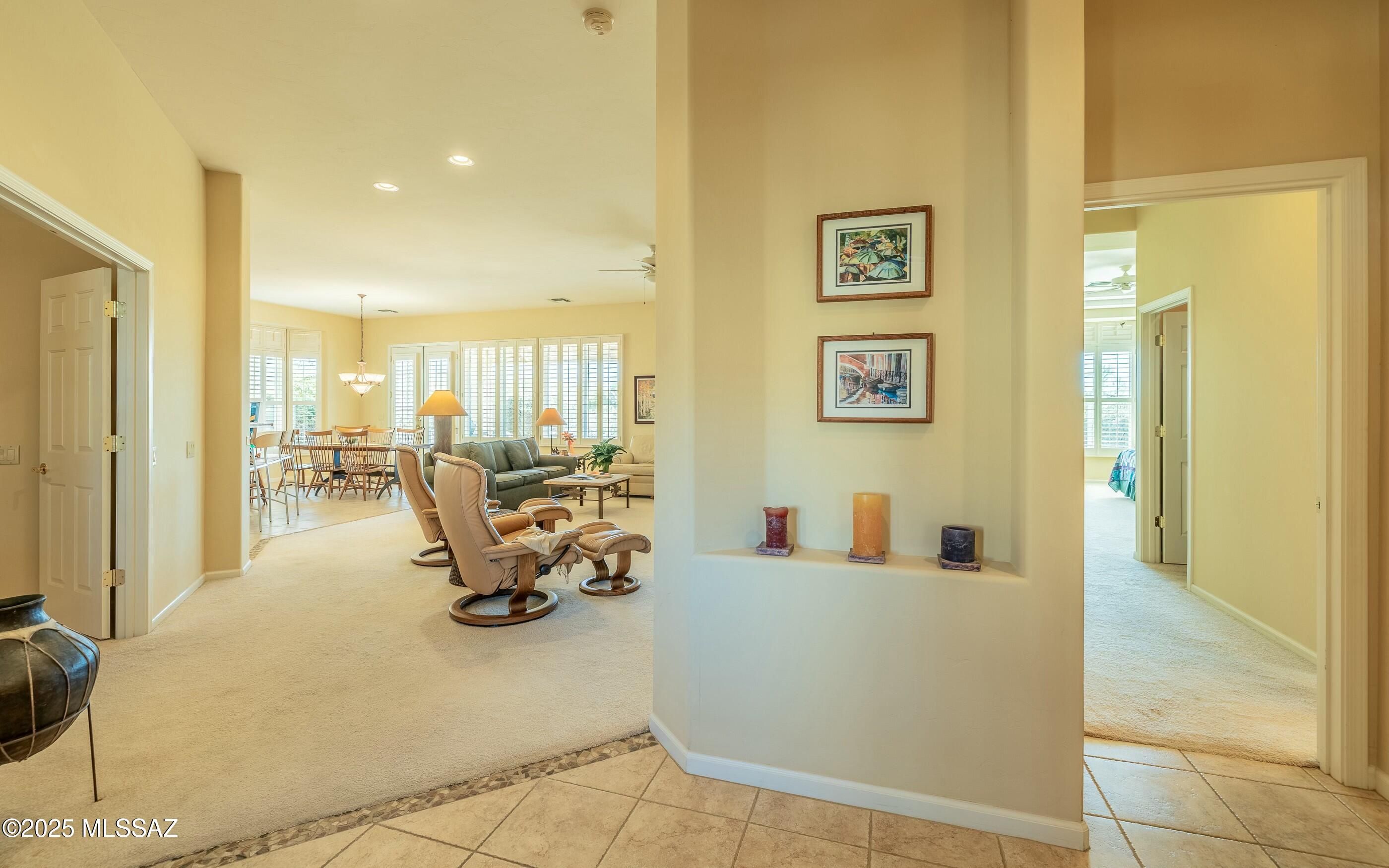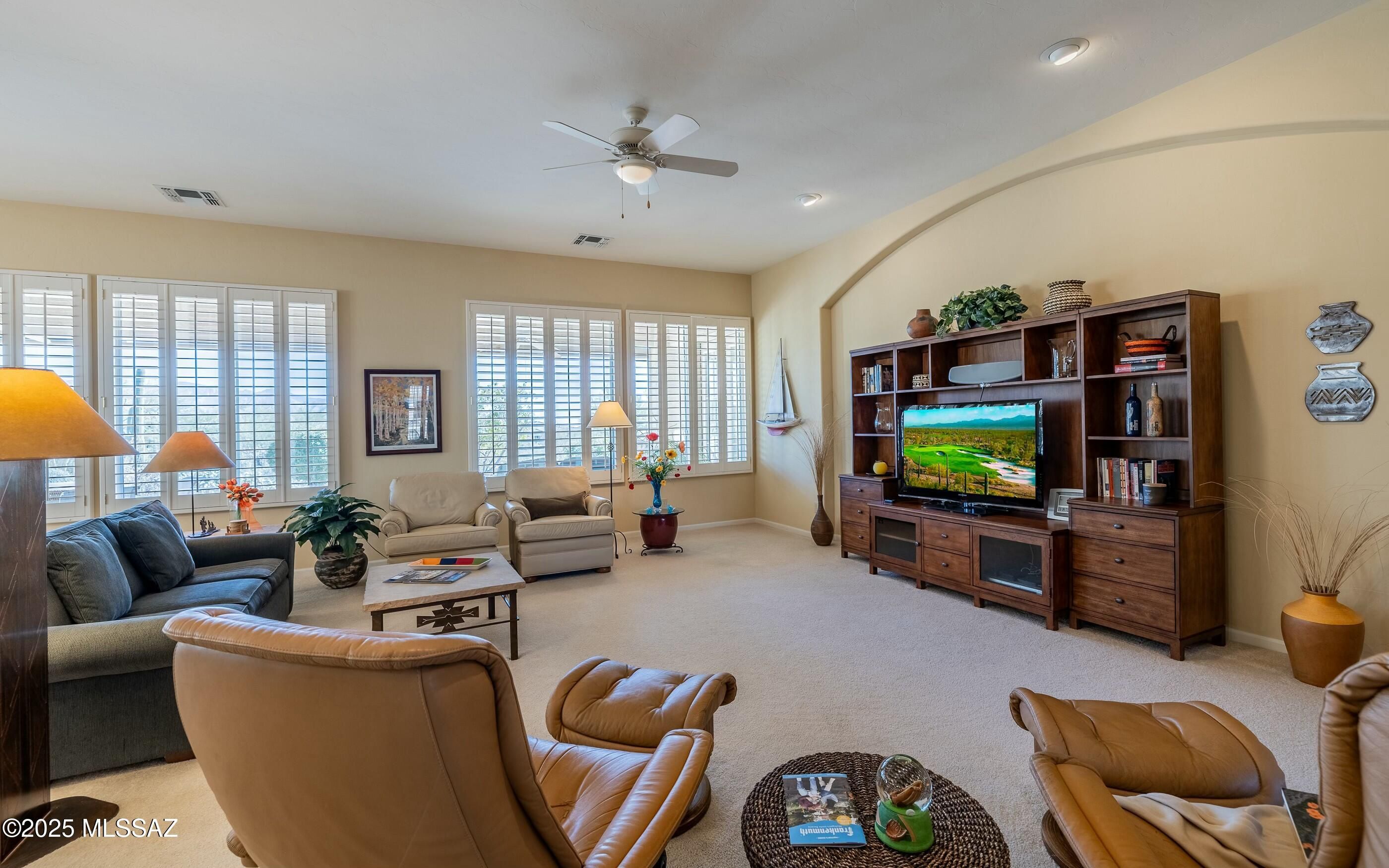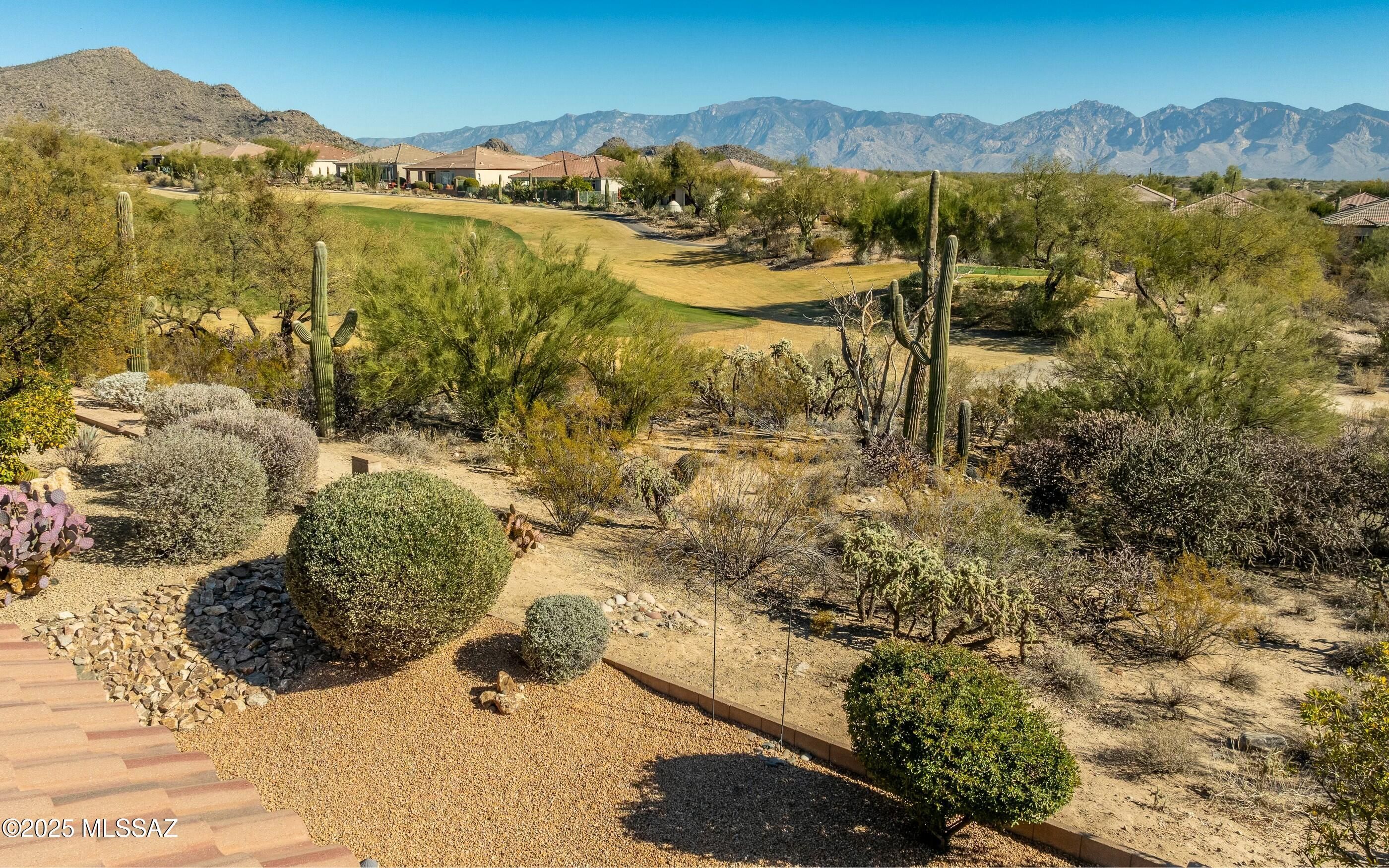 Outstanding golf course property location. Very popular extended Santa Rosa plan. Walls of windows host a wonder of views - natural habitat buffer, 9th Tee views, Catalina & Tortolia Mtn views plus abundant privacy. Interior of home is immaculate. Gorgeous plantation shutters, updated bathrooms. 3 bay windows: kitchen dining area, master & guest bedrooms. New Lennox HVAC installed in 2024. Hot water heater only 2.5 yrs old. Gorgeous plantation shutters. Extended laundry room, and electronic rolling shutters are just a few more fine features of this spectacular Santa Rosa model home. SE facing backyard provides much privacy w/nature abounding. Electronic rear shades are another great plus. Relax and enjoy this very spacious great room concept home.
