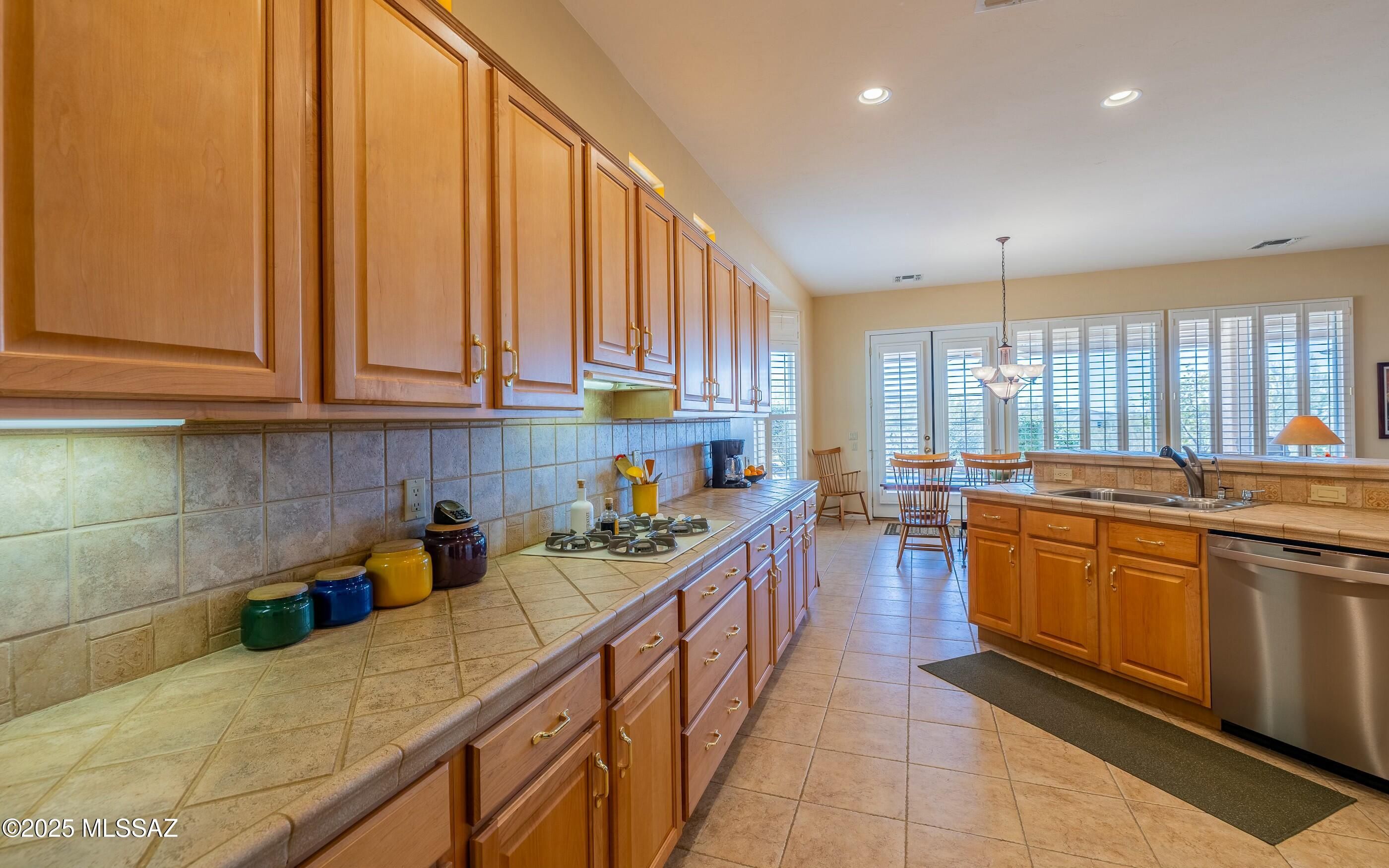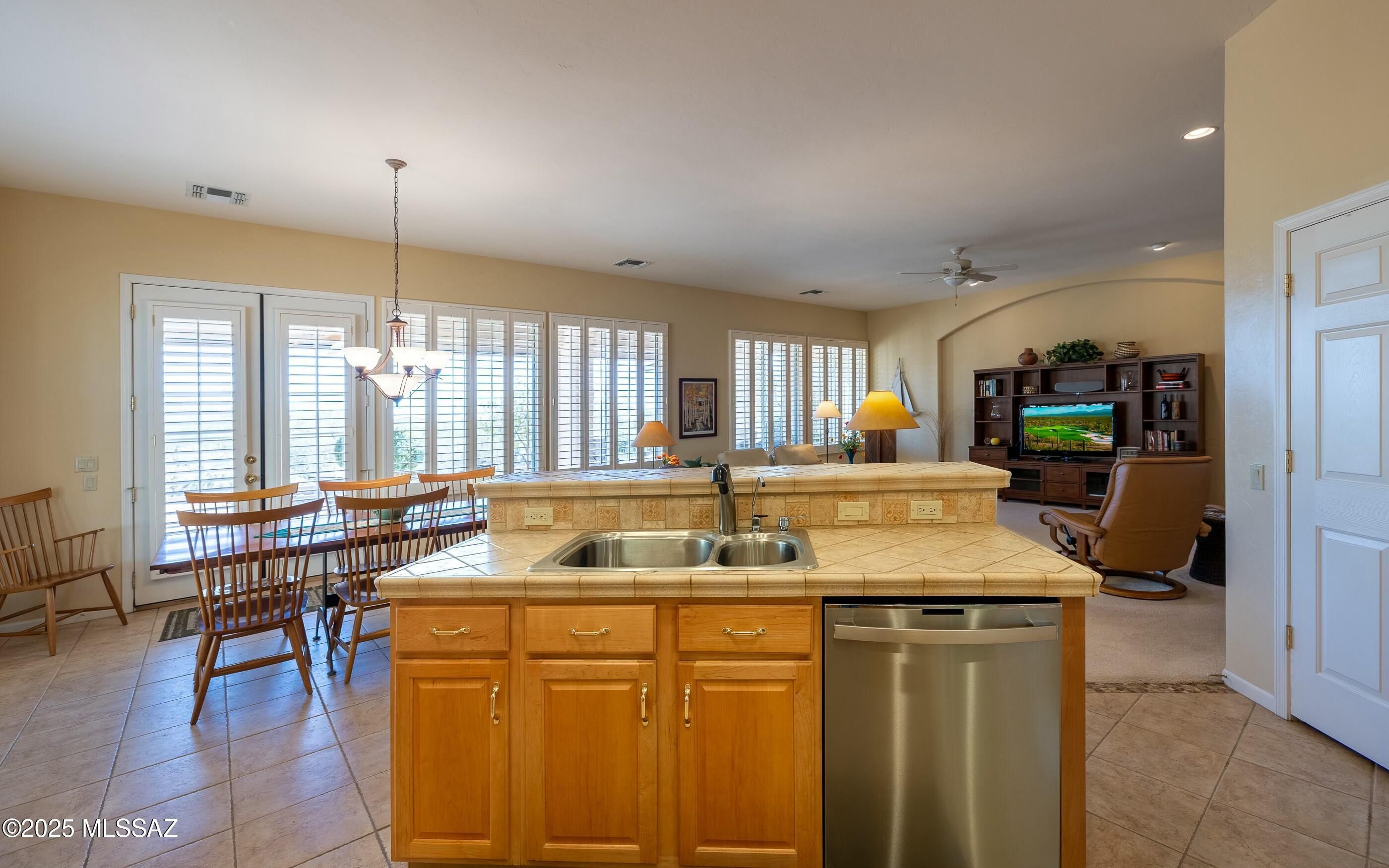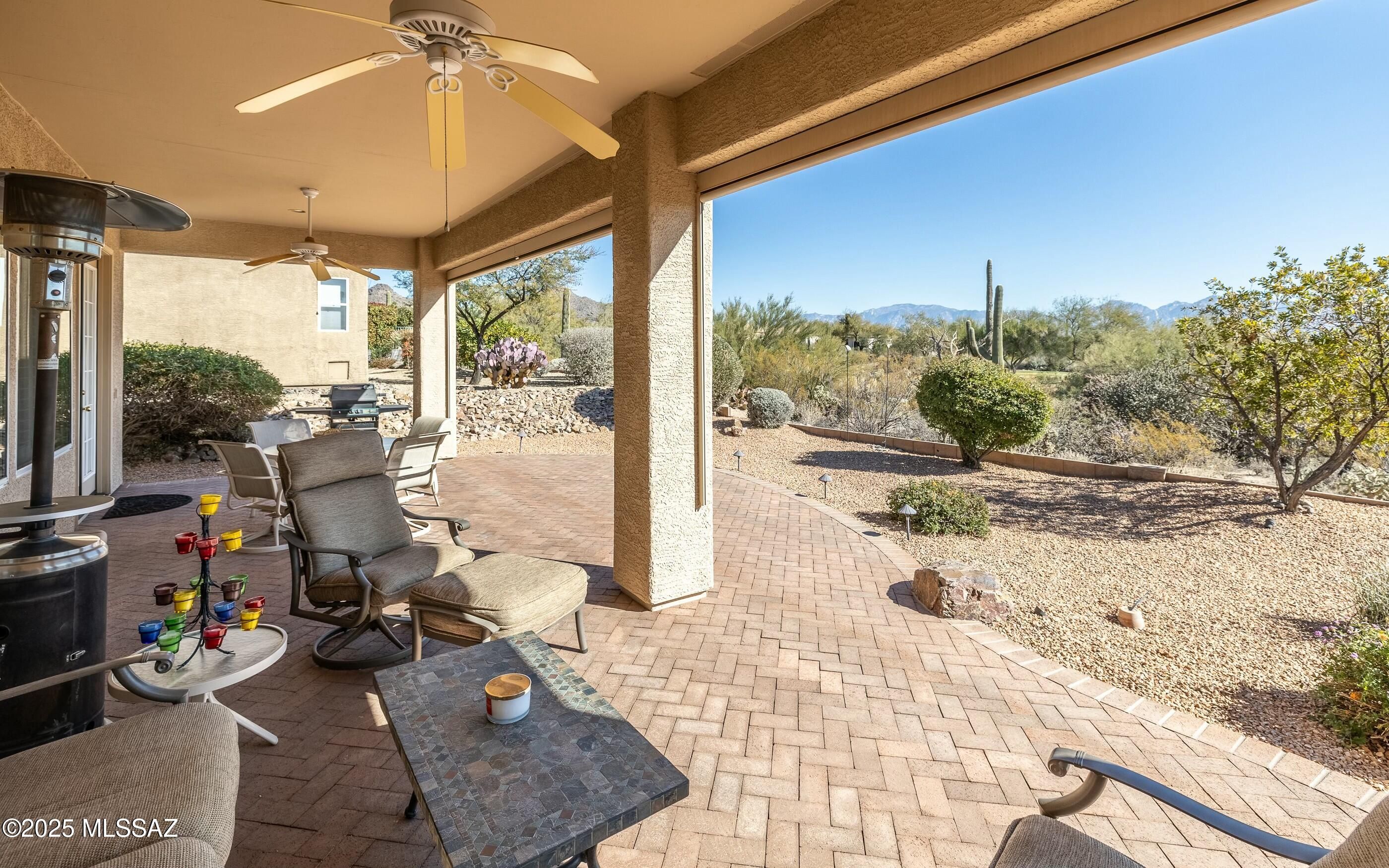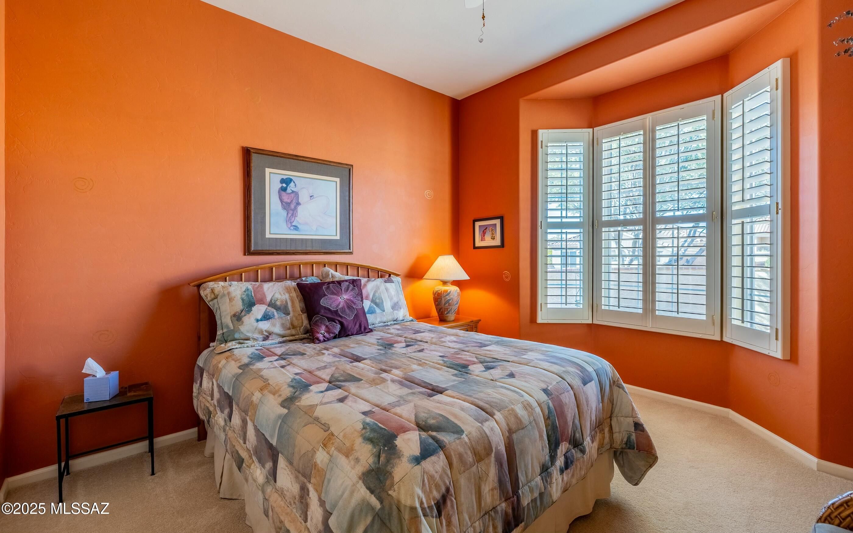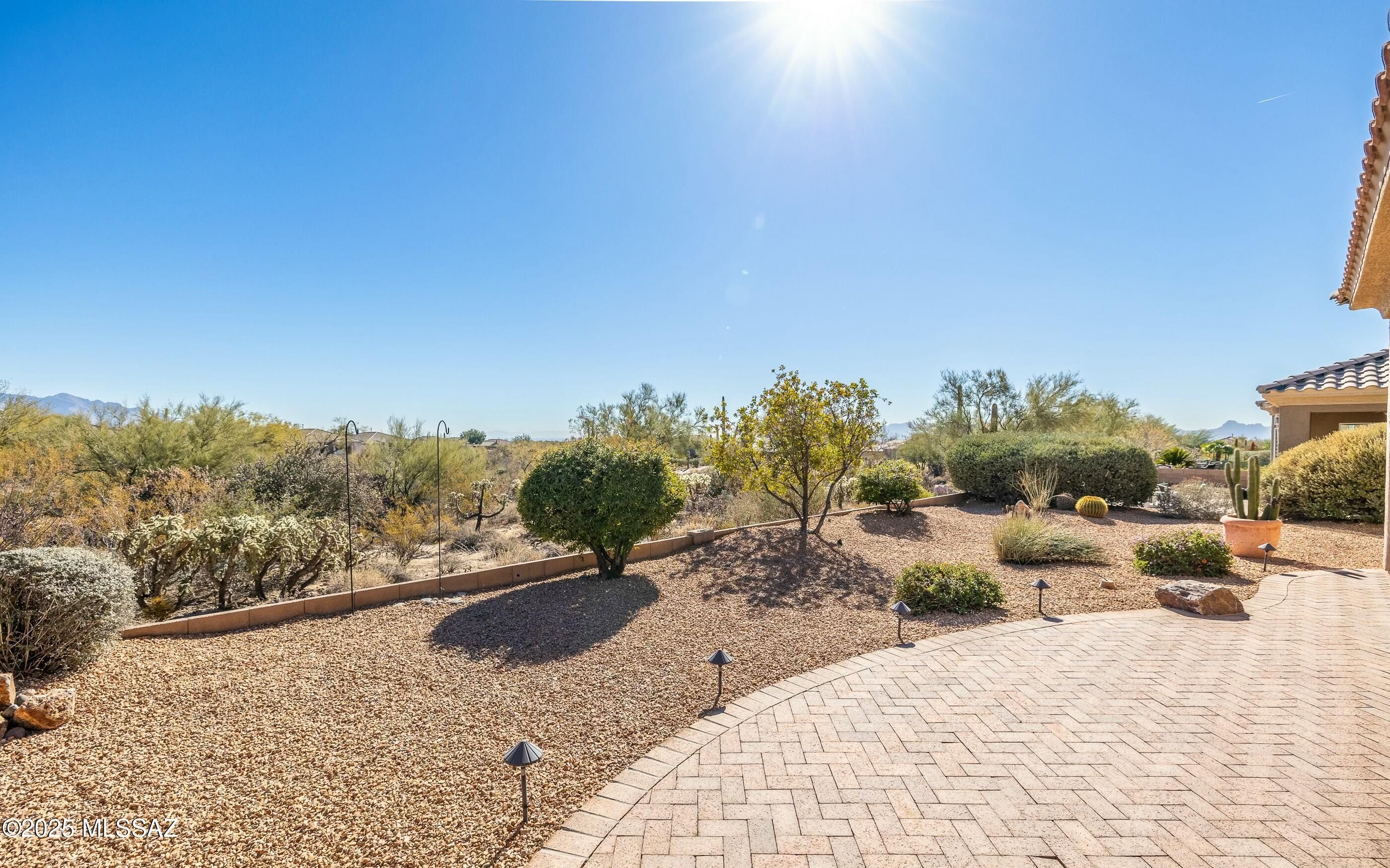 Outstanding golf course property location. Very popular extended Santa Rosa plan. Walls of windows host a wonder of views - natural habitat buffer, 9th Tee views, Catalina & Tortolia Mtn views plus abundant privacy. Interior of home is immaculate. Gorgeous plantation shutters, updated bathrooms. 3 bay windows: kitchen dining area, master & guest bedrooms. New Lennox HVAC installed in 2024. Hot water heater only 2.5 yrs old. Gorgeous plantation shutters. Extended laundry room, and electronic rolling shutters are just a few more fine features of this spectacular Santa Rosa model home. SE facing backyard provides much privacy w/nature abounding. Electronic rear shades are another great plus. Relax and enjoy this very spacious great room concept home.
