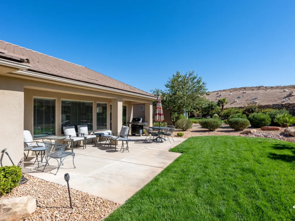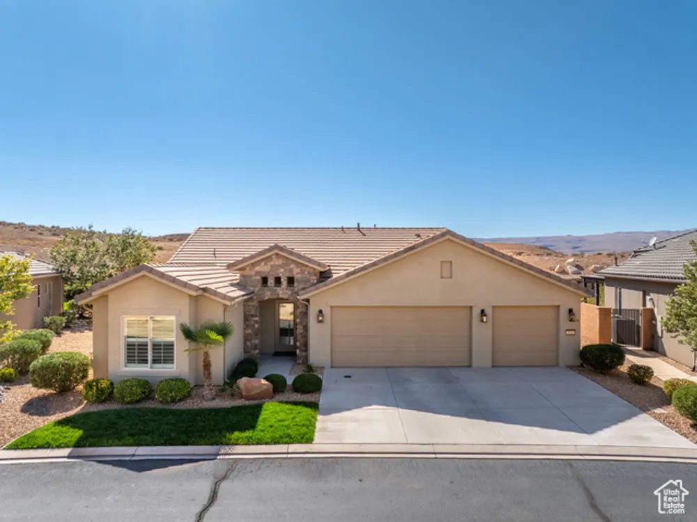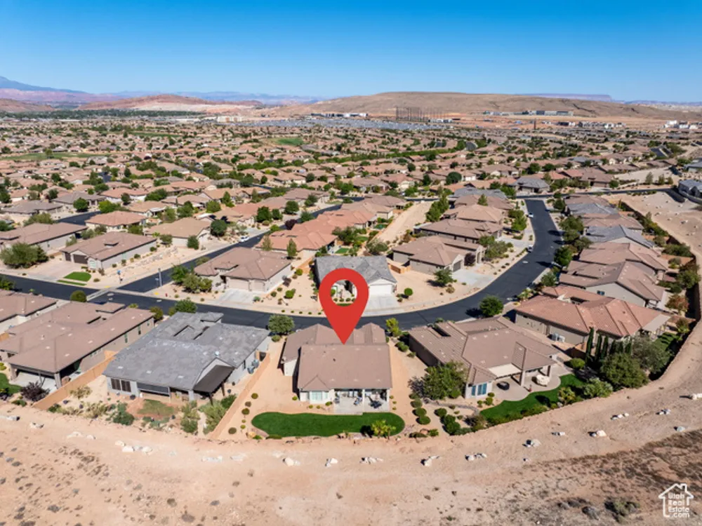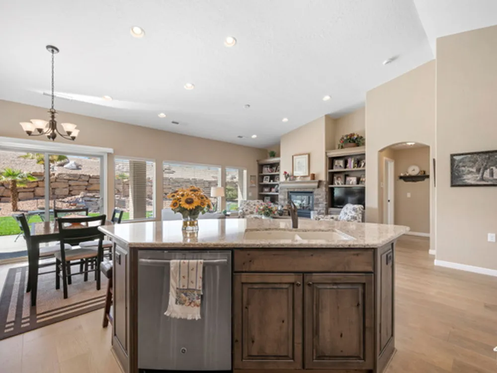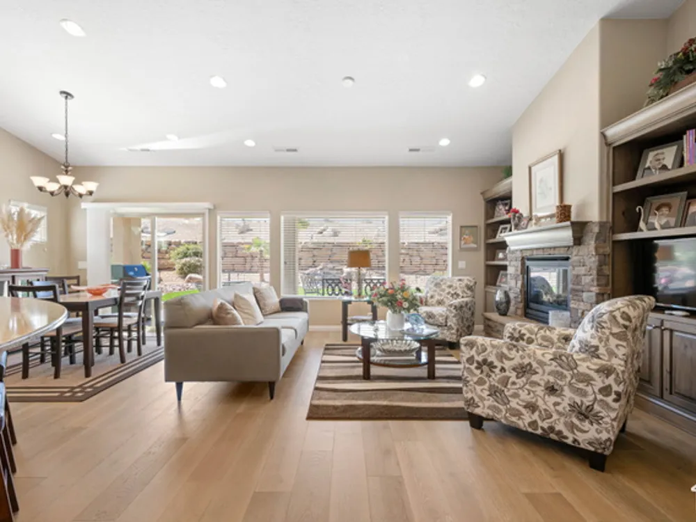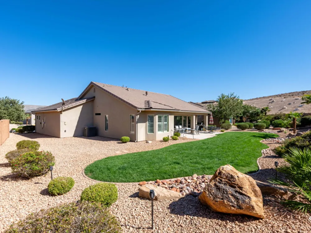 Located on the southern edge of Sun River, this 2-bedroom, 2-bath home with a bonus office combines timeless finishes with modern convenience. A rare find, it features an open floor plan, hardwood floors, quartz countertops, built-in office desk, gas fireplace, and a spacious 3-car garage. Enjoy the privacy of no rear neighbors and endless desert right out your back door. Sun River is Southern Utah's award-winning 55+ community, offering an 18-hole championship golf course, indoor and outdoor pools, pickleball and tennis courts, and more than 80 clubs and groups to join. Set among peaceful, well-kept streets, it's the perfect neighborhood crafted for an active retired lifestyle.