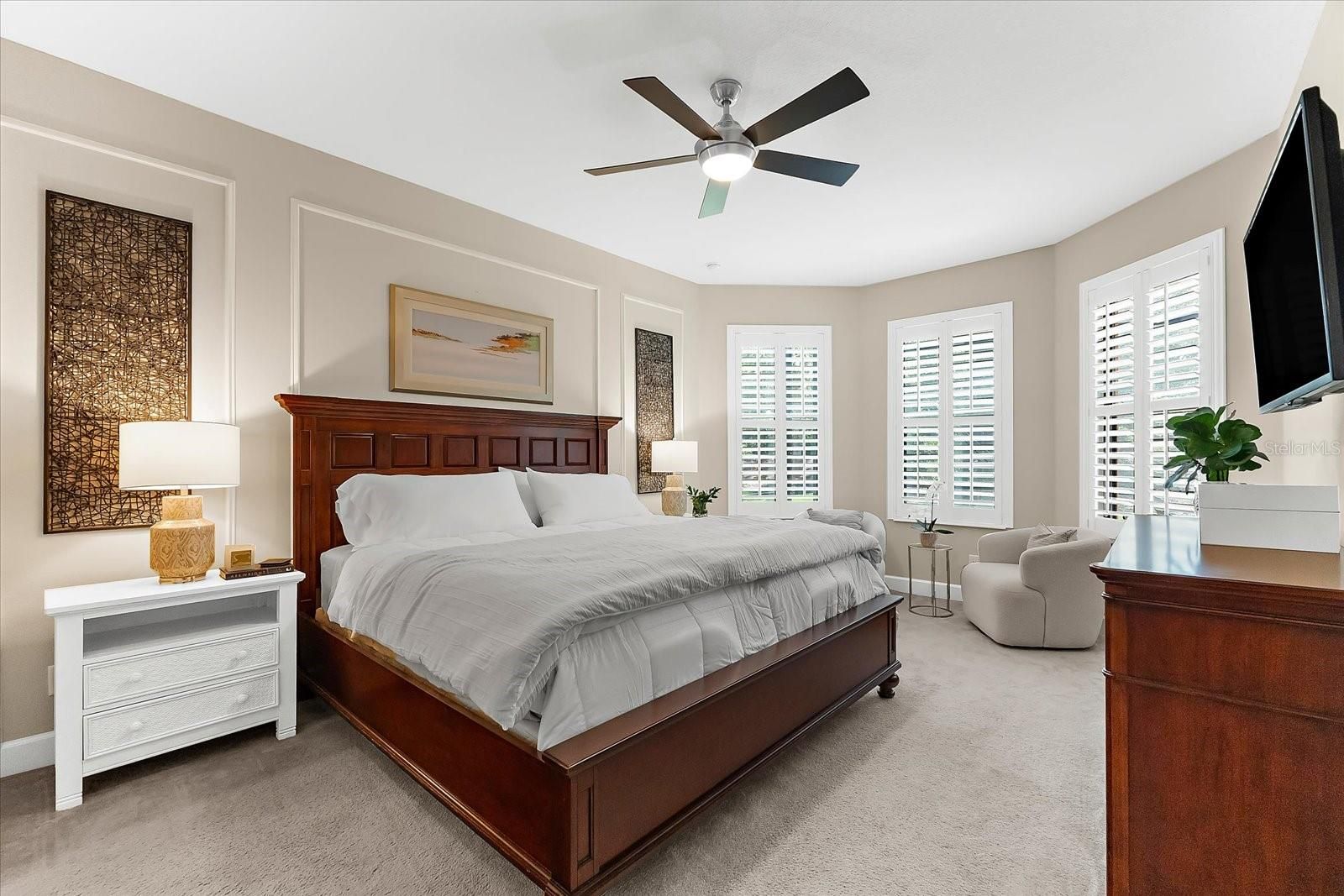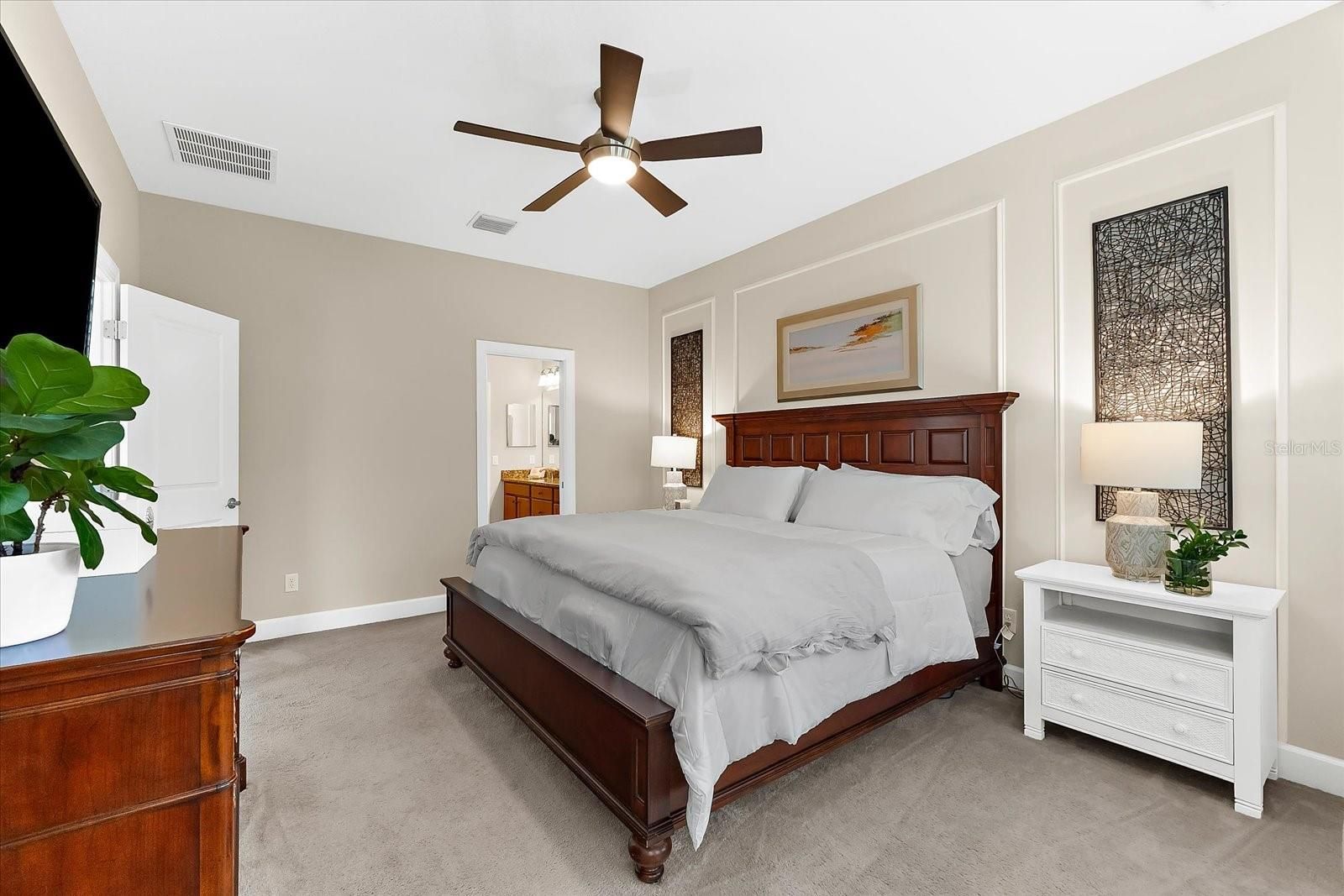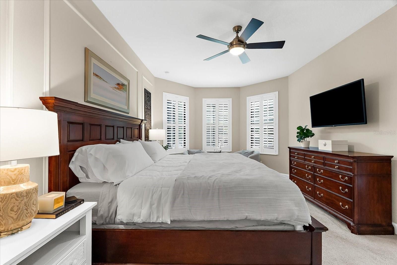 - Ceiling Fan(s), Crown Molding, Eat-in Kitchen, High Ceilings, Open Floorplan, Main Level Primary, Solid-Wood Cabinets, Split Bedrooms, Stone Counters, Thermostat, Walk-In Closet(s), Window Treatments