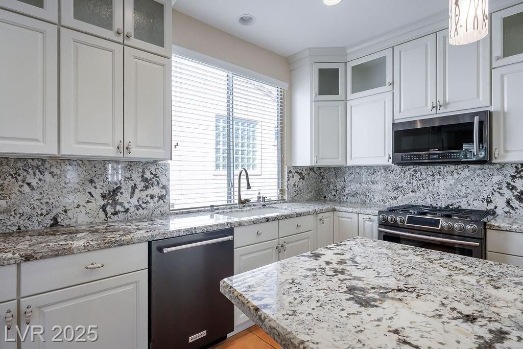 Sensational 1 story home located in the sought-after, guard gated and age restricted community of Siena HOA. This home showcases a grand courtyard entry, double entry doors, a modern kitchen with white shaker cabinetry, black stainless-steel appliances, a gas stove, expansive island, upscale granite countertops and complimentary backsplash, a spacious great room, segregated dining room, expansive den/office and formal living room. This home is spotlessly clean and meticulously maintained! The backyard has a covered patio and a well-equipped outdoor kitchen and low maintenance landscaping throughout the property. Located just minutes away from numerous casinos, highway access, entertainment, shopping and a plethora of renowned restaurants. **This HOA is age restricted and is specifically catered toward 55+ occupants** Inside the gates, there is a large assortment of activities, entertainment, a golf course and restaurant.