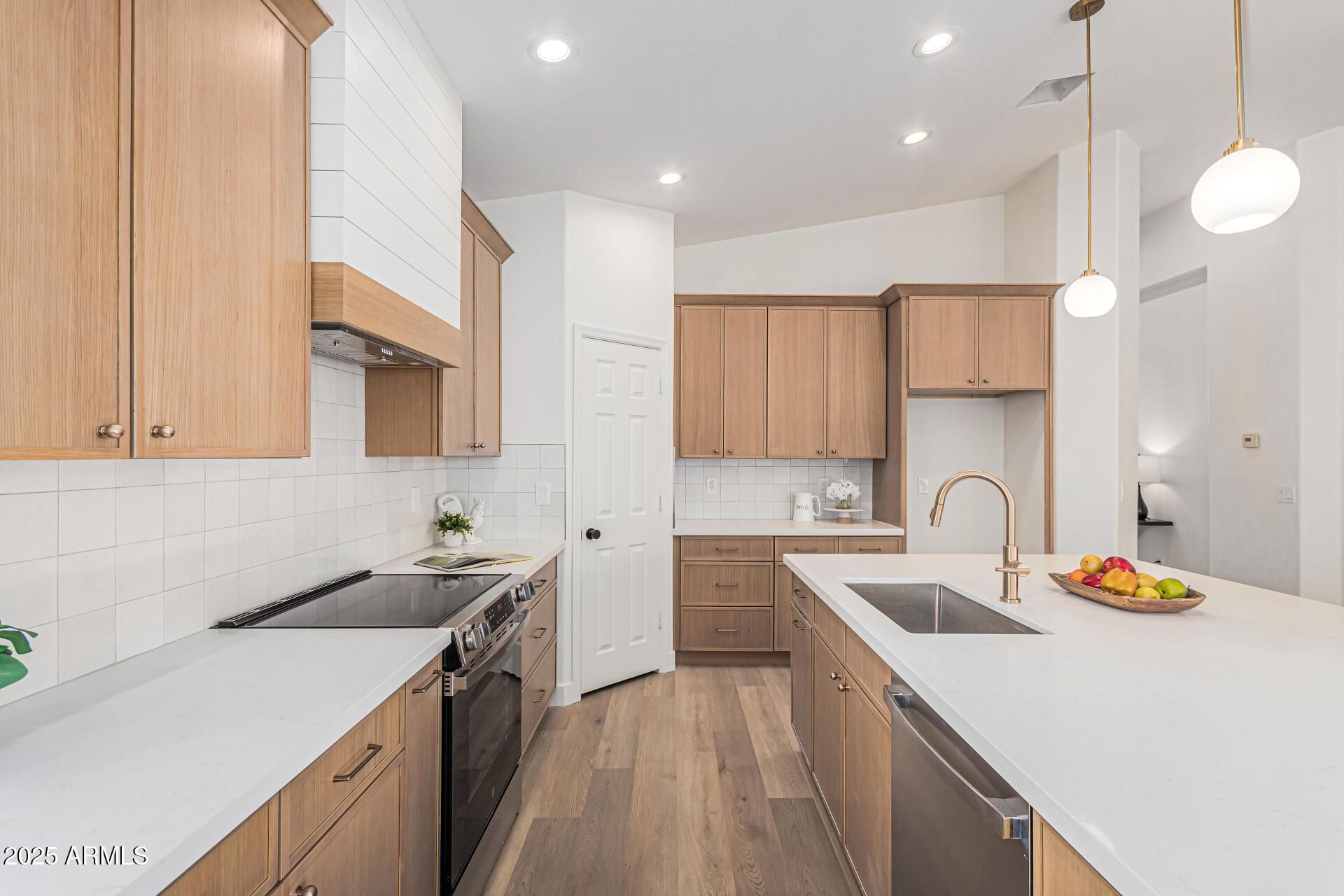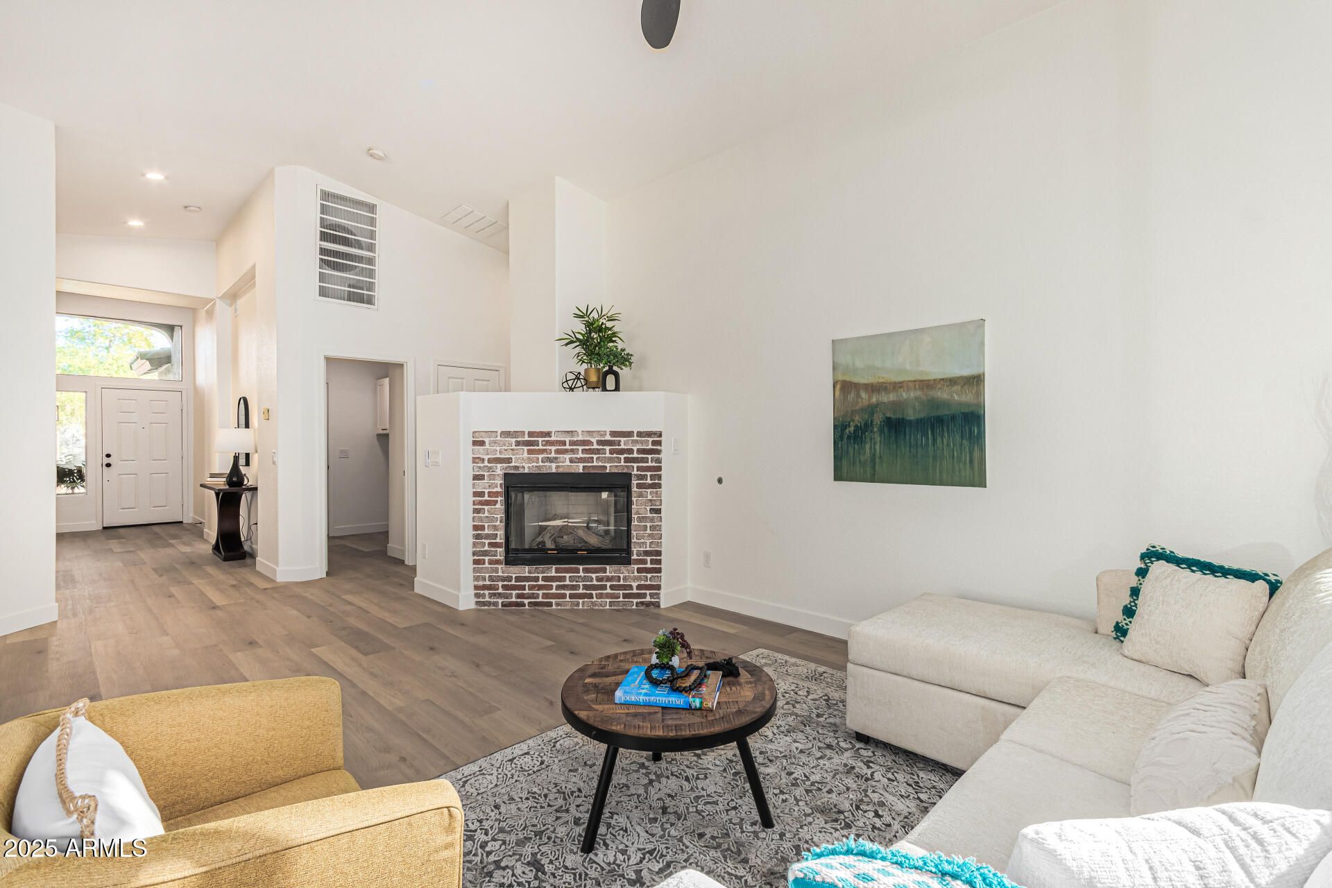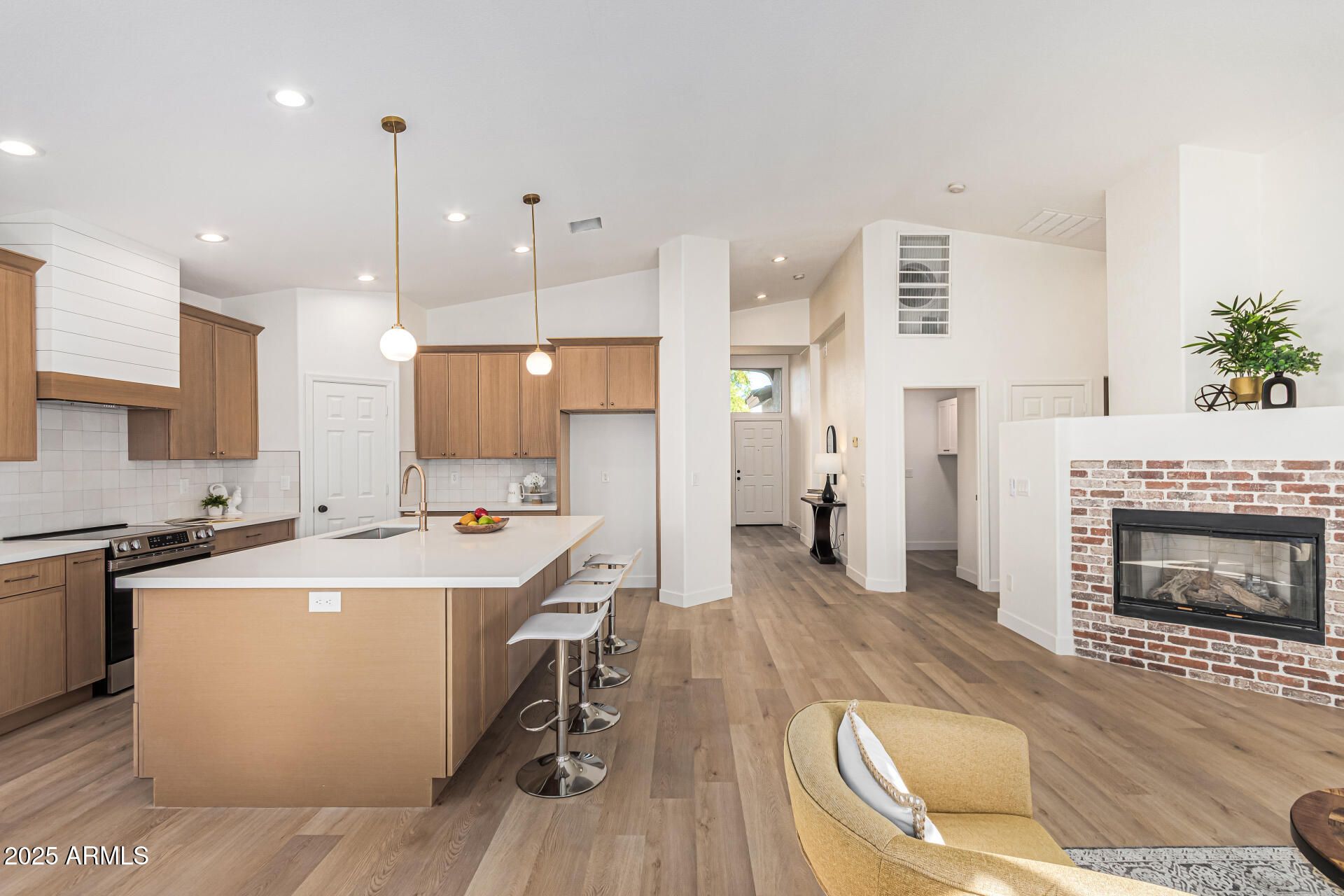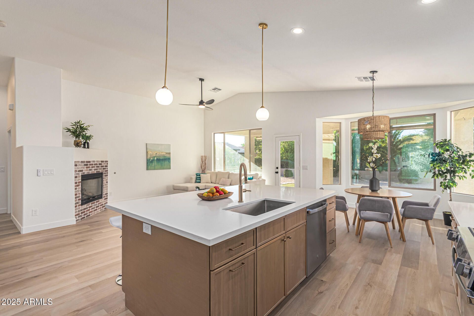 Discover this beautifully updated 3-bedroom, 2-bath home, perfectly situated on a quiet cul-de-sac within the guard-gated Trilogy at Power Ranch community in Gilbert. Renovated with modern finishes throughout, this turnkey residence offers a refined living experience surrounded by natural beauty and resort-style comfort. Step inside to an inviting open layout featuring new flooring, refreshed lighting, and a redesigned kitchen with contemporary cabinetry, quartz countertops, stainless steel appliances and generous workspace. A cozy gas fireplace anchors the living area, adding warmth and charm to the home's welcoming atmosphere. The private primary suite provides a serene retreat with a dual-sink vanity, relaxing garden tub, spacious walk-in shower, and a large walk-in closet. Two additional bedrooms and an updated second bath offer flexibility for guests, hobbies, or a home office. Step outside to enjoy a pleasant covered patio and tranquil backyard designed with low-maintenance landscaping, offering the ideal setting for morning coffee, afternoon shade, or peaceful evening relaxation. Additional features include a soft water loop for enhanced convenience. Trilogy's exceptional setting places you moments from the San Tan Mountains, vibrant dining, and convenient shopping, while offering the tranquility of a gated, age-restricted community. Residents enjoy a welcoming clubhouse, resort-style pools and spa, sports courts, a fully equipped fitness center, and a wide range of clubs, classes, and creative activities that encourage connection and engagement. This beautifully updated home combines modern comfort with the elegance and convenience of a premier resort-style neighborhoodan ideal retreat for those seeking quality, community, and a refined Arizona lifestyle.