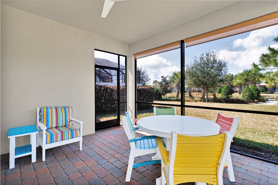 This meticulous 2-bedroom, 2 bath villa comes with an office/den that includes a Murphy bed with built in cabinets, a separate laundry room, and a 2-car garage. All impact glass and a TAEXX in-wall pest control system make for care-free living. Relax in the extended screened porch and enjoy tranquil views of the green space and pond. Partial house generator! Lakes of Waterway is a private, gated community with resort-style amenities including clubhouse, pool, tennis, pickleball and fitness center for an active lifestyle.