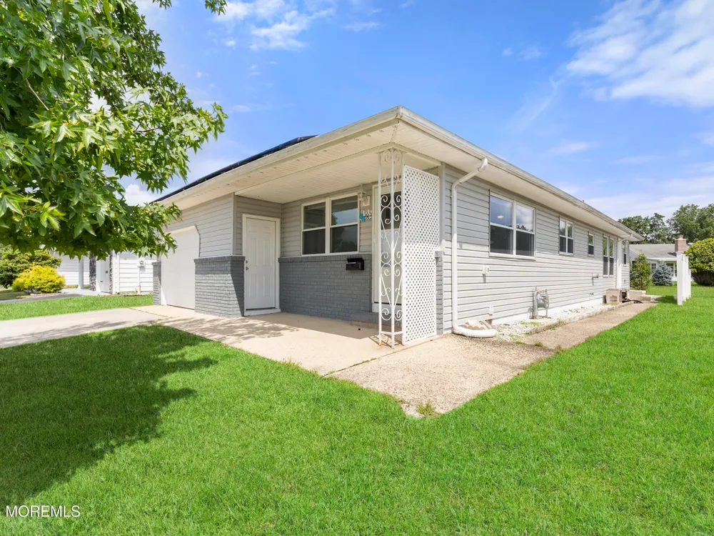 Rare Opportunity in Holiday City Berkeley - 3 Bedroom, 2 Full Bath Home. This beautifully maintained home offers excellent curb appeal, featuring manicured landscaping, vinyl and brick siding, and a welcoming front porch with convenient access to the one-car attached garage. Step inside to a spacious living and formal dining room combination. The kitchen is equipped with stone countertops, a center island, laminate flooring, a dedicated eat-in area, and stainless steel appliances. The generous primary bedroom includes a en-suite bathroom and private entrance. Additional highlights include a private rear patio with an awning, partial fencing, and mature trees for added privacy. This is an AS IS property.