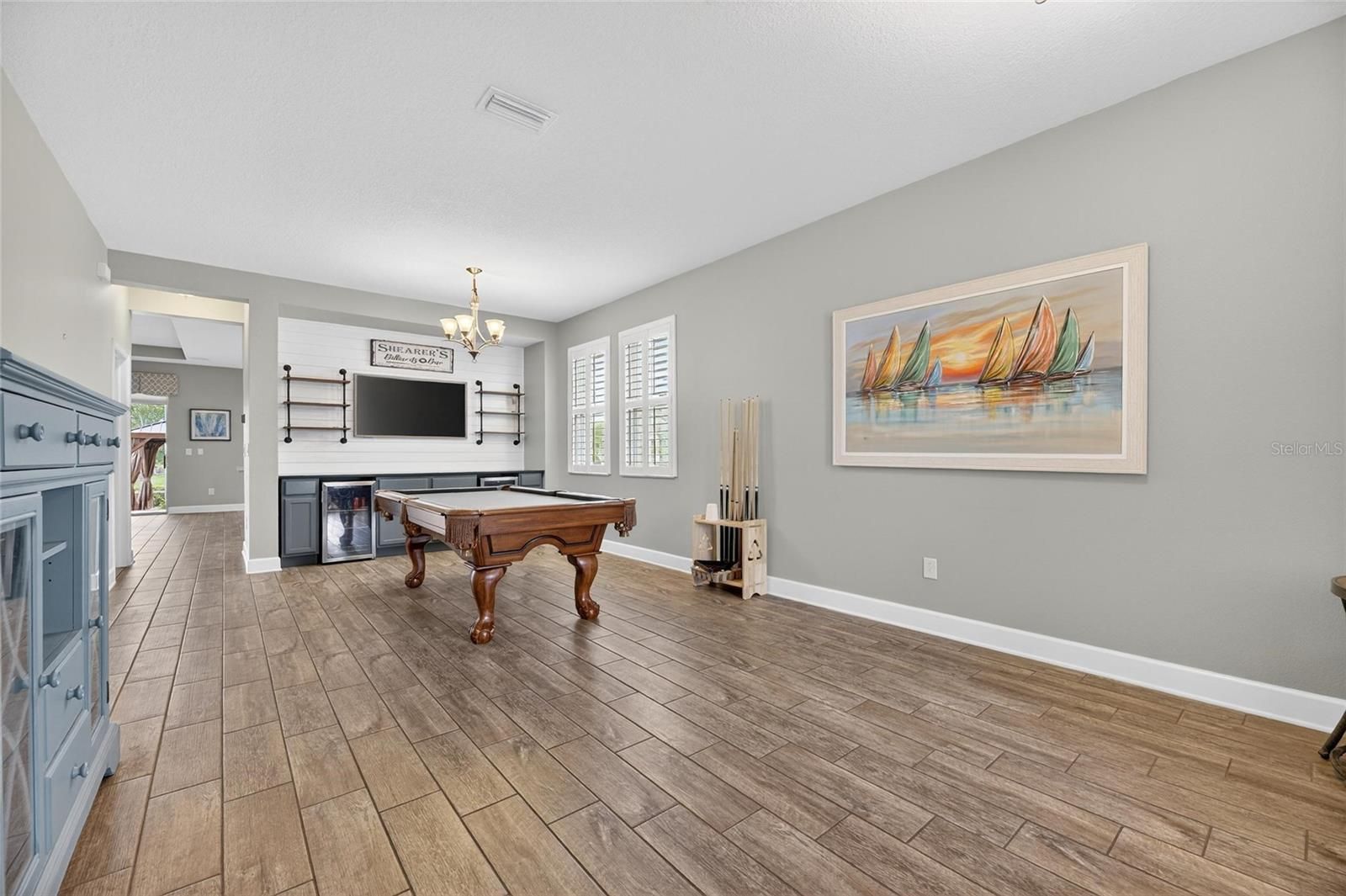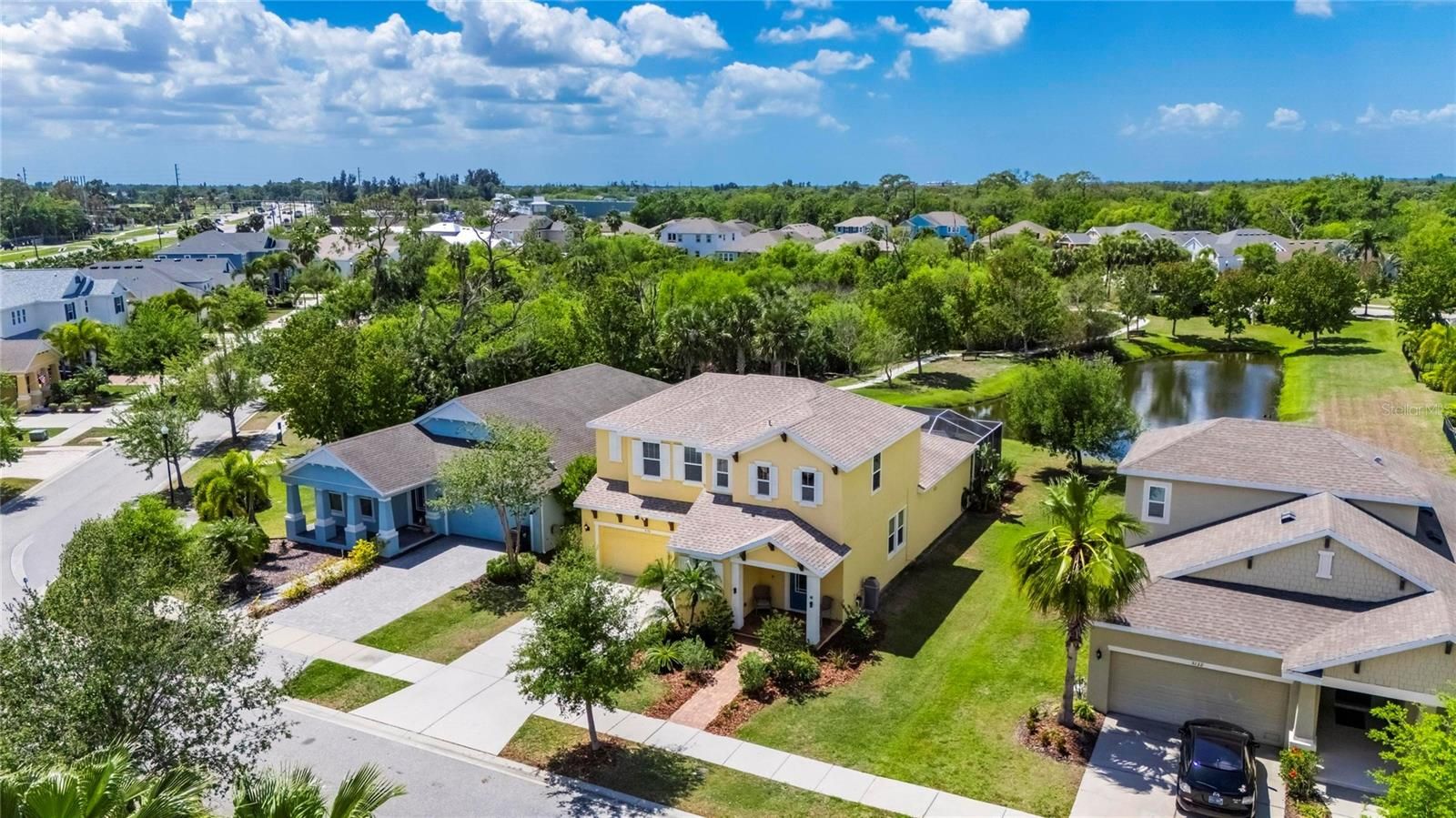 Welcome to this beautifully maintained 4-bedroom, 2.5-bath home with a 2-car garage, ideally located in the gated community of MiraBay. Built in 2017, this spacious home offers 2,799 square feet of living space and features a serene pond view, best enjoyed from your private screened-in patio complete with a firepit, perfect for relaxing or entertaining. The kitchen is thoughtfully designed with white shaker-style wood cabinetry, granite countertops, tile backsplash, stainless steel appliances including a gas range, and a walk-in pantry with built-in shelving. The first floor showcases wood-look plank tile flooring and a tray ceiling in the great room, adding both style and character. A dedicated game room with a custom dry bar includes a built-in wine fridge and beverage refrigerator, creating the perfect space for hosting family and friends. The primary suite features a tray ceiling, two spacious walk-in closets, and a large ensuite bath with dual vanities and an oversized walk-in shower. MiraBay is a true resort-style community, offering an impressive array of amenities including a beautiful clubhouse, heated Olympic-style pool with a 138-foot water slide, multiple parks, three playgrounds, a fitness center, basketball and pickleball courts, Har-Tru tennis courts, and a café with a full liquor license. Residents also enjoy access to the 142-acre lagoon, where you can kayak, paddleboard, and enjoy the waterfront lifestyle. Conveniently located with easy access to Tampa, Orlando, Bradenton, Sarasota, and St. Petersburg, you’re just a short drive from some of Florida’s best beaches, shopping, dining, and entertainment. Experience the perfect blend of comfort, style, and resort-style living, the Florida lifestyle you’ve been dreaming of awaits you.