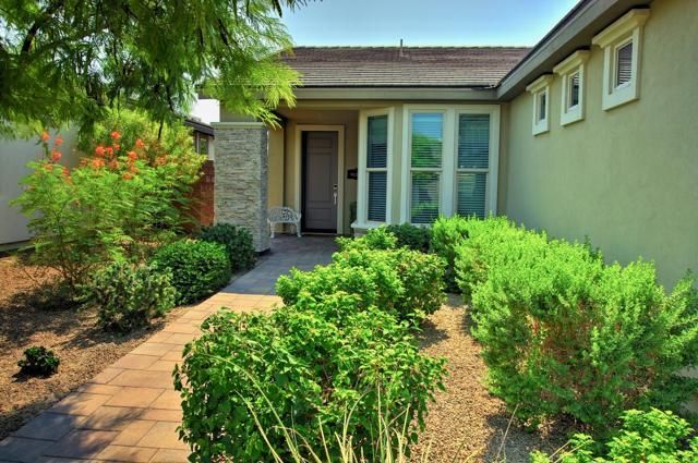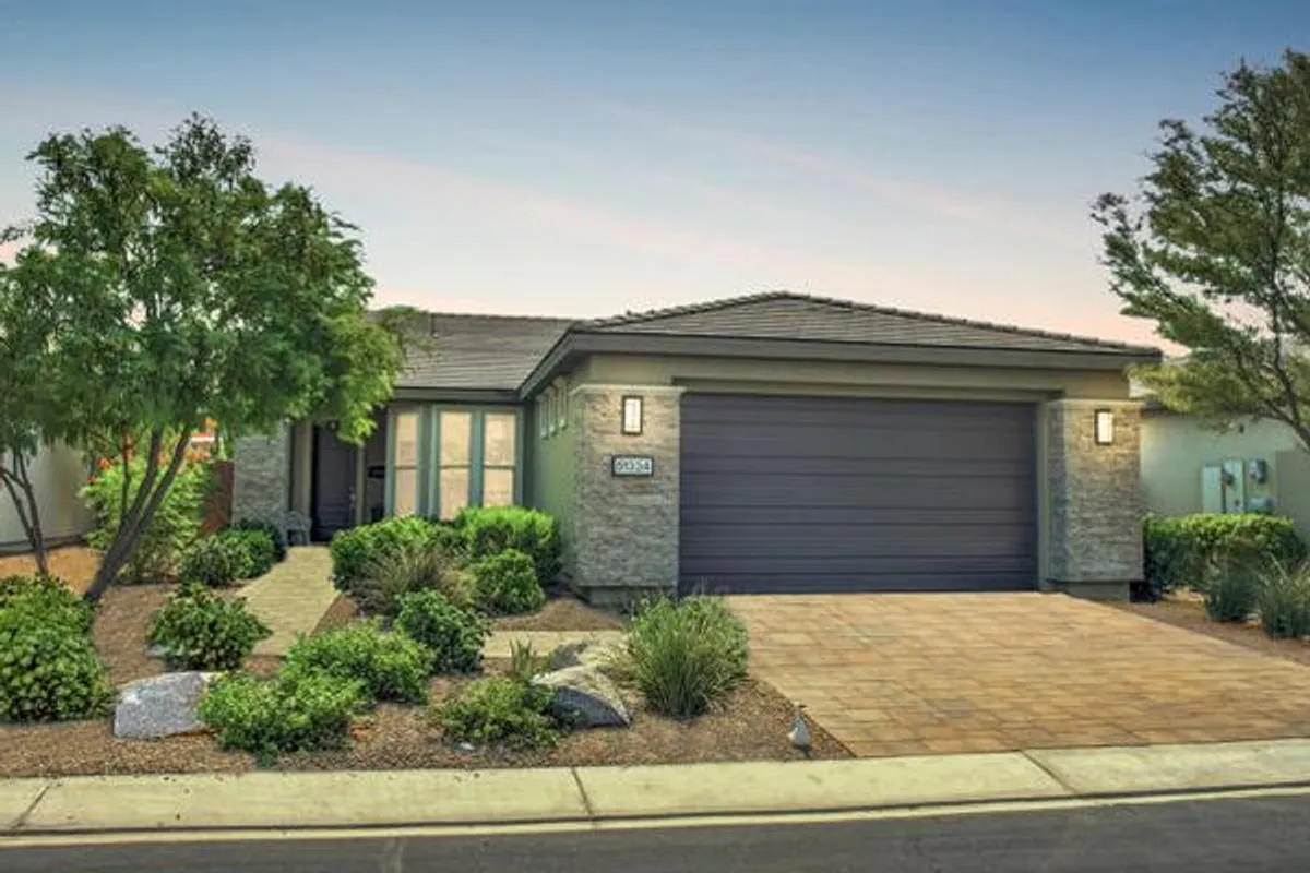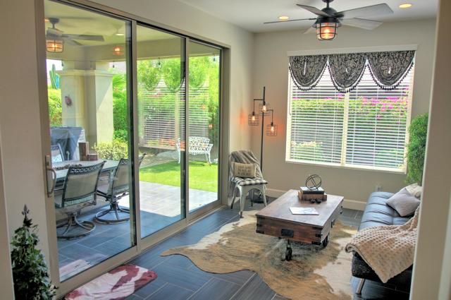 Shows like a model home! This spectacular home is located in the 55+ section of the community that's a short distance to the clubhouse and community amenities. This rarely available Monaco model with 1623SF has 2 bedrooms and 2 bathrooms is loaded with over $100,000 of upgrades and exceptional curb appeal. The home features solar power with about 10 years remaining on prepaid lease. The eat in Kitchen includes top of the line GE Monogram refrigerator and appliances. Elegant finishes include granite countertops/island, custom backsplash, and upgraded soft close cabinets with abundant storage. The open living space includes great room, dining room, den, and kitchen. Access the patio and rear yard from a large rolling wall of glass. The home features recessed lighting, designer tile flooring throughout primary living areas in home, upgraded carpet in bedrooms, designer 2 tone paint finishes and more! The primary bath has an oversized tiled shower with bench, dual sinks, and quartz countertops. The backyard features a covered patio and custom landscaping for the perfect desert oasis. Enjoy mountain views from the rear yard. If you choose to become a member of the clubhouse, club amenities include tennis/pickleball courts, fitness center, resort/lap/fitness pools & spa, poker/billiards room & artisan studio. Community also features putting green, bocce ball court, large chess game area, and walking trails.