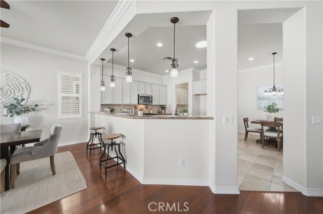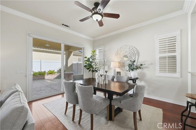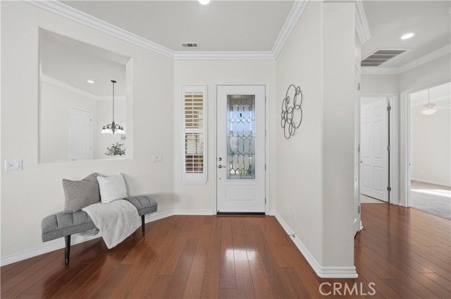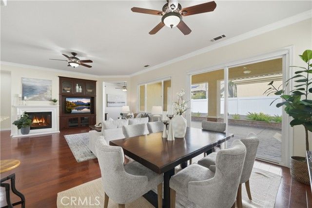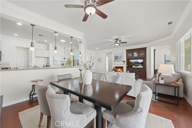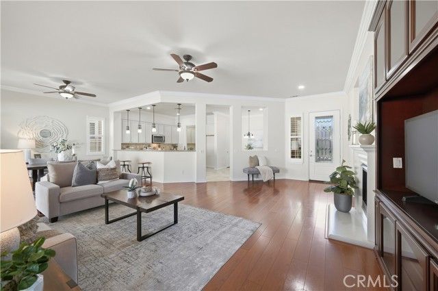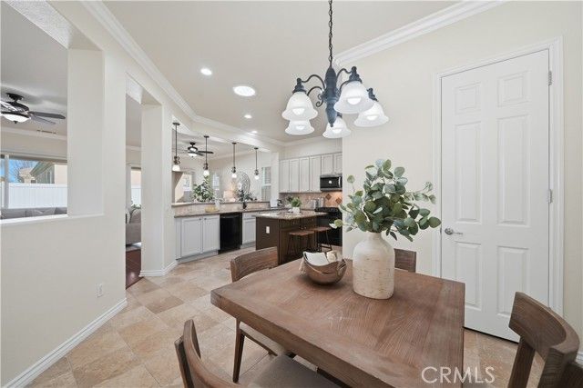 Welcome to refined 55+ resort living in Solera Diamond Valley by Del Webb, where this impeccably maintained, move-in-ready residence showcases thoughtful upgrades, timeless finishes, and effortless livability. A security screen door and glass-inlay entry open to a light-filled interior highlighted by plantation shutters, contemporary window treatments, crown molding, and upgraded flooring throughout. The inviting living area features a cozy fireplace, custom built-ins, and a dedicated office or den with built-in desk and shelving. The chef’s kitchen is both elegant and functional, offering granite countertops, white cabinetry, tile backsplash, a generous island with bar seating, and upgraded fixtures, all flowing seamlessly into the main living space for refined everyday living and entertaining. The spacious primary suite serves as a private retreat with a soaking tub, walk-in shower, and custom closet built-ins. Additional conveniences include a well-appointed laundry room with cabinetry and utility sink, and a finished 2-car garage with epoxy floors, built-in workbench, and abundant storage. Outdoors, the professionally landscaped backyard offers stamped concrete, raised flower beds, and a covered California-style patio—ideal for relaxed, low-maintenance outdoor enjoyment. Energy efficiency is enhanced by a solar system to help reduce utility costs (PPA). All set within a gated 55+ resort community featuring a clubhouse, pool, spa, fitness center, and a vibrant social calendar.