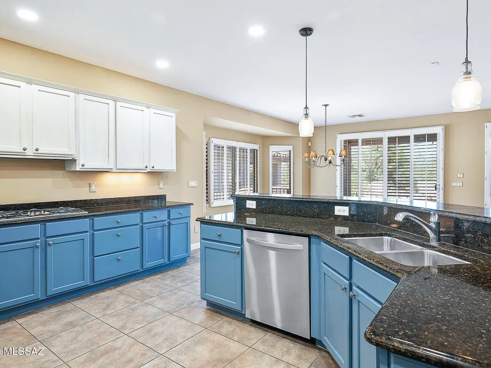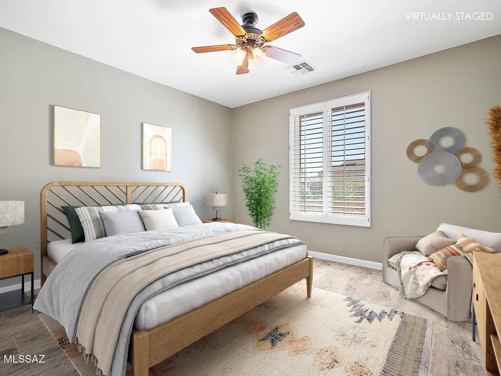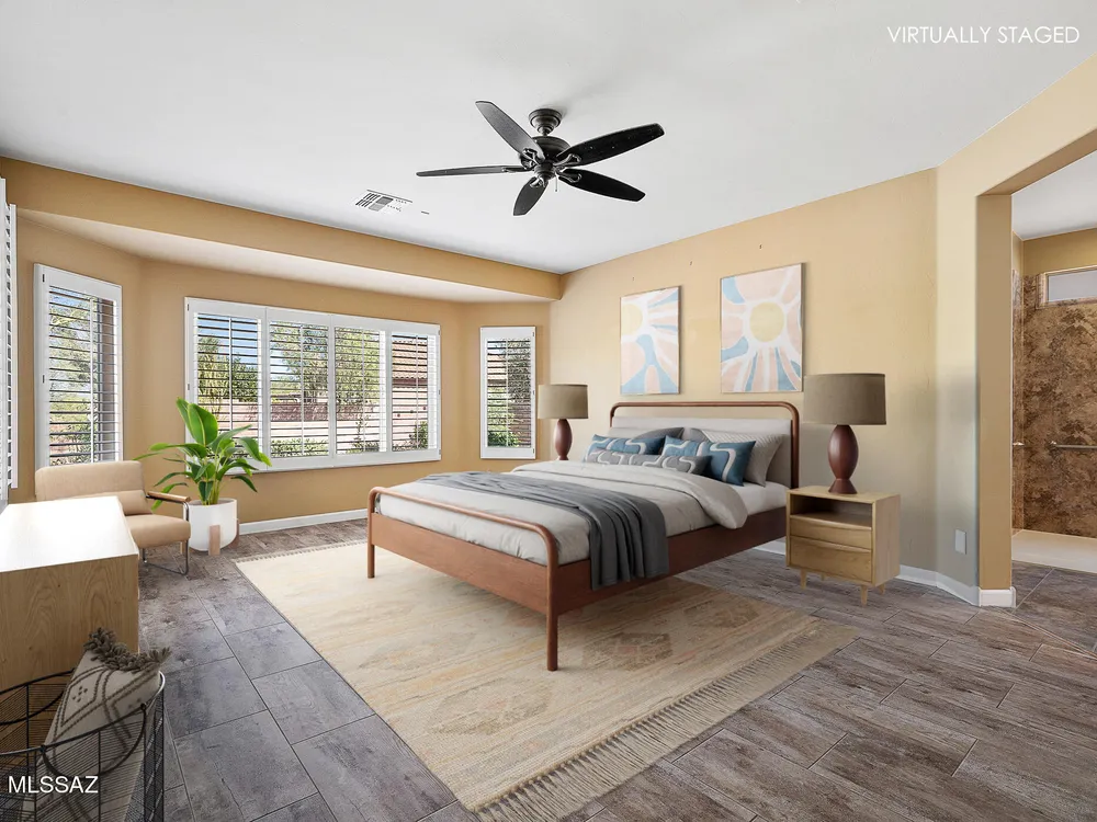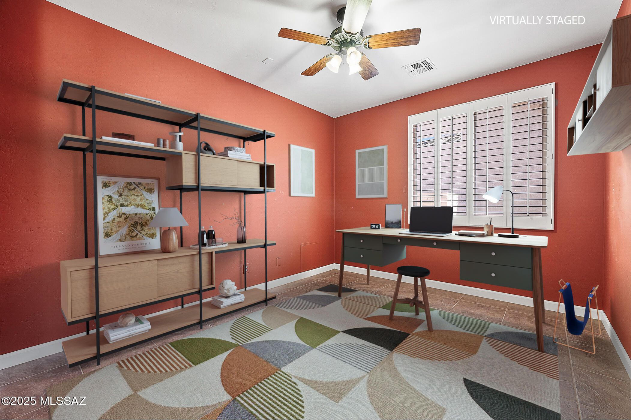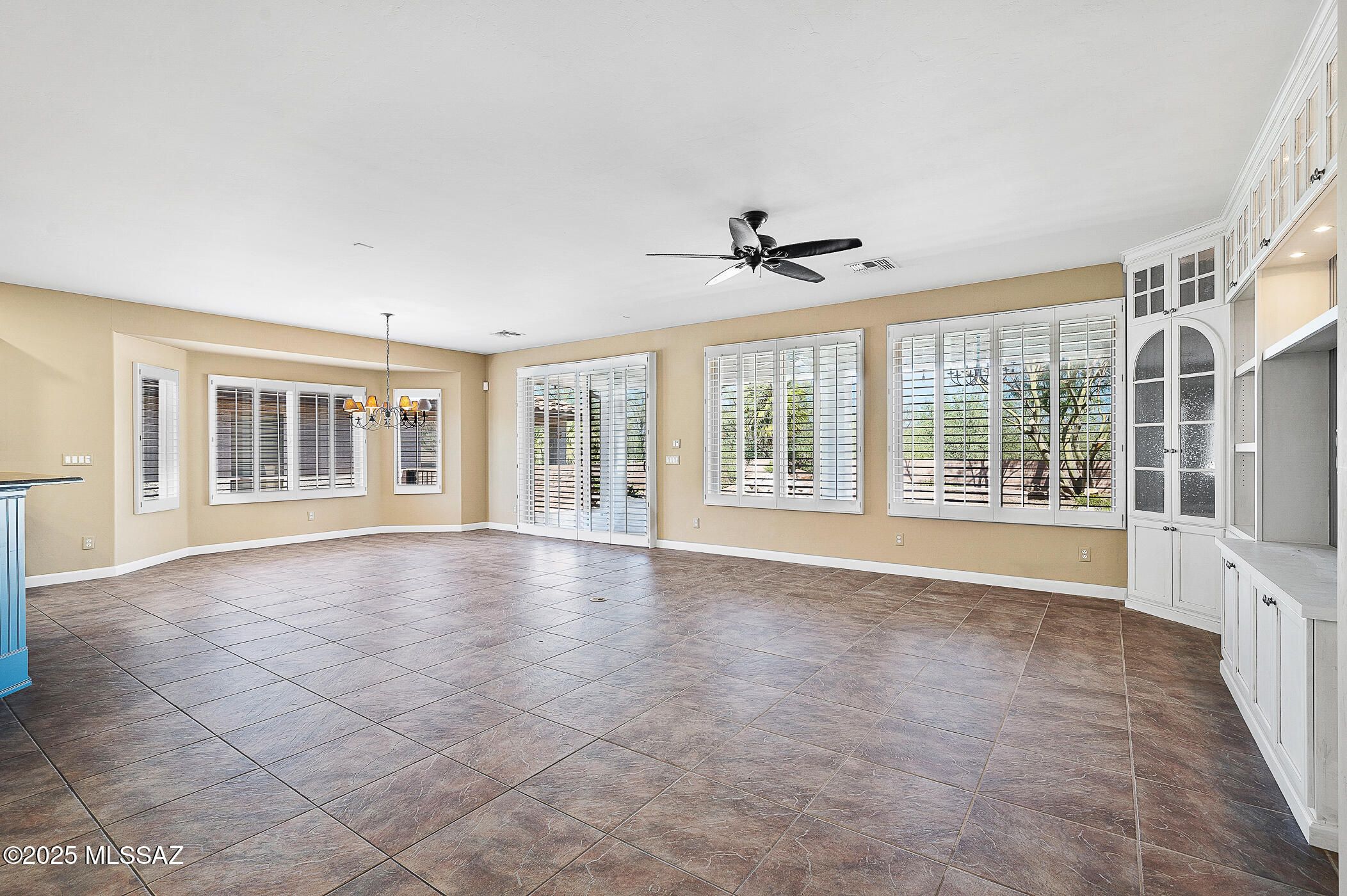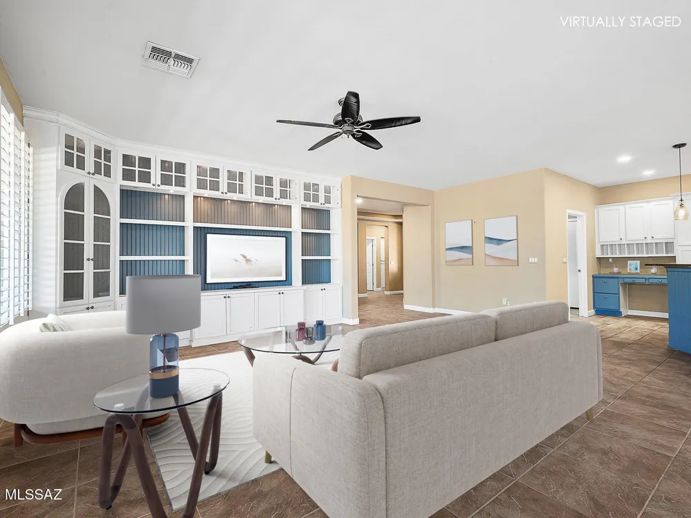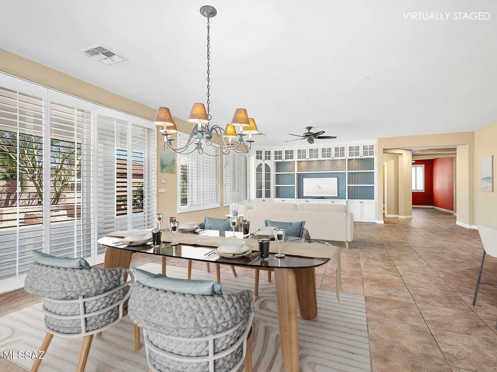 Welcome to a home where sophistication greets you at the door. A beautifully designed front courtyard, ideal for morning coffee or evening conversation, sets the tone for this exceptional home. Step inside to discover classy plantation shutters and desert-hued tile flooring that flow seamlessly into a spacious open-concept living area. The bay window in the dining space and a custom-built-in media center with glass-front cabinetry create an inviting atmosphere for both relaxation and entertaining. The chef's kitchen is a masterpiece of style and function, featuring vintage-inspired cabinetry with an aged finish, granite countertops, stainless steel appliances, and a large prep island with raised bar seating--perfect for hosting guests in style. Retreat to the primary suite, a