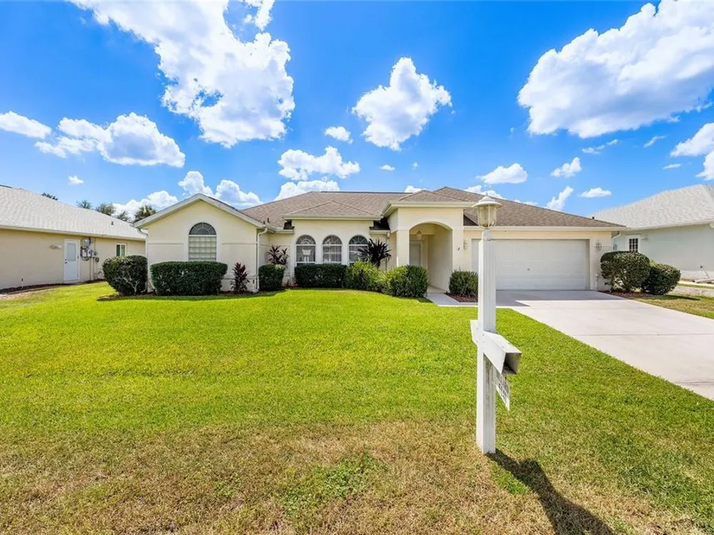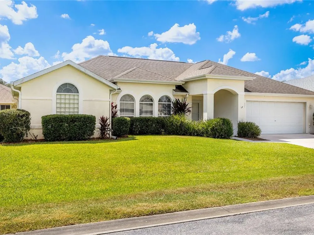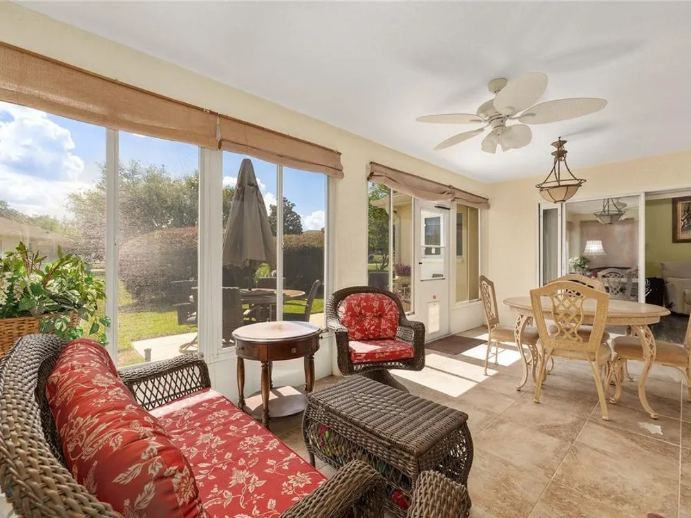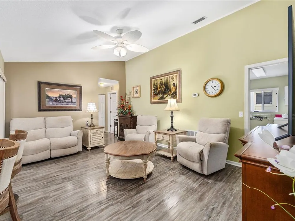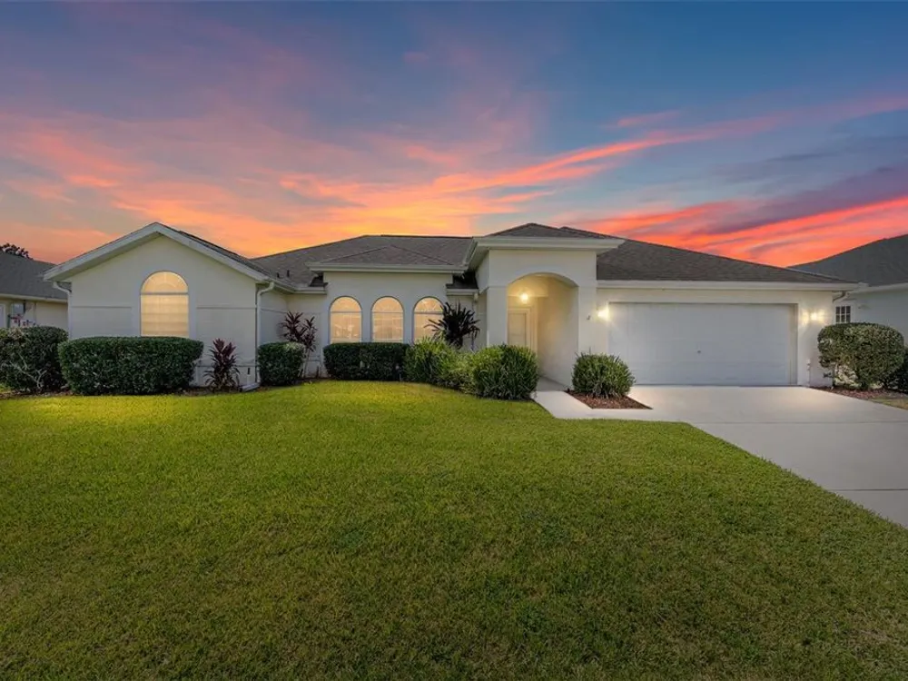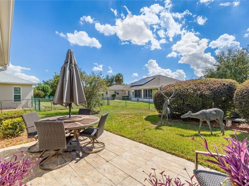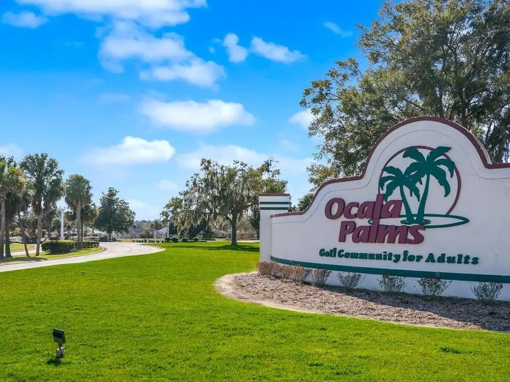 Welcome to Ocala Palms Golf and Country Club! Enjoy your retirement affordably. This Sabel II home features 1,569 square feet, 2 bedrooms and 2 baths. The interesting, vaulted and coffered ceilings are evident throughout the well cared for home. You will notice a split floor plan and features a living room, formal dining and separate family room. The laundry room features newer washer and dryer and provides lots of storage. The kitchen is nice and bright with newer, Whirlpool refridgerator and stove. The countertops are granite throughout the home. The Master bedroom ensuite is beautiful with a tray ceiling. The roof and HVAC are from 2018. Don't forget your pup as there is a fenced back yard! The back yard is also a perfect place to light up your grill! There are lots of amenities as well, including: an indoor and outdoor pool, fitness center, new pickle ball courts and pavillion (coming in early 2026), shuffle board, bocce ball, prestine grass area for croquette and a beautiful golf course! Come take a look at this friendly golf cart community. Room measurements are approximate. Shown by appointment only.