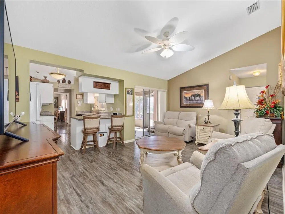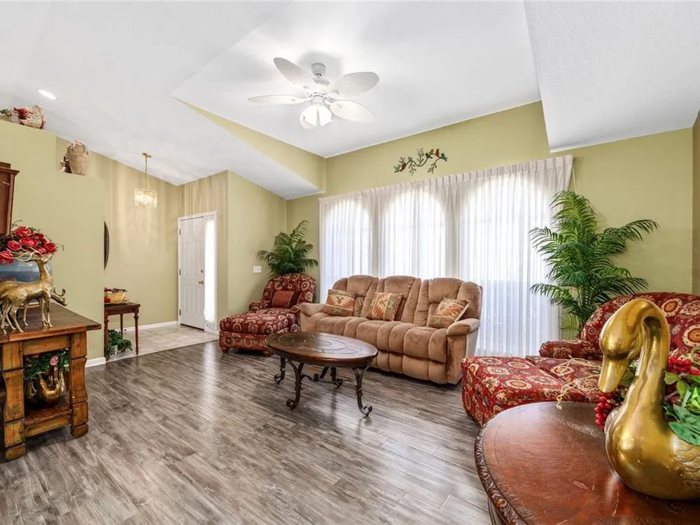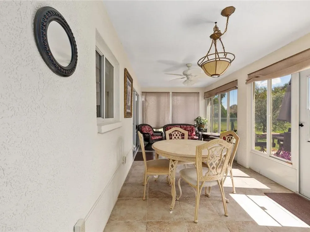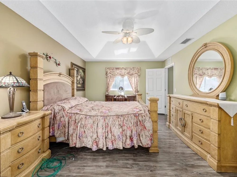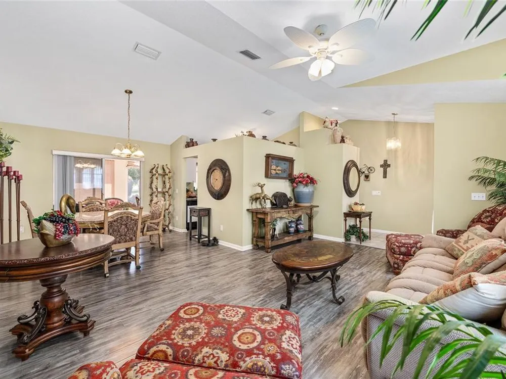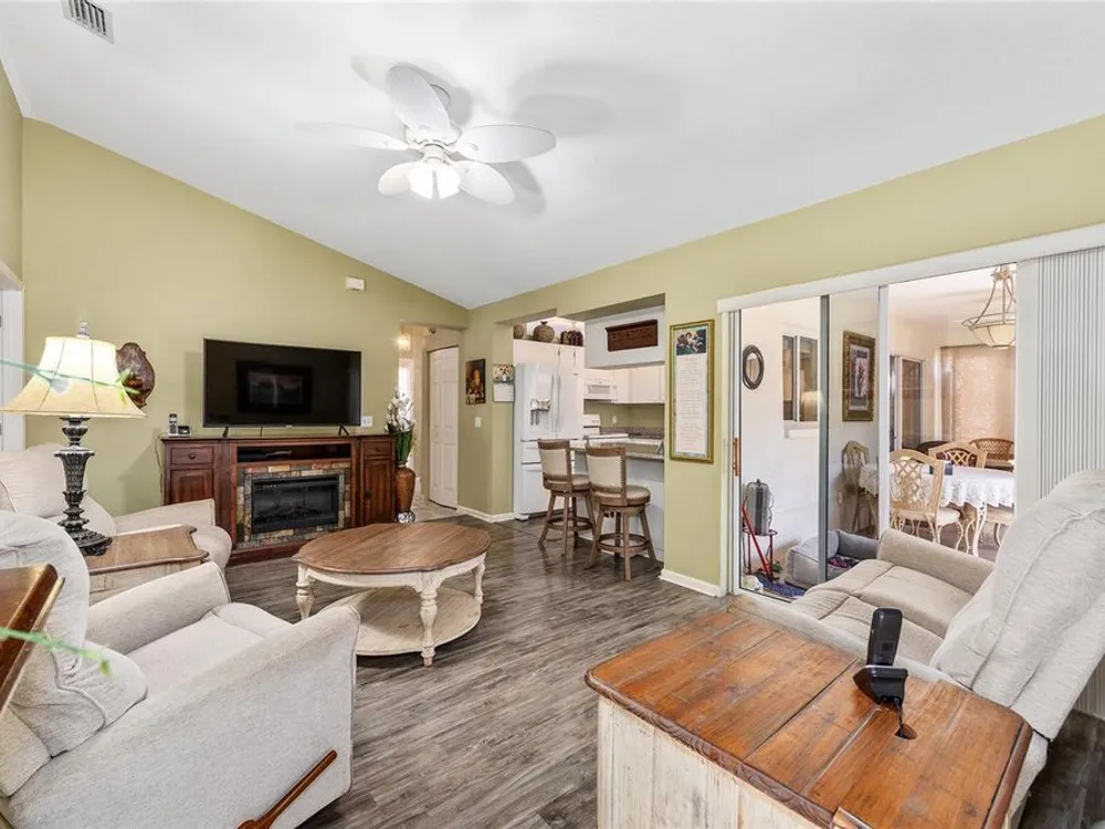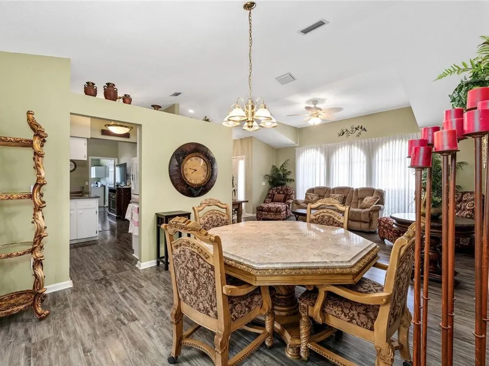 Welcome to Ocala Palms Golf and Country Club! Enjoy your retirement affordably. This Sabel II home features 1,569 square feet, 2 bedrooms and 2 baths. The interesting, vaulted and coffered ceilings are evident throughout the well cared for home. You will notice a split floor plan and features a living room, formal dining and separate family room. The laundry room features newer washer and dryer and provides lots of storage. The kitchen is nice and bright with newer, Whirlpool refridgerator and stove. The countertops are granite throughout the home. The Master bedroom ensuite is beautiful with a tray ceiling. The roof and HVAC are from 2018. Don't forget your pup as there is a fenced back yard! The back yard is also a perfect place to light up your grill! There are lots of amenities as well, including: an indoor and outdoor pool, fitness center, new pickle ball courts and pavillion (coming in early 2026), shuffle board, bocce ball, prestine grass area for croquette and a beautiful golf course! Come take a look at this friendly golf cart community. Room measurements are approximate. Shown by appointment only.