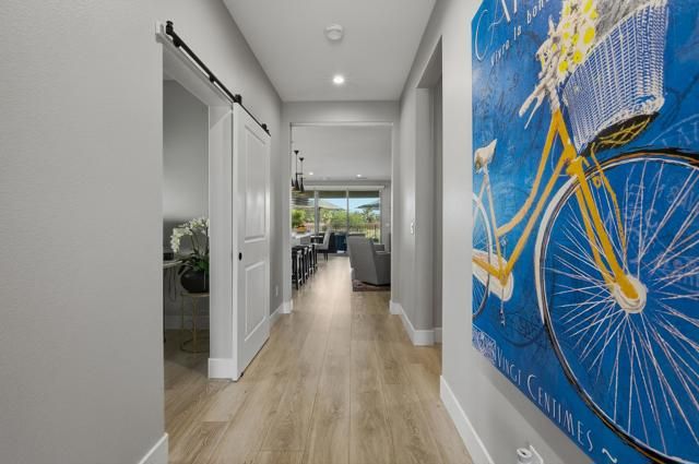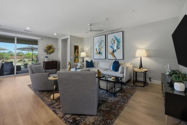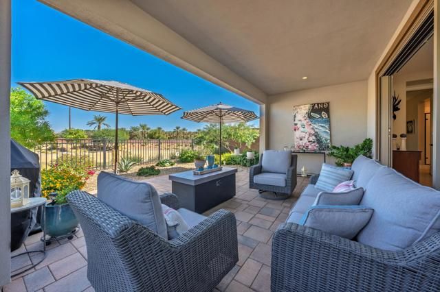 Shows like a model! Located behind the gates of Trilogy at The Polo Club, this highly upgraded Valletta plan showcases the perfect blend of style, comfort, and sophistication. Designed to maximize indoor-outdoor living, the home features a large rolling glass door leading to the covered patio, ideal for relaxing or hosting gatherings while enjoying dramatic views across the elevated lot and open space beyond. Inside, the light-filled floor plan offers two bedrooms, two and a half baths, plus a den, providing flexibility for an office, media room, or guest retreat. The gourmet kitchen opens seamlessly to the great room and features quartz countertops, an expansive island, and upgraded stainless-steel appliances--perfect for the modern chef. Elegant vinyl plank flooring extends throughout the home, creating a cohesive and stylish look. The primary suite offers a serene escape with a spa-like bath featuring dual vanities and a spacious walk-in closet. Thoughtful details abound, including designer ceiling fans, upgraded doors and fixtures, 5-inch base moldings, epoxy floors in the garage, custom window coverings, and a whole house water purification system, all contributing to the home's refined feel. This home is located close to the 25,000 sq ft Polo Club Clubhouse. A transferable membership (buyer to pay $1,875 fee) provides access to world-class amenities including a fitness center, tennis, pickleball, resort and lap pools, indoor golf simulator, and the acclaimed June Hill's Table restaurant. All set against the stunning backdrop of the Santa Rosa Mountains.