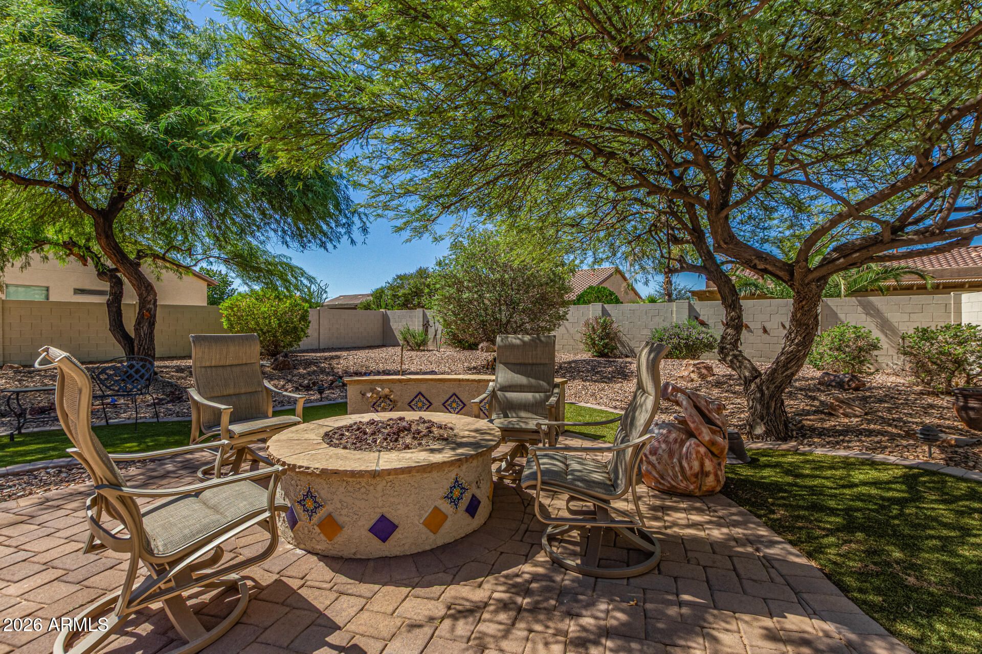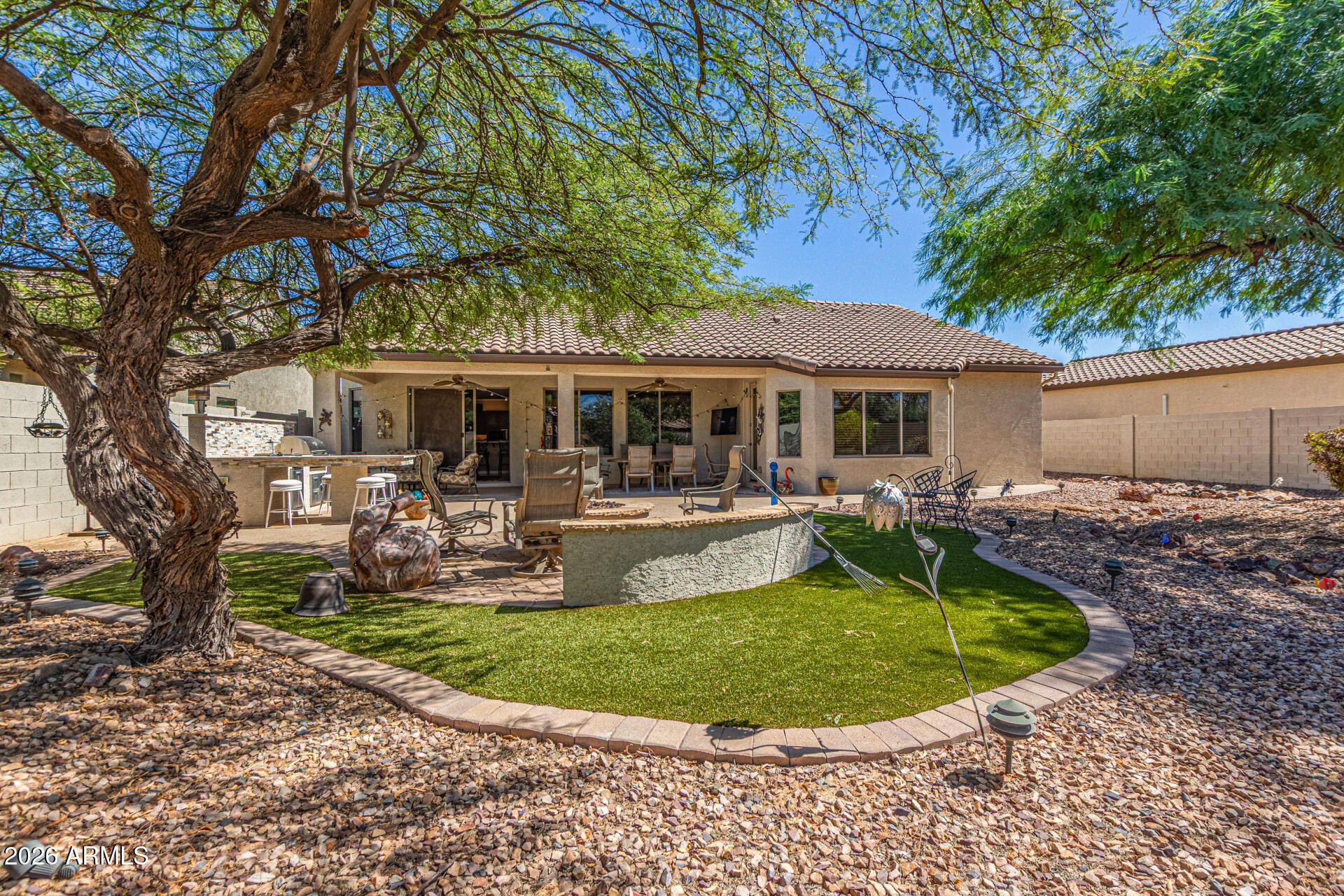 Must See! GORGEOUS Integra block home w/PRIVATE GUEST SUITE w/entry from the INSIDE & OUTSIDE of home! This 3 bedroom, 3.5 baths, den & 3 car garage w/4 ft. ext. on extra large cul-de-sac lot is ideal for entertaining! The gourmet kitchen features Maple cabinets that the cook of the house will surely appreciate, wall oven/microwave, tiled counter tops & large breakfast bar. Bay windows in both the master and dining . Master has door leading to backyard patio, master bath w/separate TILED tub & shower. Garage has built in cabinets & service door. Many upgrades such as 20' porcelain tile, new fireplace in Great Room, plantation shutters, sunscreens, upgraded fans & lighting. Step out back to the beautifully landscaped backyard, extended covered patio w/2 gates. Beautiful custom made front door. You can access the casita from outside or inside. Backyard with pavers and a firepit for gathering around to share stories, a built-in BBQ, a grassy area, and a relaxing landscape with mature trees. What are you waiting for?