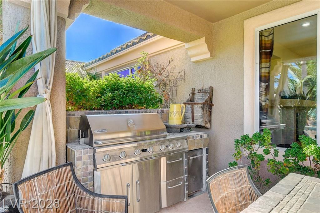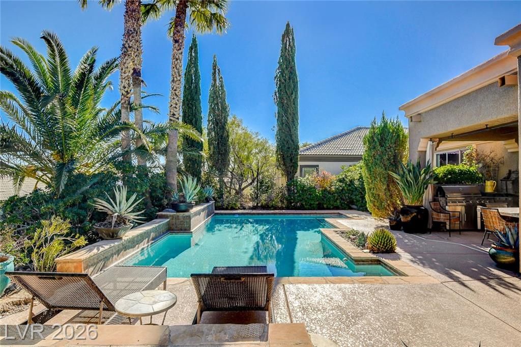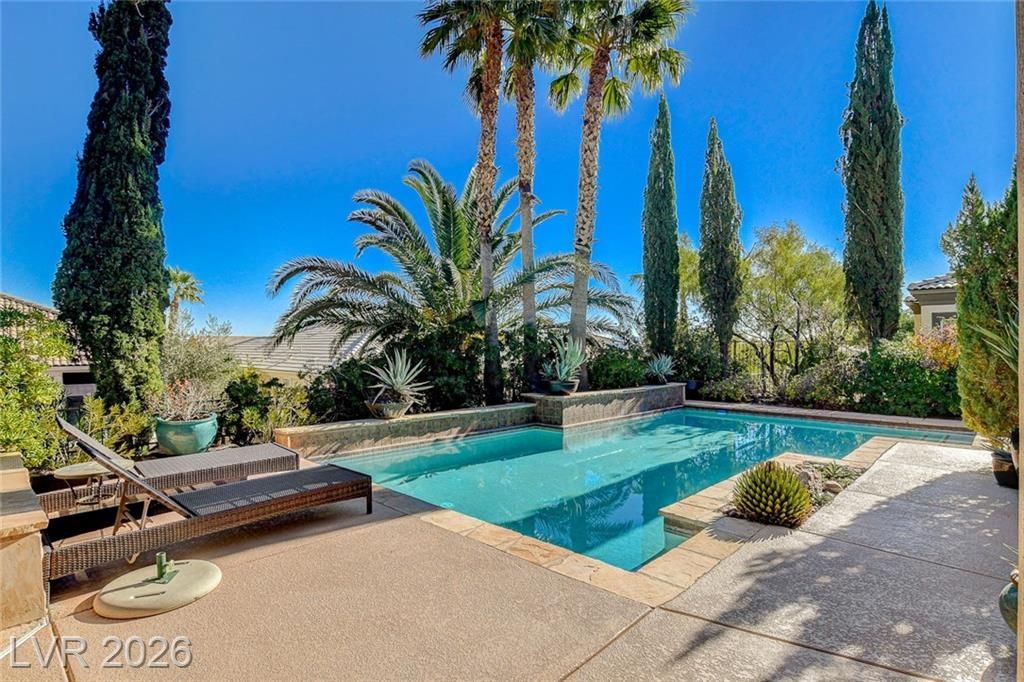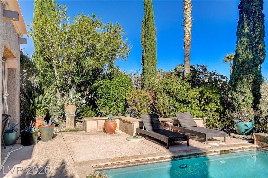 UNIQUE OASIS IS A GREAT DESCRIPTION OF THIS 'SIENA' IN SUMMERLIN AGE-QUALIFIED PROPERTY, '7110' MODEL BOASTING A LG 34'X14' INVITING POOL, SOLAR HEATED W/ CASCADING WATERFALLS, 600 BOTTLE WINE CELLAR, FULLY PAID $65,000 32 SOLAR PANELS W/ 3 TESLA BATTERIES & 240V EV HOOKUP, EUROPEAN FLAIR INSIDE & OUT W/ ITALIAN CYPRUS TREES, CUSTOM GATED COURTYARD, PAVER ENTRY & DRIVE, FULLY FENCED REAR W/ B/IN BBQ, LG POTS W/ PLANTS, COVERED PATIO, INTERIOR W/ TRAVERTINE MARBLE FLOORS, RECONFIGURED KITCHEN W/ GRANITE & MAPLE, STAINLESS STEEL APPLIANCES, CUSTOM B/IN SHELVING W/ SITTING & DINING AREAS, GREAT RM W/ DESIGNER ASIAN DBL DOOR FEATURE & FIREPLACE, PRIMARY BED W/ FULL BATH, SECOND & THIRD BEDRMS W/ BATH, DEN OFF OF 2ND BED THAT CAN BE USED IN MULTIPLE WAYS, LAUNDRY RM W/ WASHER, DRYER, SINK & CABINETS, DBL GLASS ENTRY DOOR, 2 CAR GARAGE W/ GOLF CART STORAGE AREA, PLUS SO MUCH MORE!