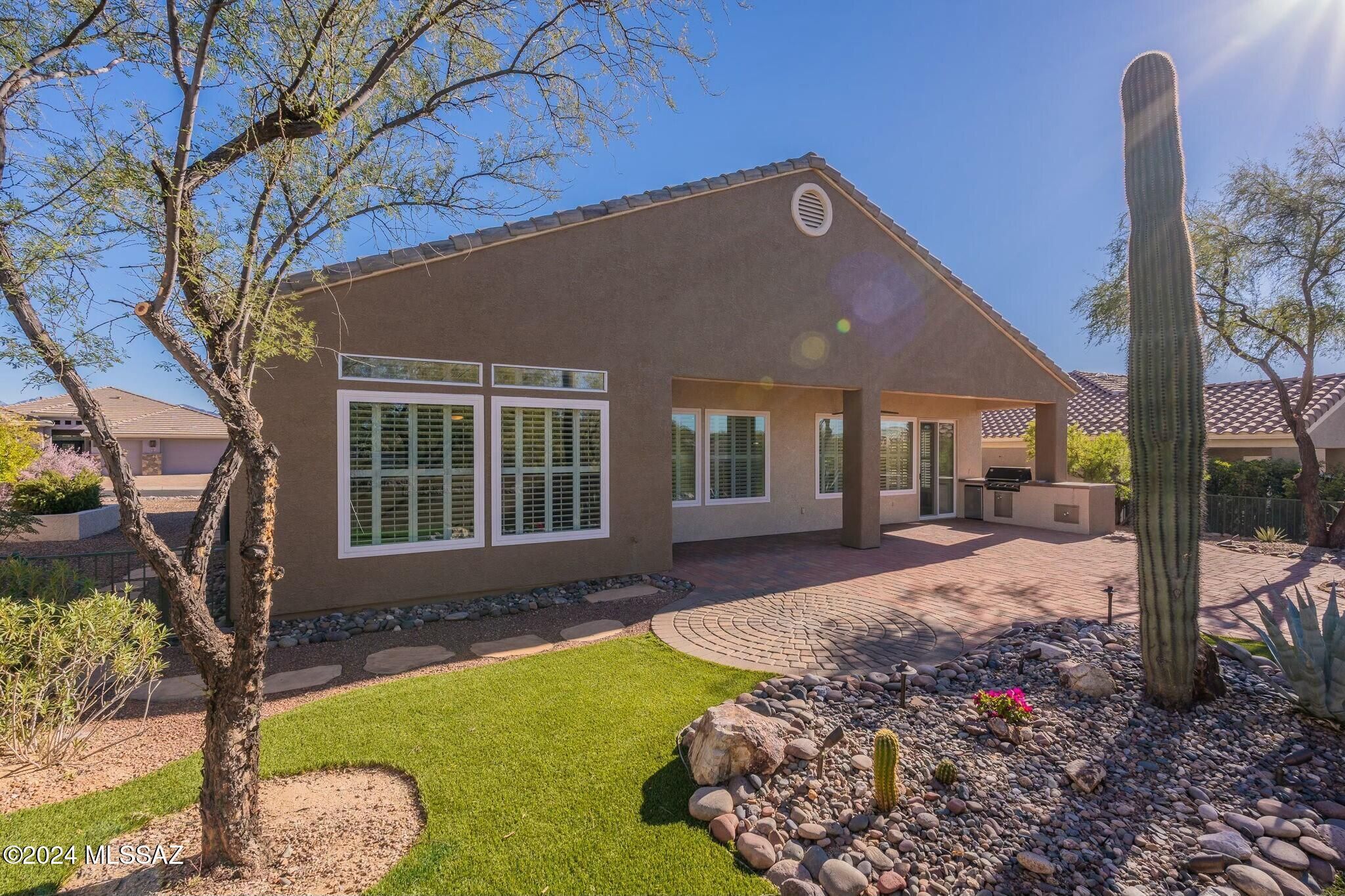 Priced $50K below recent appraisal, this upgraded Santa Rosa model in guard-gated Heritage Highlands offers unmatched value. Features include fully paid-off solar, new HVAC, remodeled kitchen and baths, epoxy-coated garage floors, and expanded paver patio, driveway, and front courtyard. Smart split-bedroom layout with 2 beds, den, great room with fireplace, and high ceilings throughout. Positioned on a corner lot that backs to open green space with view fencing. Low-maintenance landscaping, upgraded irrigation, and built-in backyard BBQ. Enjoy golf, clubhouse, pickleball, tennis, pool, fitness center, and more in one of Southern Arizona's premier 55+ communities.