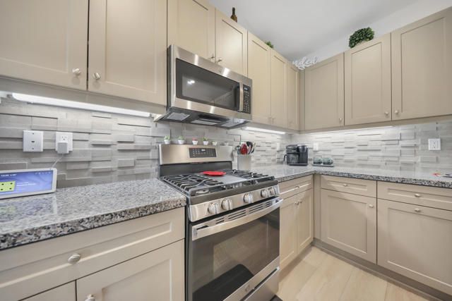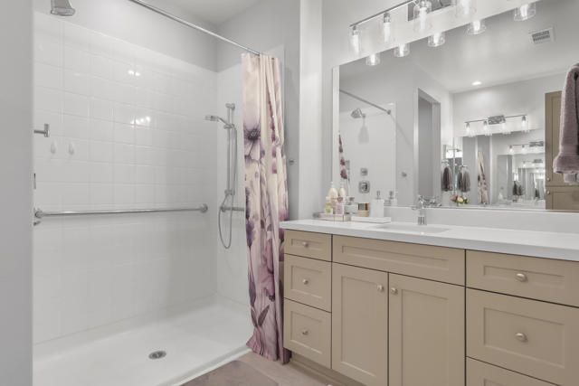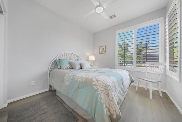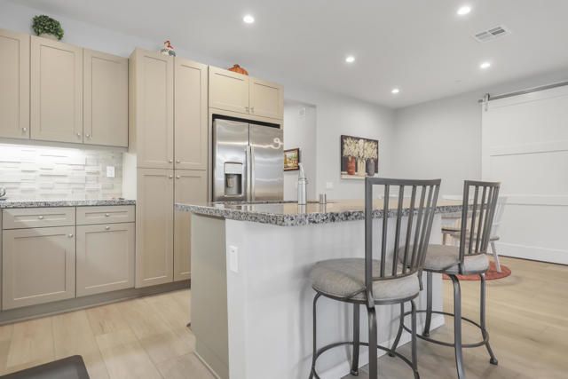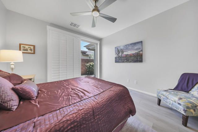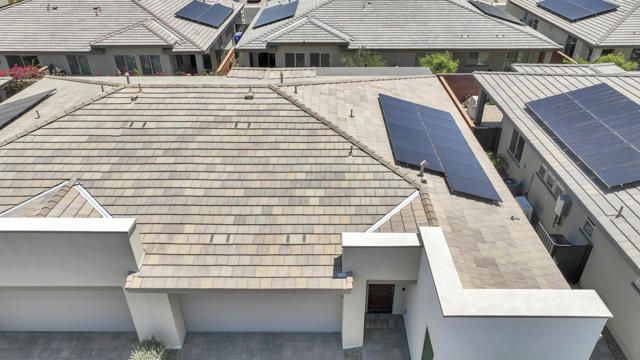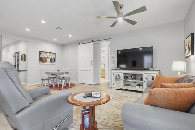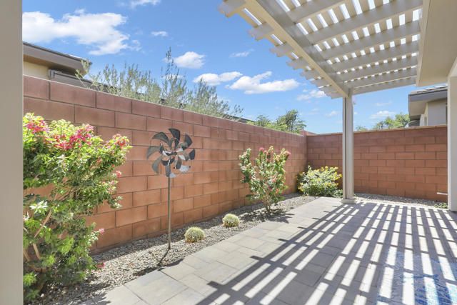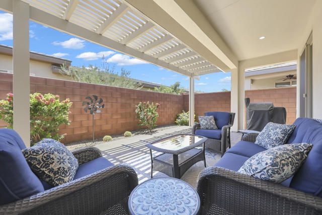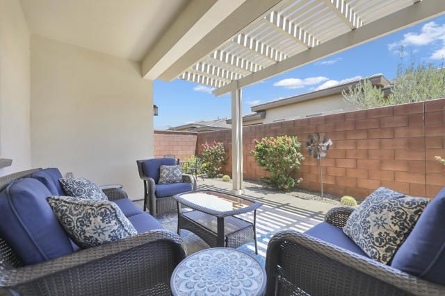 This thoughtfully designed Aria floor plan is smart-home equipped and enhanced for accessibility featuring a roll-under vanity option and a dual-head shower. The primary suite is appointed with stylish barn doors and a sliding glass door offering direct access to the backyard. Interior upgrades include luxury vinyl flooring, vinyl shutters, a stackable washer and dryer, a 3D stone backsplash, a custom built-in closet, and additional recessed lighting in both the dining area and primary suite. The chef's kitchen opens to expansive indoor-outdoor living, highlighted by an Alumawood covered patio, new screen doors, and a retractable front entry screen. A solar lease at approximately $60 per month and a new AC condenser installed in 2024, providing year-round comfort and efficiency. Enjoy refined desert living within a welcoming resort-style community. Club membership is available for transfer ($3,000 transfer fee versus $20,000 for new membership) and offers access to exceptional amenities, including June Hill's Table dining, a wellness and fitness center, culinary and art studios, lap and lounge pools with spa, an indoor golf simulator, billiards, shuffleboard, and courts for tennis, pickleball, and bocce. Experience the lifestyle, comfort, and community this home has to offer.