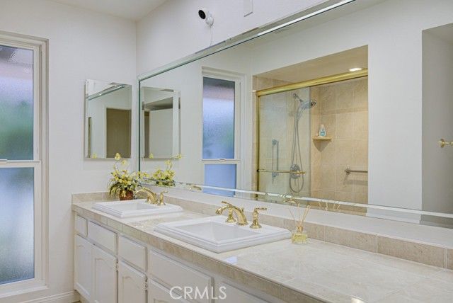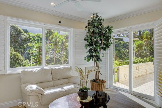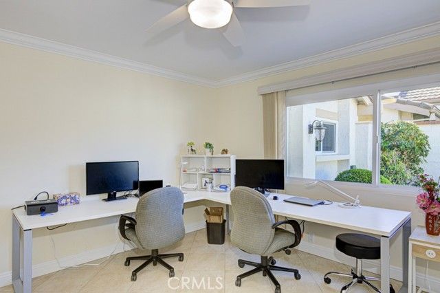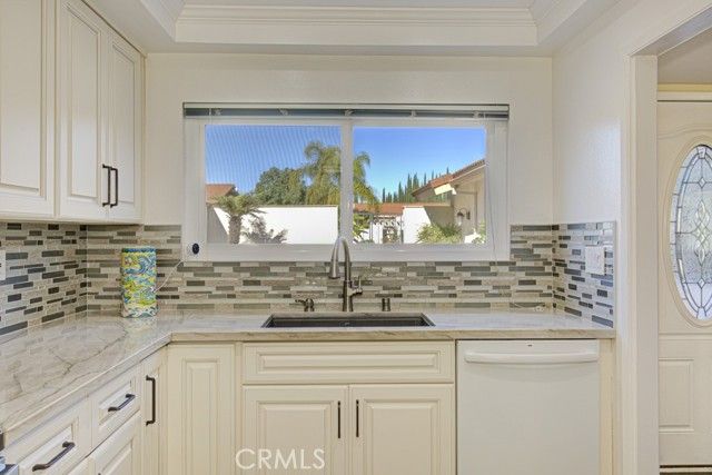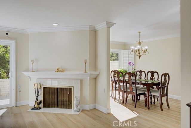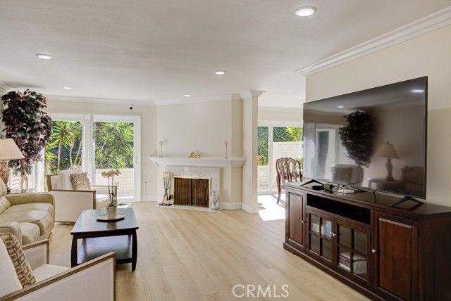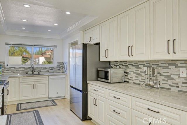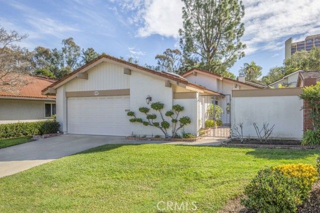 Welcome home! This lovely, bright Villa Serena home (3BDR/2BA) is the most popular model in prestigious Gate 11 and boasts a flowing, functional, and open floorplan that affords privacy, natural lighting, and greenery soothing to the eyes throughout from each room. As you enter through the front gate, you will see a beautiful brick courtyard tastefully landscaped with diverse flowers and mature plants. The back of the home has a spacious patio, accessed through sliding doors from the living, dining, and master bedrooms. What a perfect outdoor environment to entertain family and friends or enjoy your morning coffee! The kitchen window overlooks the front courtyard and thus gets natural light inside while providing you with a peaceful view of the neighborhood outside. The kitchen boasts upgraded quartz countertops, an updated stainless steel range hood, intricate backsplash, elegant off-white cabinetry, newer recessed lighting and appliances. The living room is expansive with a wood-burning fireplace and built-in bookcase. The master bedroom is larger than most others with its expanded addition, including a large private sitting area; large walk-in closet; an-suite bathroom with double sinks; large walk-in shower; and its location maximizes peace and quiet. The second bedroom has new window treatments, large mirrored sliding doors with closet space and convenient proximity to the second bathroom. The third bedroom has been converted into an office that looks out to the natural, green, landscaped courtyard and also has direct access to the laundry room and garage. With a central air/heating system, this lovely home also has double-paned windows/sliding doors, skylights, smooth ceilings, and a separate laundry room with washer/dryer. In 2023, the home was repainted throughout and luxury, modern, waterproof vinyl flooring was installed in most of the home. Located in the gated community of Laguna Woods Village—the premier, age 55+ active community in Orange County—this home is conveniently located with proximity to the Irvine Spectrum, Laguna Beach among other towns and offers many wonderful amenities such as a 27-hole golf course, tennis courts, separate pickleball courts, 5 swimming pools, 3 fitness centers, RV storage, garden center, and 7 clubhouses, including Clubhouse 4 that offers amazing classes in art, ceramics, wood shop, jewelry-making, and sewing, and much more. This updated, well-appointed, and well-maintained home won’t last long!