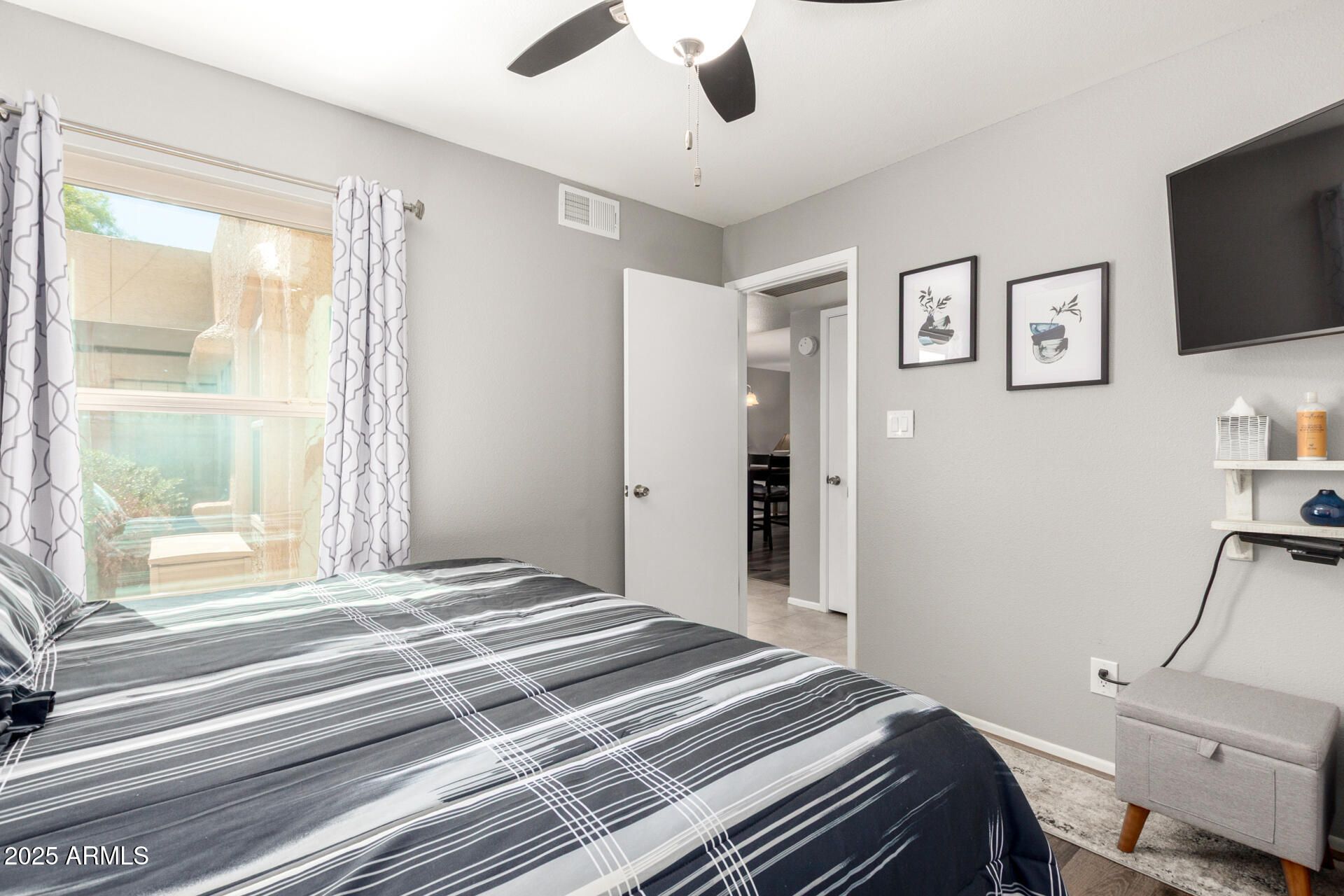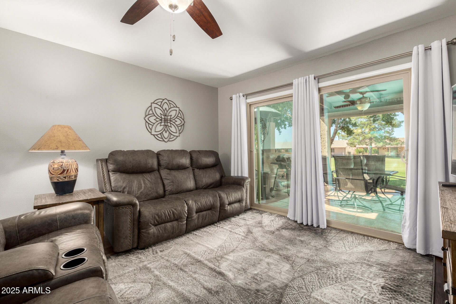 Beautifully updated home on a golf course lot in Fountain of the Sun, a gated 55+ community in Mesa. The interior features new LVP flooring, new ceiling fans, and a kitchen with granite counters. Both bathrooms have been upgraded, including a fully tiled step-in shower. The home is exceptionally clean, well maintained, and move-in ready. All windows and both sliding glass doors were replaced in 2020, and a new AC and heat pump were installed in 2023 for efficiency and comfort. The back patio has been resurfaced and extended with decorative stamped concrete, offering a perfect space to enjoy golf course views. Washer, dryer, and refrigerator convey with the sale. Fountain of the Sun offers an 18-hole executive golf course, clubhouse, pool and spa, pickleball, walking paths, fishing lakes, and a variety of clubs and activities, with shopping, dining, and medical services nearby.