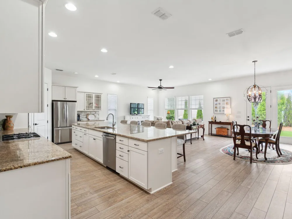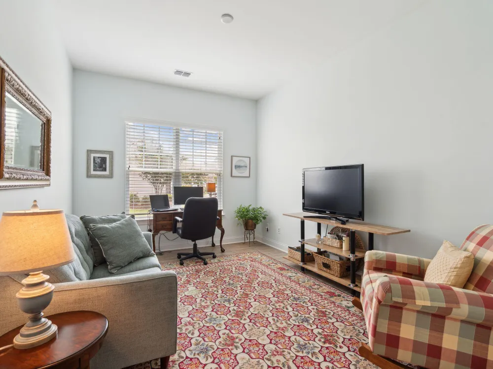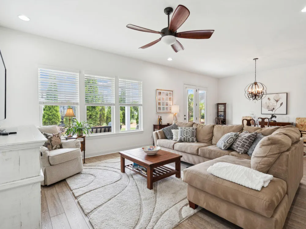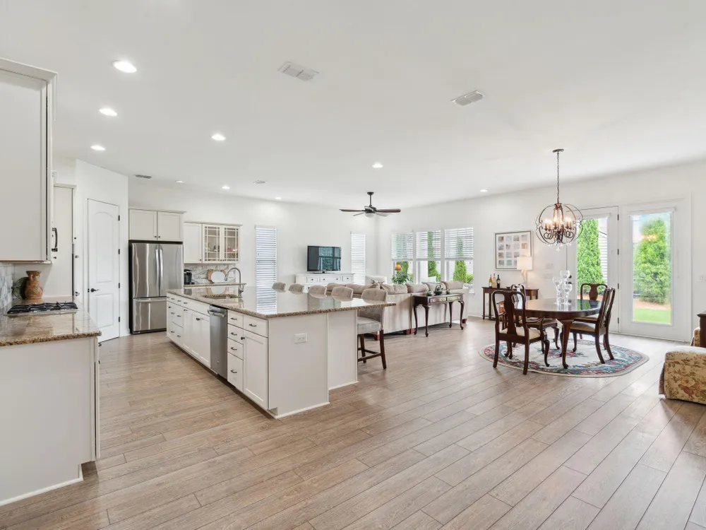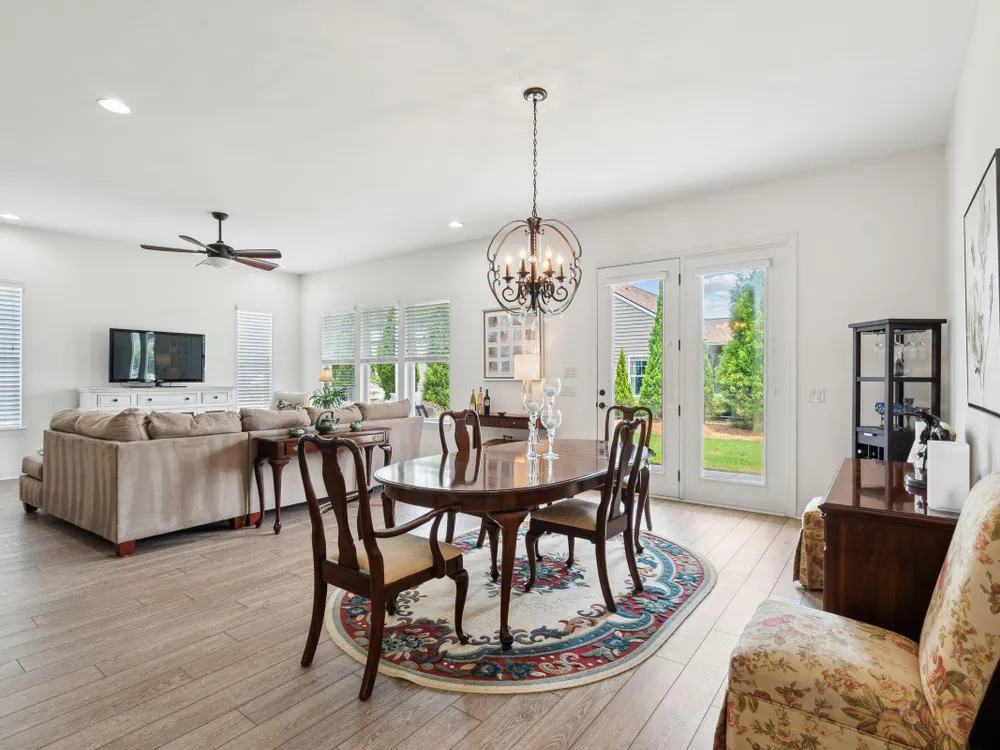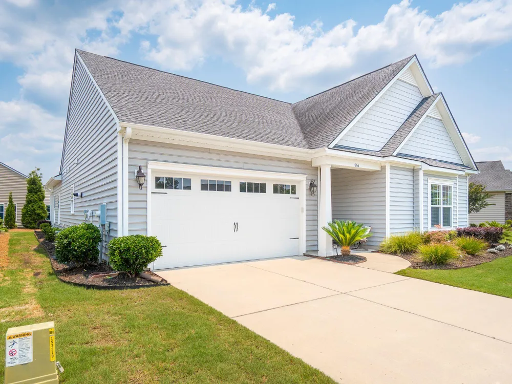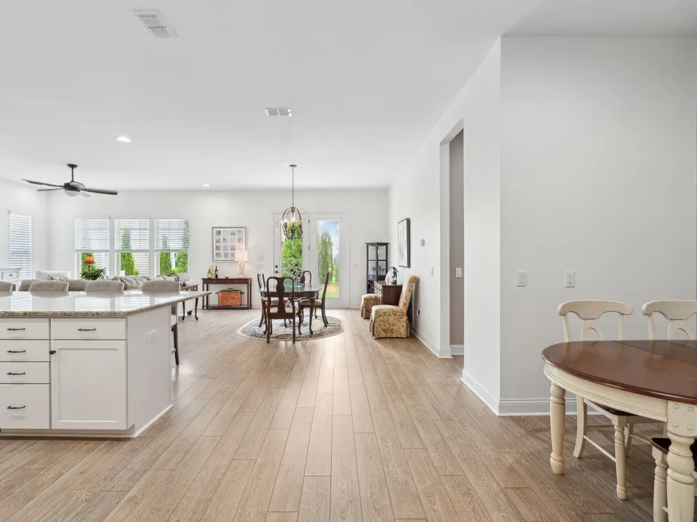 This beautifully maintained, single-story home with 2 bedroom suites, 2.5 bathrooms, and a dedicated office in Four Seasons at Lakes of Cane Bay could be the beginning of your next life chapter--where you finally have time for what matters most. No yard work, no stairs, low-maintenance, no stress--just the freedom to live fully. You'll love the welcoming front entry, spacious open-concept living/dining/kitchen area, French-door office, ample storage, and tall windows and glass doors that invite soft natural light throughout. The chef's kitchen features a large central island with seating, granite countertops, a gas cooktop, stainless steel appliances (including a double wall oven), tall soft-close cabinets, a walk-in pantry, and a cozy breakfast nook. Relax in the well-sized primary......suite with a generous walk-in closet and a spa-like ensuite bathroom featuring a walk-in shower with a glass door and built-in bench, a wrap-around dual-sink vanity with granite counters, and a private water closet. Greet neighbors from the covered front porch and invite them into the elegant foyer. Host overnight guests comfortably in the secondary suite, which includes its own full bathroom and walk-in closet. Enjoy backyard views from the living room, primary suite, and large partially covered patio. Additional features include easy-care laminate flooring, decorative wainscoting and crown molding, 9'+ ceilings with fans and recessed lighting, a handy drop zone near the attached 2-car garage, a spacious laundry room with cabinets and a utility sink, plus multiple storage and linen closets. The builder's 10-year structural warranty and the seller's termite bond transfer to the new owner for added peace of mind. Four Seasons at Lakes of Cane Bay is an award-winning, amenity-rich, 55+ gated community in Summerville near Charleston, SC. Feel safe and relaxed with a 24/7 staffed guardhouse and gated entry. Trash pickup, full lawn care (mowing, weeding, seeding, edging, fertilizing), and incredible resort-style amenities are all included. Enjoy kayaking, canoeing, and boating on the community's private 300+ acre lake with an 8-mile waterway, boat ramp, and dock. Stay active at the Lake House amenity center, offering 3 pools (2 outdoor, 1 indoor), a fitness center, movement studio, ballroom, demo kitchen, arts and crafts room, game room, billiards, and outdoor amphitheater. Tennis, pickleball, and bocce courts round out the lifestyle offerings. Convenient to hospitals, shopping, and dining in Summerville, and only 40-60 minutes to Charleston International Airport, Historic Downtown Charleston and area beaches. Why wait? Schedule your private showing today and discover resort-style life at Four Seasons!