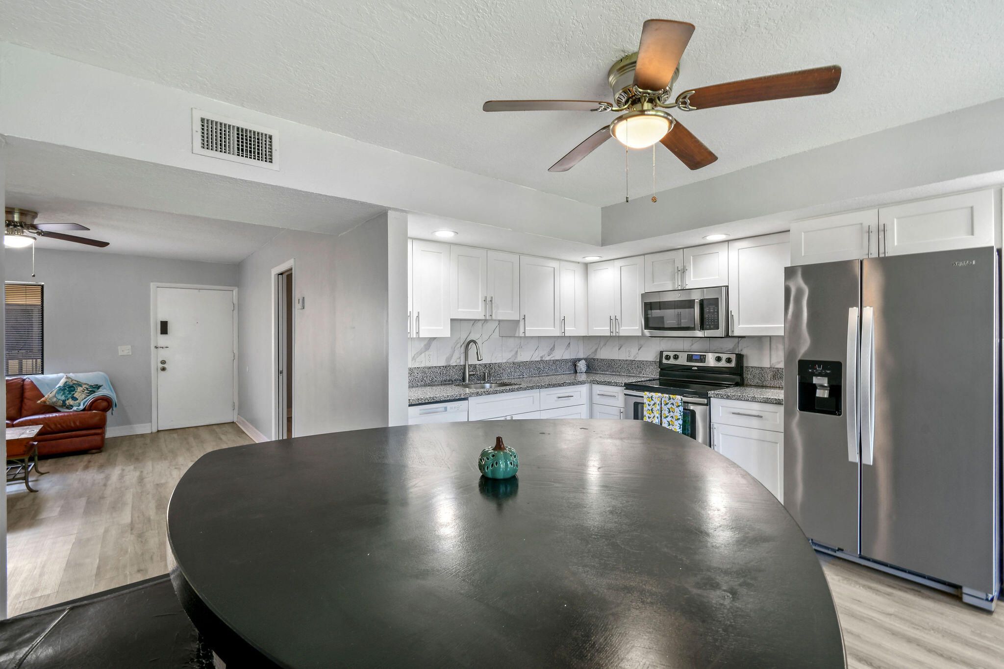 This beautiful top-floor, garden-style condo boasts 3 bedrooms and 2 baths in the highly sought-after Las Verdes community, a non-age-restricted building. The condo features laminated flooring throughout and an updated kitchen with white cabinets and granite countertops. Sliding doors off the kitchen lead to a private screened balcony. Las Verdes offers a host of amenities, including a 24/7 manned gate, a central lake for leisurely walks, three pools, two Jacuzzis, a fitness center, and courts for tennis, pickleball, and bocce ball. Conveniently located 4 miles from Downtown Delray, and is just minutes away from shopping, dining, hospital and I-95.