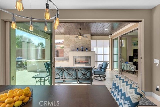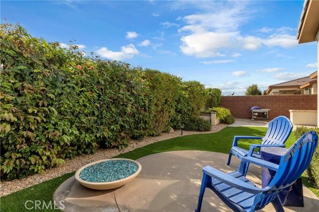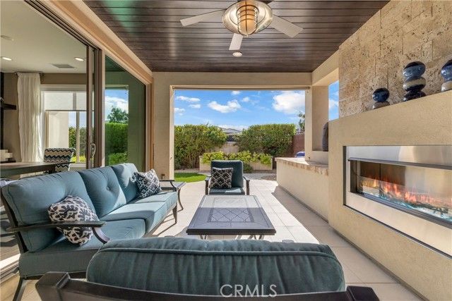 Located behind the gates in a quiet cul-de-sac within Trilogy at The Polo Club, this former FULLY FURNISHED MODEL HOME showcases thoughtful design, quality finishes, and a layout that balances open entertaining spaces with private retreats. The exterior features clean desert landscaping, stone accents, and a paver driveway that create strong curb appeal, while the covered entry opens to an interior highlighted by textured wall treatments, recessed LED lighting, and custom millwork details. Just off the entry, a dedicated office includes built in cabinetry, display shelving, and a window seat framed by twin windows, offering a comfortable and functional work from home environment. The main living area unfolds in an open concept design centered around a spacious kitchen with rich cabinetry, granite slab surfaces, a large island with seating, stainless steel appliances including double ovens, a gas cooktop with vent hood, and a glass tile backsplash that adds dimension. The kitchen flows into the dining area and great room, where expansive sliding glass doors connect to the covered patio, allowing natural light to fill the space and creating an easy indoor outdoor transition for gatherings. The great room features built in niches, and the dining area is positioned for direct patio access, supporting a natural flow for hosting. The primary suite is privately situated and designed as a relaxing retreat, featuring a curved wall of windows, custom paint tones, and an ensuite bath with dual vanities, stone counters, and a walk in shower enclosed in glass with contemporary tile work. A well appointed secondary bedroom offers privacy and custom accents, complemented by a guest bath with modern finishes. The laundry room provides additional cabinetry and counter space and functions as a versatile smart space for organization or hobbies. Outdoors, the covered patio is enhanced by a wood plank ceiling, ceiling fan, and a built in fireplace with stone surround and adjacent serving counter, creating a comfortable setting for entertaining throughout the year. The backyard is designed with gatherings in mind, offering artificial turf, mature hedging for privacy, and defined seating areas that make it easy to host friends and family. As a former model, the home reflects careful attention to detail, upgraded materials, and a cohesive design palette throughout.