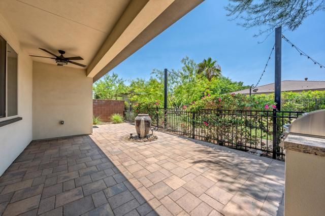 Lock & Leave Desert Retreat...Front & Back Landscaping Included...All Ages Are Welcome to Enjoy This Sunny South Facing Former Model Situated on a Premium Oversized Lot within Walking Distance to the Clubhouse. This Aria Floor Plan with Loft & Finished Den features approx 2,148 Sq. Ft. of Highly Upgraded Custom Appointments. Features include custom entry accent wall, plantation shutters and electric blinds, built-in cabinetry in the great room, upgraded lighting throughout, surround sound speakers, and upgraded tile accents in the kitchen and baths. The great room layout features the primary suite with sliders to the outdoor patio at one end with a guest bedroom and bath at the opposite end of the home. The second level with guest bath is the perfect space for a game room, theatre, or family room. The second level also includes a fully finished den with upgraded carpeting and custom shelving that could easily function as a guest bedroom for visiting friends and family. No surface has gone unnoticed, including the painted garage with epoxy flooring. The garage has been painted and features epoxy flooring. Trilogy Polo Membership is available for transfer. Pristine Clean and Move-In Ready...Don't miss this unique opportunity to own one of Trilogy Polo's finest!
