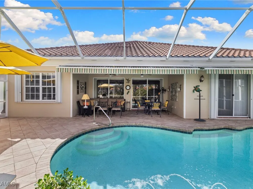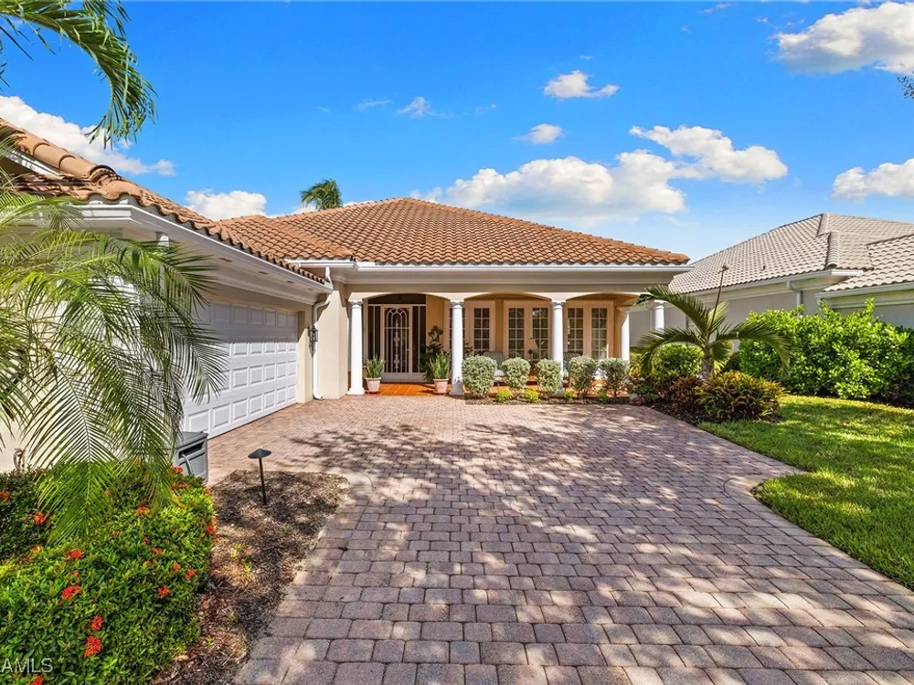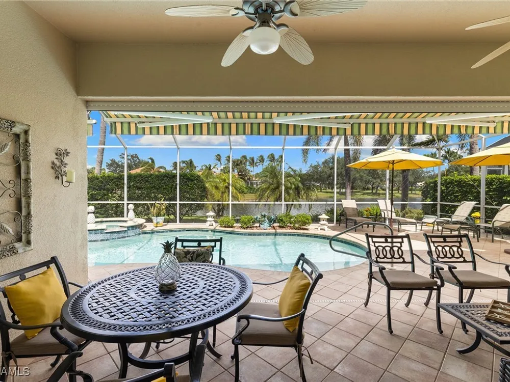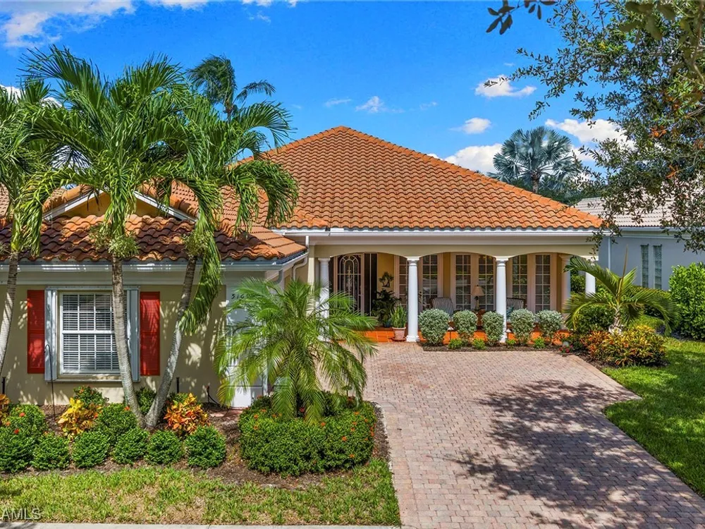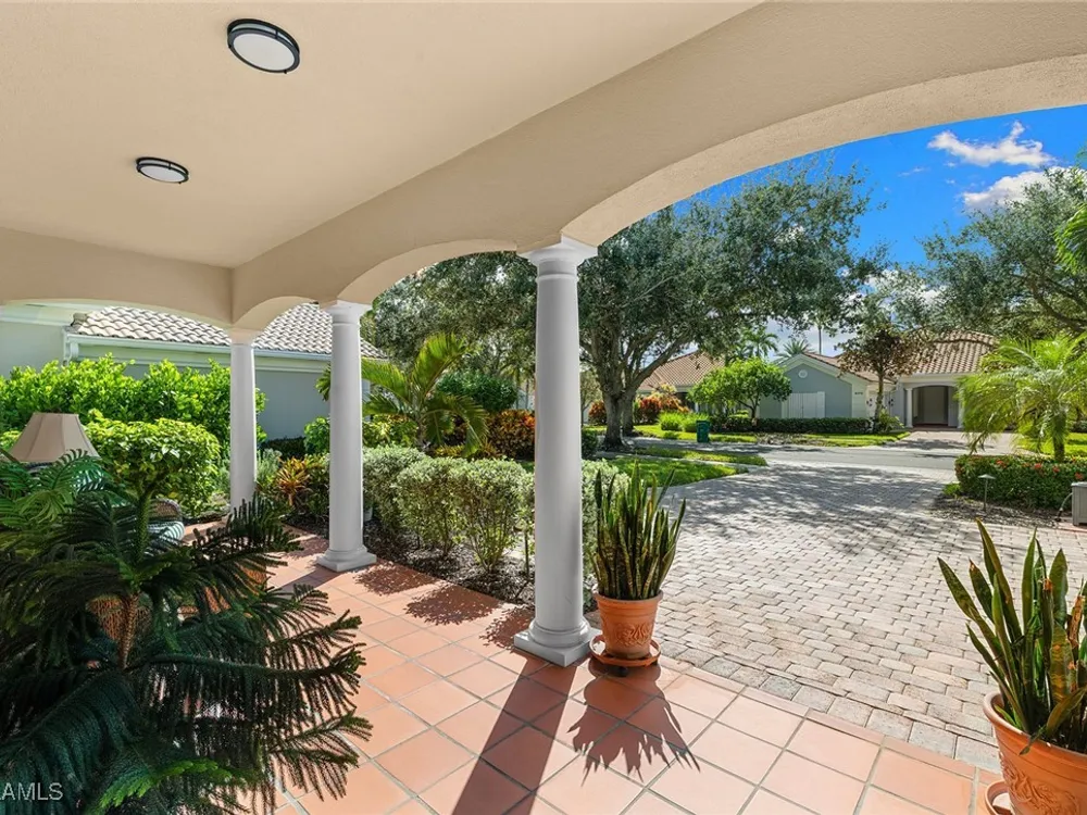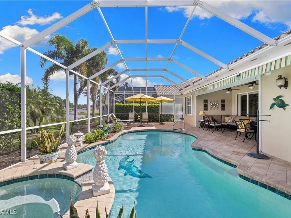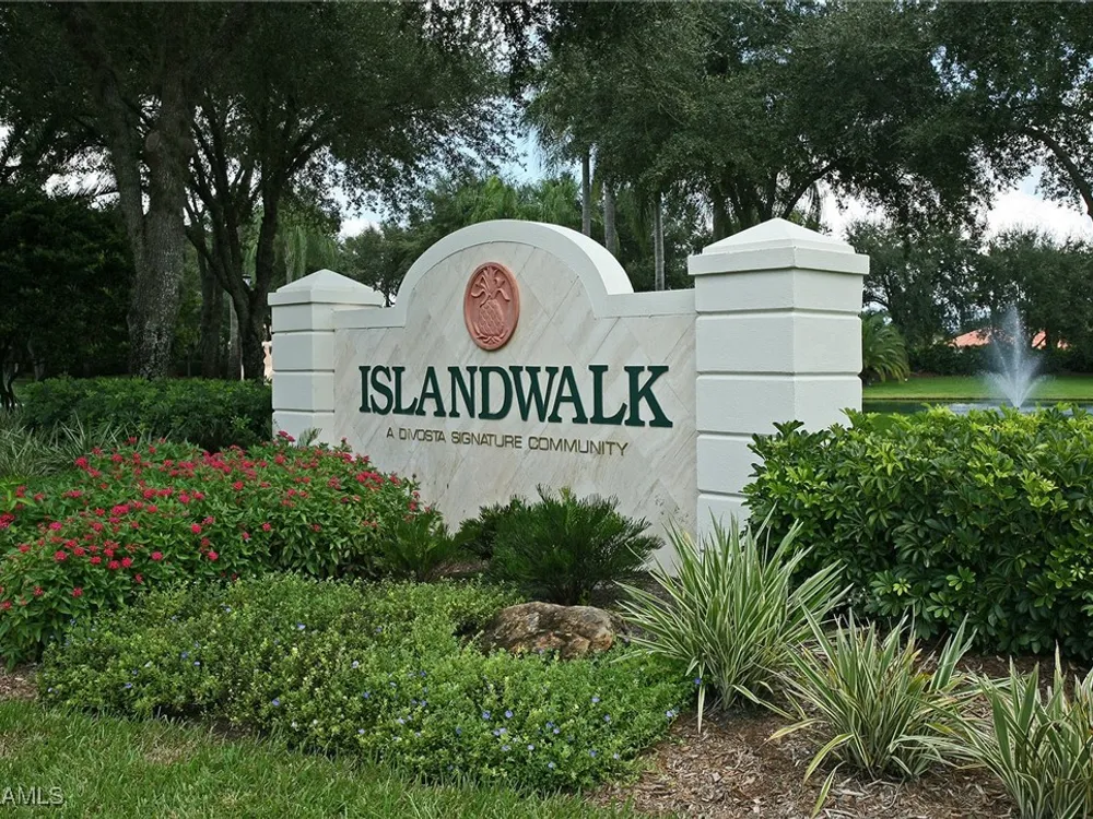 Located in the sought-after Island Walk community, this Carlyle model residence exemplifies Florida indoor-outdoor living. With Florida-style decor and Tommy Bahama-inspired finishes, the home features four bedrooms, three full baths and a two-car garage with an impact-resistant door and epoxy flooring. Interior features include a white kitchen with breakfast bar seating, a formal dining room and a spacious family room with multiple windows and a fireplace. Interior features include a white kitchen with breakfast bar seating, a formal dining room and a spacious family room with multiple windows and a fireplace. Flooring includes tile in main areas and engineered hardwood in select spaces. The primary suite includes separate his and her sinks and toilets, a soaking tub, a walk-in shower and direct access to the lanai. Imagine waking to a pool and lake view—this screened outdoor retreat features a custom solar-heated pool, hot tub spa, and dedicated living and dining areas. Two mechanical awnings provide added shade and comfort on the patio, making the space ideal for sunning, swimming or entertaining. A covered front patio adds even more versatility. Additional enhancements include a 2018 roof replacement, a 2022 air conditioning system and hurricane shutters for added peace of mind.Island Walk offers shaded streets, mature trees and scenic lakes in a tranquil setting. Residents enjoy a gated Town Center with a gas station, fitness center and resort-style pool. Athletic amenities include tennis, pickleball and pop tennis courts with grandstand seating, league play and lighted evening access. Close to shopping and dining and within 15 miles of Naples’ world-renowned beaches, this home offers a blend of privacy, resort-style amenities and lifestyle value in one of Naples’ premier lakefront communities.