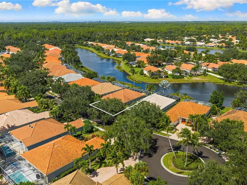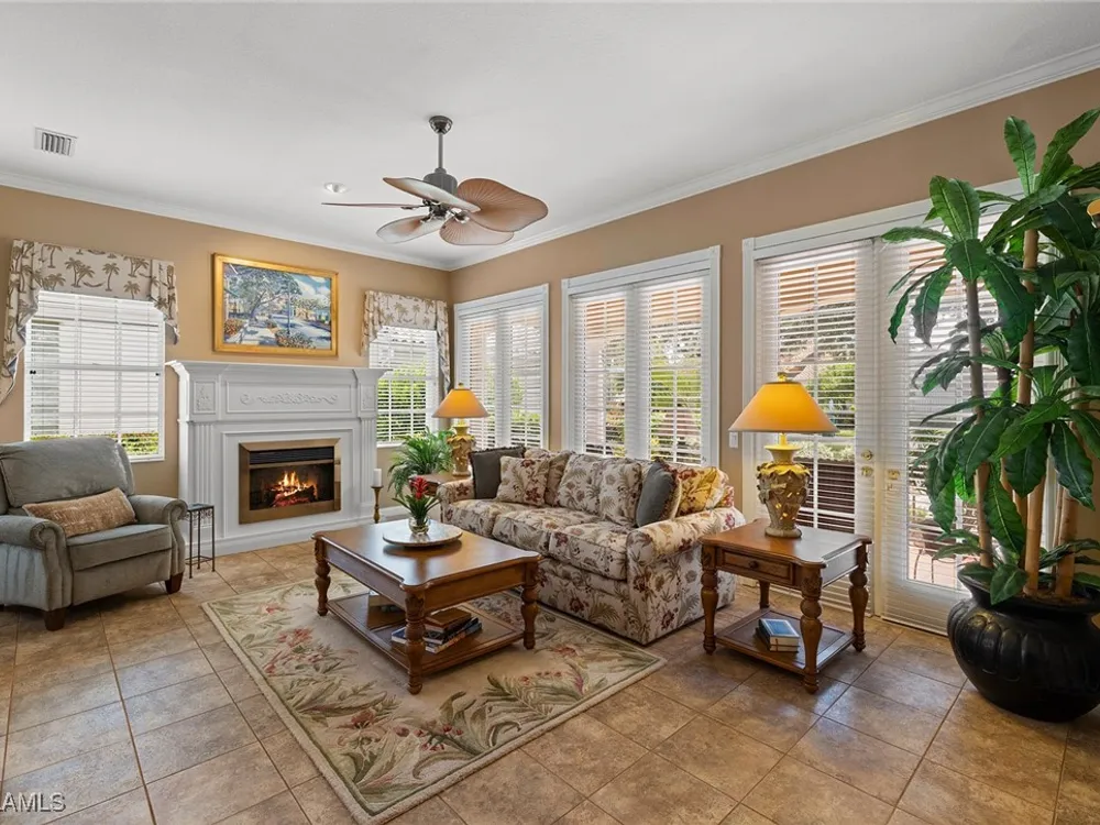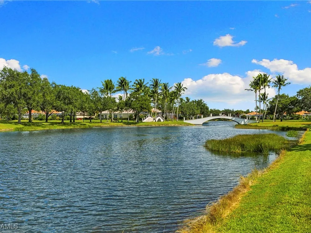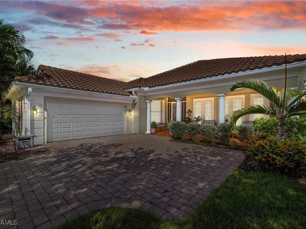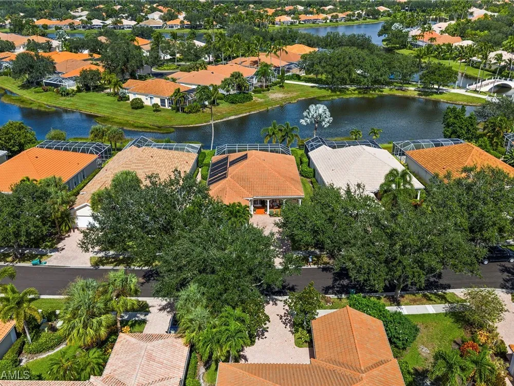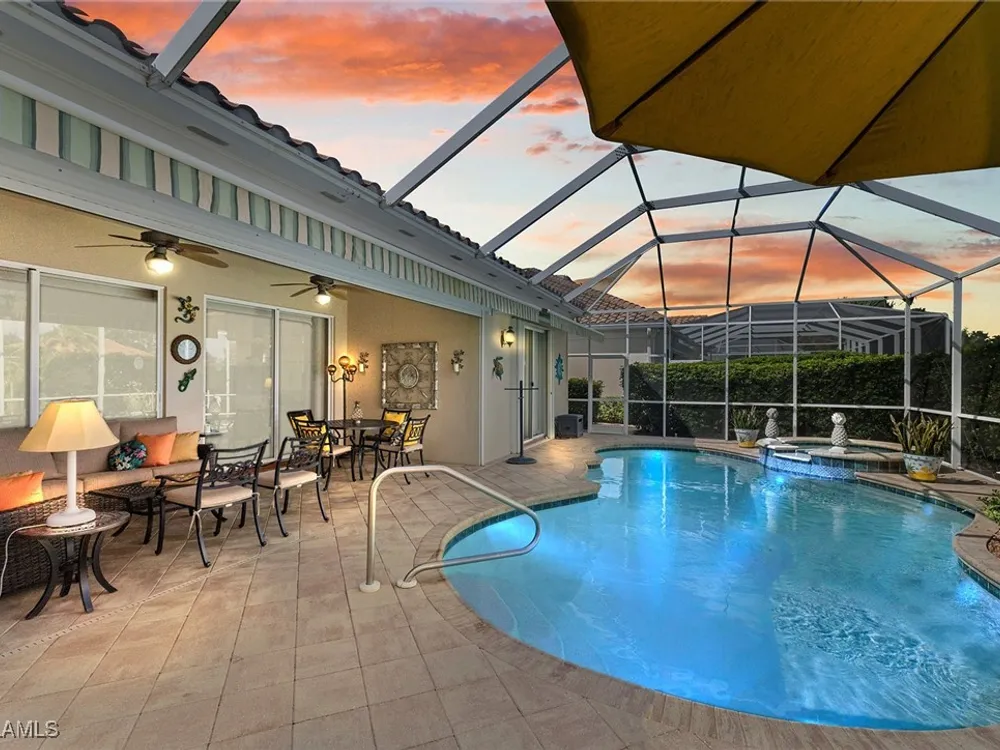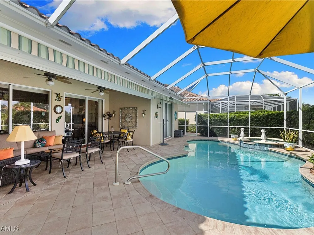 Located in the sought-after Island Walk community, this Carlyle model residence exemplifies Florida indoor-outdoor living. With Florida-style decor and Tommy Bahama-inspired finishes, the home features four bedrooms, three full baths and a two-car garage with an impact-resistant door and epoxy flooring. Interior features include a white kitchen with breakfast bar seating, a formal dining room and a spacious family room with multiple windows and a fireplace. Interior features include a white kitchen with breakfast bar seating, a formal dining room and a spacious family room with multiple windows and a fireplace. Flooring includes tile in main areas and engineered hardwood in select spaces. The primary suite includes separate his and her sinks and toilets, a soaking tub, a walk-in shower and direct access to the lanai. Imagine waking to a pool and lake view—this screened outdoor retreat features a custom solar-heated pool, hot tub spa, and dedicated living and dining areas. Two mechanical awnings provide added shade and comfort on the patio, making the space ideal for sunning, swimming or entertaining. A covered front patio adds even more versatility. Additional enhancements include a 2018 roof replacement, a 2022 air conditioning system and hurricane shutters for added peace of mind.Island Walk offers shaded streets, mature trees and scenic lakes in a tranquil setting. Residents enjoy a gated Town Center with a gas station, fitness center and resort-style pool. Athletic amenities include tennis, pickleball and pop tennis courts with grandstand seating, league play and lighted evening access. Close to shopping and dining and within 15 miles of Naples’ world-renowned beaches, this home offers a blend of privacy, resort-style amenities and lifestyle value in one of Naples’ premier lakefront communities.