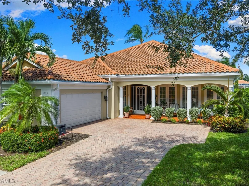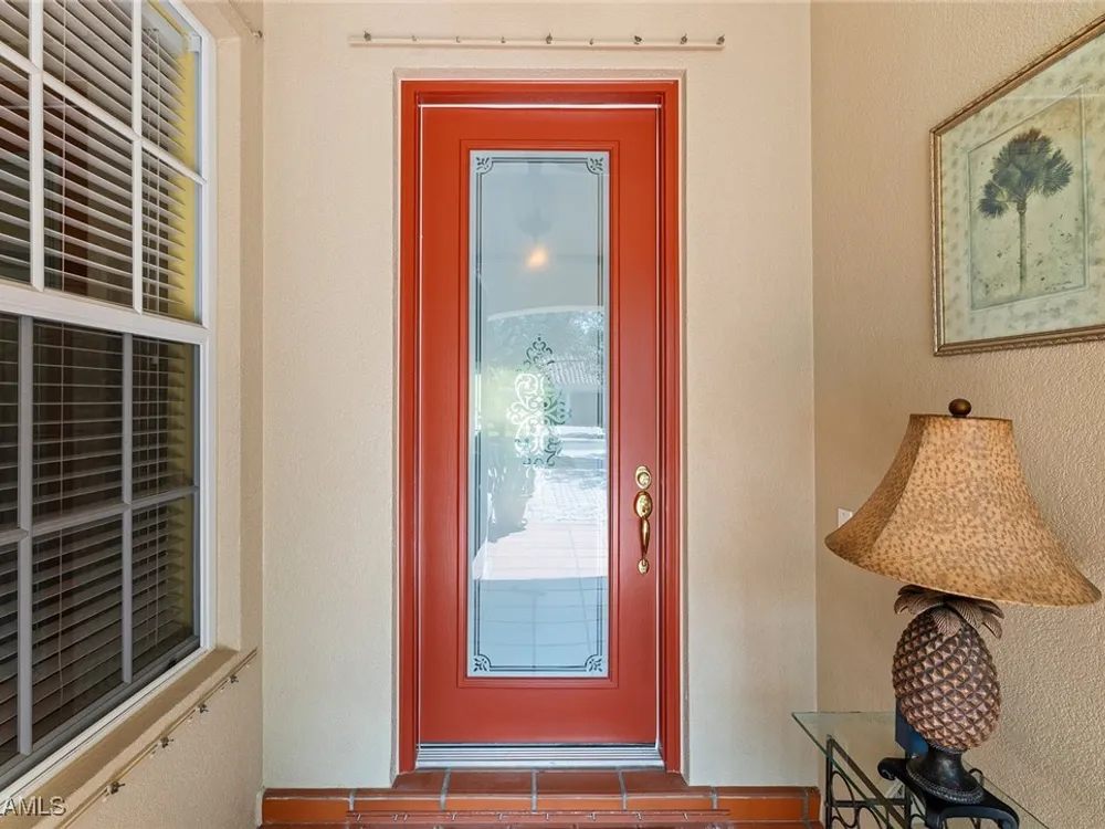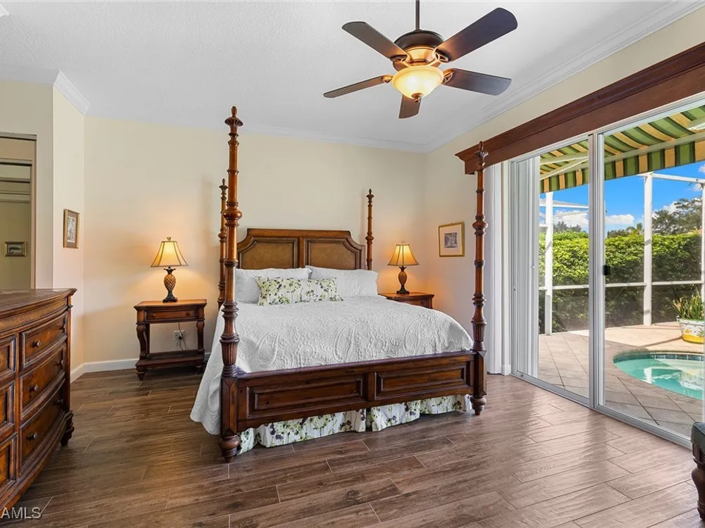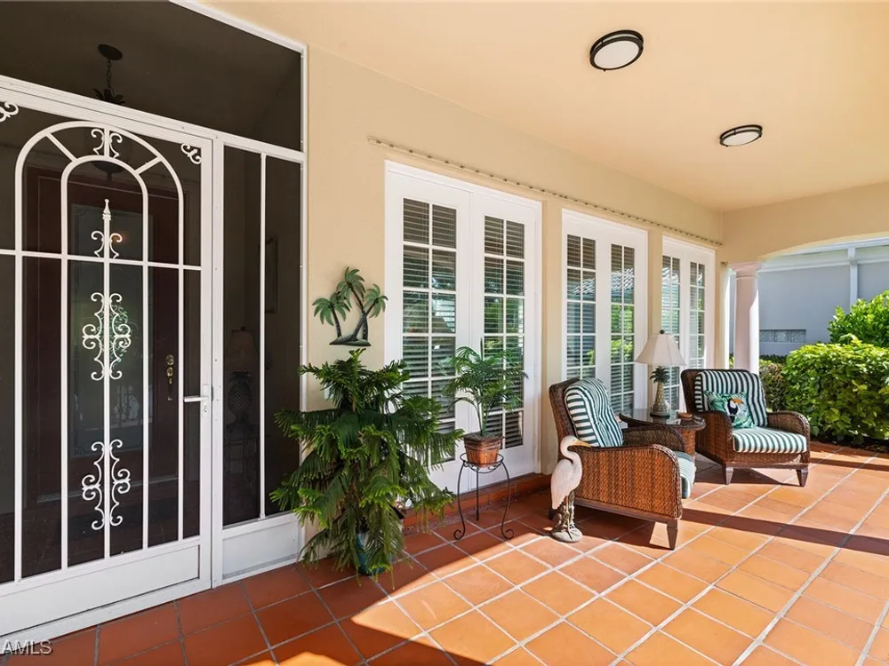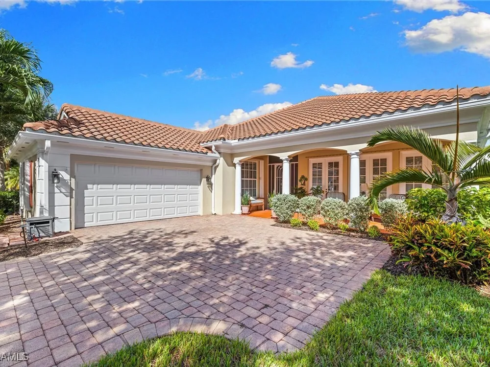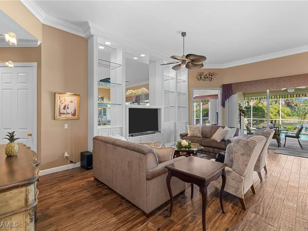 Located in the sought-after Island Walk community, this Carlyle model residence exemplifies Florida indoor-outdoor living. With Florida-style decor and Tommy Bahama-inspired finishes, the home features four bedrooms, three full baths and a two-car garage with an impact-resistant door and epoxy flooring. Interior features include a white kitchen with breakfast bar seating, a formal dining room and a spacious family room with multiple windows and a fireplace. Interior features include a white kitchen with breakfast bar seating, a formal dining room and a spacious family room with multiple windows and a fireplace. Flooring includes tile in main areas and engineered hardwood in select spaces. The primary suite includes separate his and her sinks and toilets, a soaking tub, a walk-in shower and direct access to the lanai. Imagine waking to a pool and lake view—this screened outdoor retreat features a custom solar-heated pool, hot tub spa, and dedicated living and dining areas. Two mechanical awnings provide added shade and comfort on the patio, making the space ideal for sunning, swimming or entertaining. A covered front patio adds even more versatility. Additional enhancements include a 2018 roof replacement, a 2022 air conditioning system and hurricane shutters for added peace of mind.Island Walk offers shaded streets, mature trees and scenic lakes in a tranquil setting. Residents enjoy a gated Town Center with a gas station, fitness center and resort-style pool. Athletic amenities include tennis, pickleball and pop tennis courts with grandstand seating, league play and lighted evening access. Close to shopping and dining and within 15 miles of Naples’ world-renowned beaches, this home offers a blend of privacy, resort-style amenities and lifestyle value in one of Naples’ premier lakefront communities.