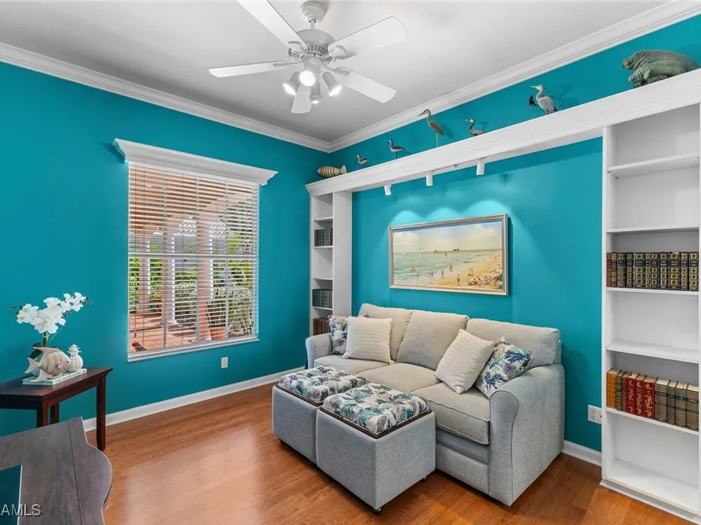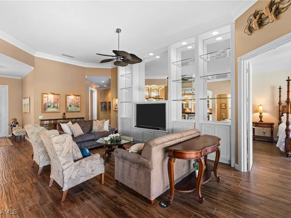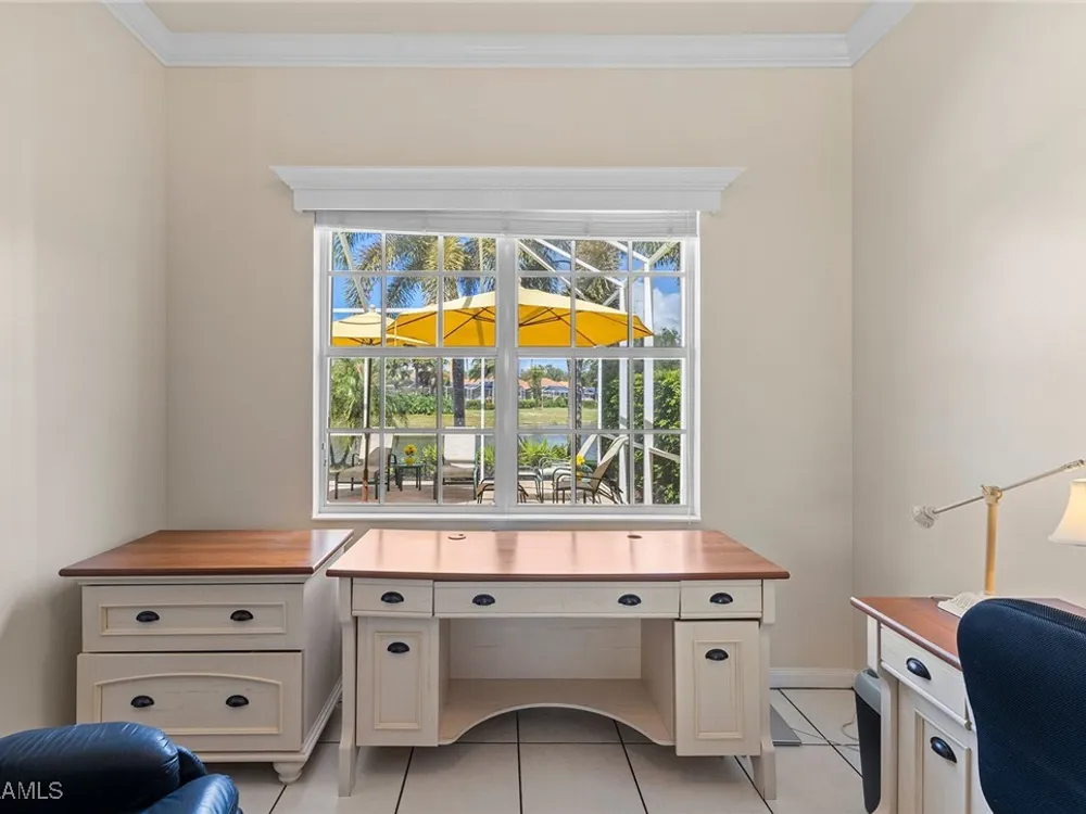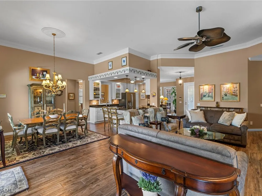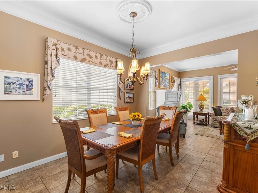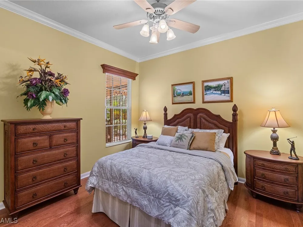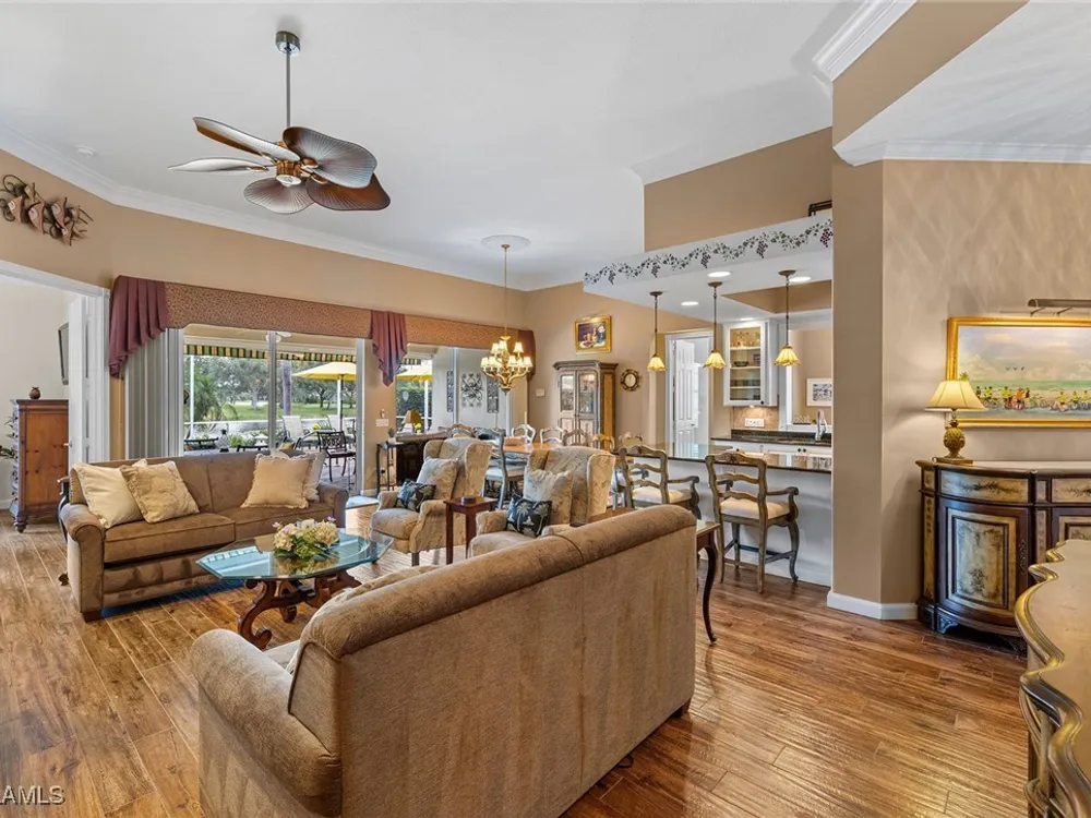 Located in the sought-after Island Walk community, this Carlyle model residence exemplifies Florida indoor-outdoor living. With Florida-style decor and Tommy Bahama-inspired finishes, the home features four bedrooms, three full baths and a two-car garage with an impact-resistant door and epoxy flooring. Interior features include a white kitchen with breakfast bar seating, a formal dining room and a spacious family room with multiple windows and a fireplace. Interior features include a white kitchen with breakfast bar seating, a formal dining room and a spacious family room with multiple windows and a fireplace. Flooring includes tile in main areas and engineered hardwood in select spaces. The primary suite includes separate his and her sinks and toilets, a soaking tub, a walk-in shower and direct access to the lanai. Imagine waking to a pool and lake view—this screened outdoor retreat features a custom solar-heated pool, hot tub spa, and dedicated living and dining areas. Two mechanical awnings provide added shade and comfort on the patio, making the space ideal for sunning, swimming or entertaining. A covered front patio adds even more versatility. Additional enhancements include a 2018 roof replacement, a 2022 air conditioning system and hurricane shutters for added peace of mind.Island Walk offers shaded streets, mature trees and scenic lakes in a tranquil setting. Residents enjoy a gated Town Center with a gas station, fitness center and resort-style pool. Athletic amenities include tennis, pickleball and pop tennis courts with grandstand seating, league play and lighted evening access. Close to shopping and dining and within 15 miles of Naples’ world-renowned beaches, this home offers a blend of privacy, resort-style amenities and lifestyle value in one of Naples’ premier lakefront communities.