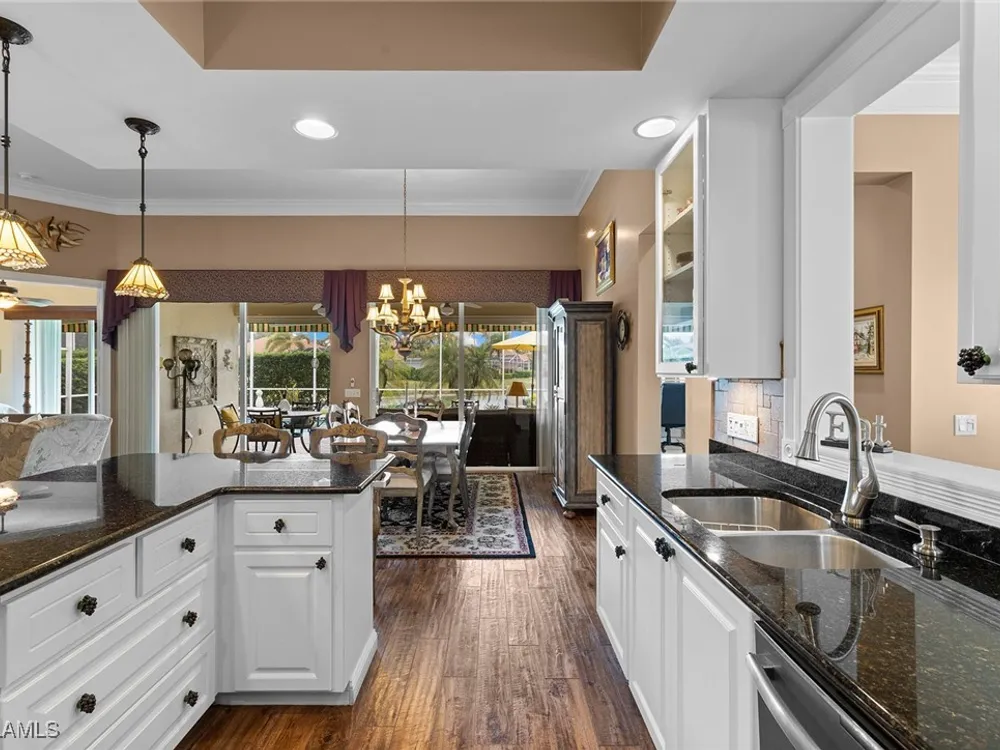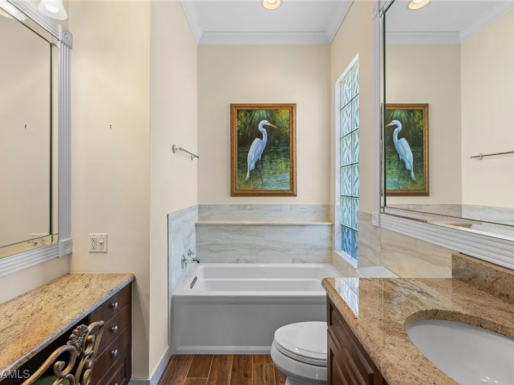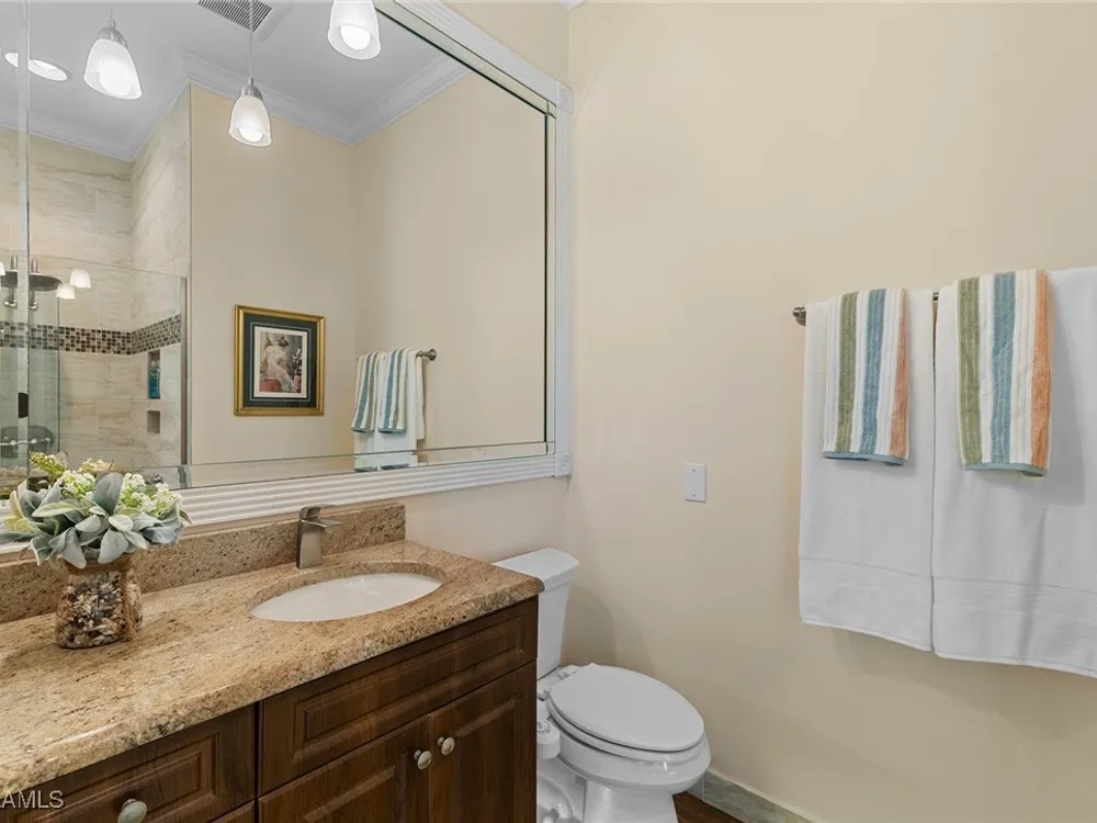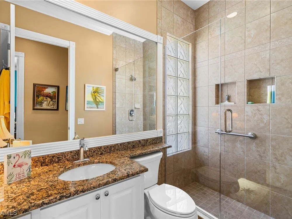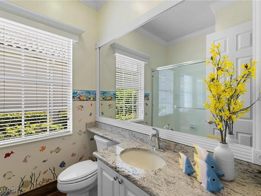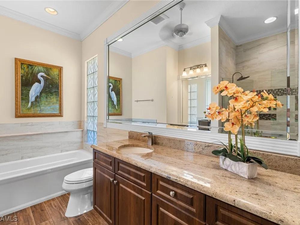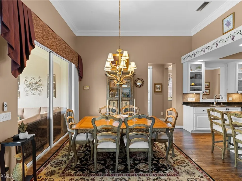 Located in the sought-after Island Walk community, this Carlyle model residence exemplifies Florida indoor-outdoor living. With Florida-style decor and Tommy Bahama-inspired finishes, the home features four bedrooms, three full baths and a two-car garage with an impact-resistant door and epoxy flooring. Interior features include a white kitchen with breakfast bar seating, a formal dining room and a spacious family room with multiple windows and a fireplace. Interior features include a white kitchen with breakfast bar seating, a formal dining room and a spacious family room with multiple windows and a fireplace. Flooring includes tile in main areas and engineered hardwood in select spaces. The primary suite includes separate his and her sinks and toilets, a soaking tub, a walk-in shower and direct access to the lanai. Imagine waking to a pool and lake view—this screened outdoor retreat features a custom solar-heated pool, hot tub spa, and dedicated living and dining areas. Two mechanical awnings provide added shade and comfort on the patio, making the space ideal for sunning, swimming or entertaining. A covered front patio adds even more versatility. Additional enhancements include a 2018 roof replacement, a 2022 air conditioning system and hurricane shutters for added peace of mind.Island Walk offers shaded streets, mature trees and scenic lakes in a tranquil setting. Residents enjoy a gated Town Center with a gas station, fitness center and resort-style pool. Athletic amenities include tennis, pickleball and pop tennis courts with grandstand seating, league play and lighted evening access. Close to shopping and dining and within 15 miles of Naples’ world-renowned beaches, this home offers a blend of privacy, resort-style amenities and lifestyle value in one of Naples’ premier lakefront communities.