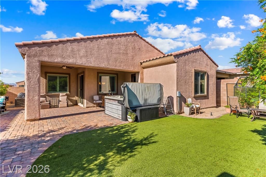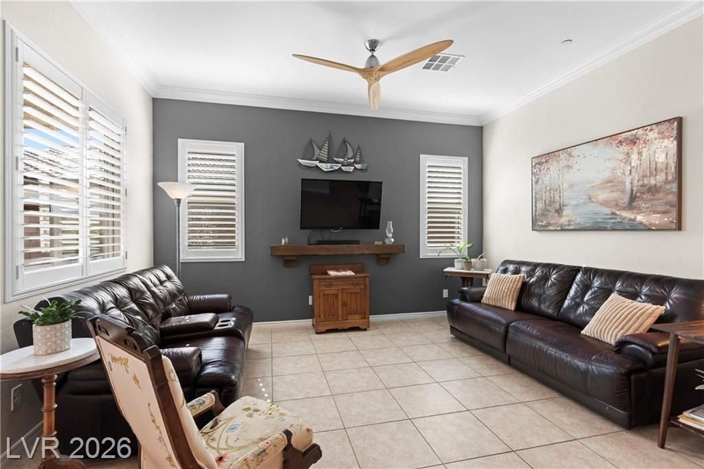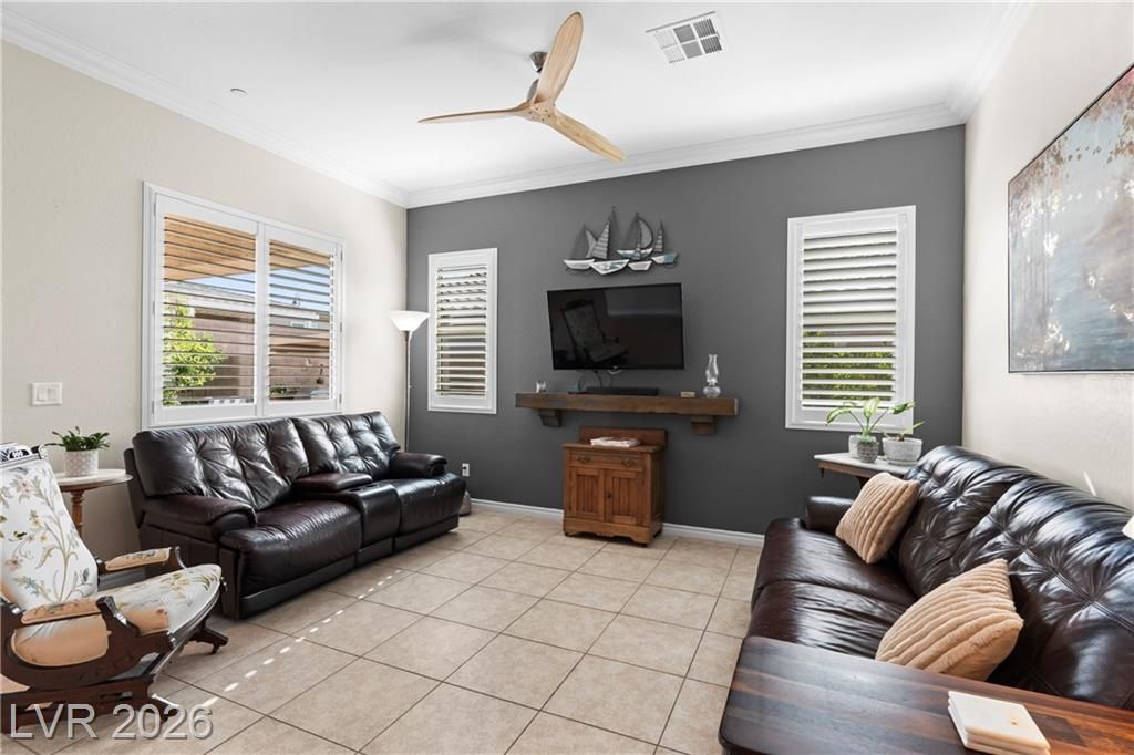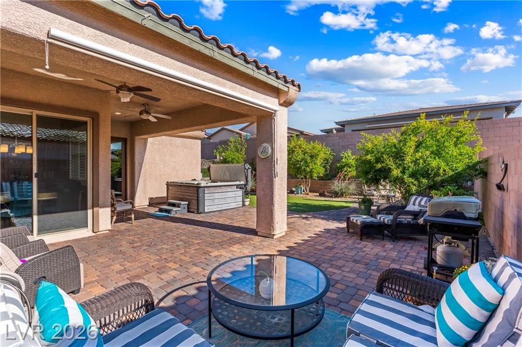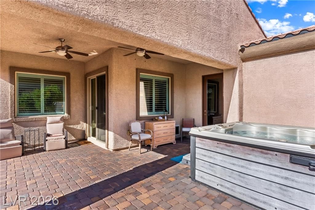 Not your average Henderson backyard...517 Sterling Falls Ave has fruit trees and its own greenhouse filled with wine grapes! Stunning single-story home in the highly sought-after Heritage at Cadence 55+ community! This meticulously maintained, highly upgraded residence offers a bright, open layout with 10’ ceilings and quality finishes throughout. Additional highlights include brand Hunter Douglas plantation shutters, two-tone paint, window blinds, and a dedicated laundry room with built-in cabinets. Enjoy resort-style living with exceptional community amenities, plus convenient access to shopping, dining, and parks. A must-see opportunity!