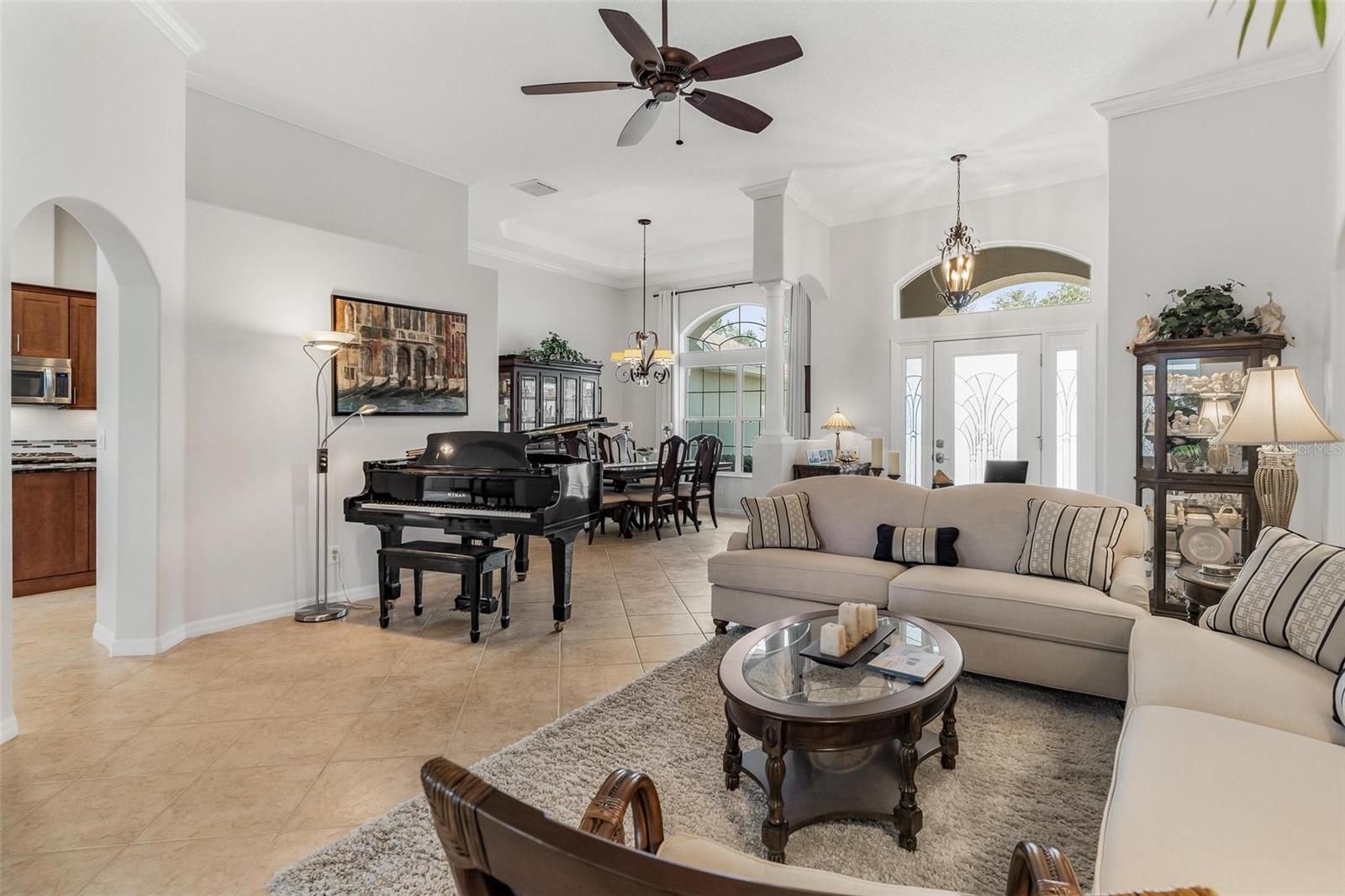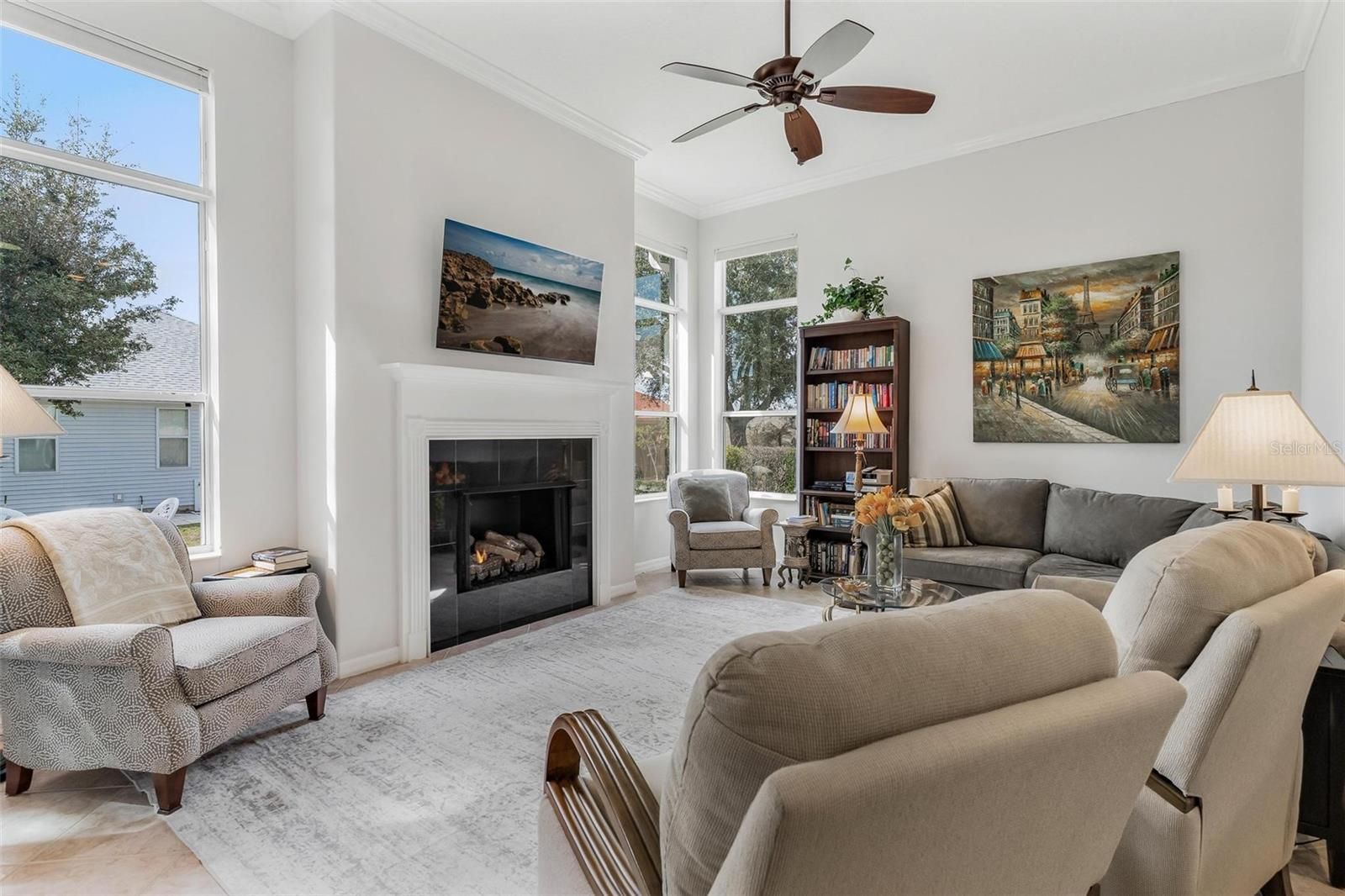 Welcome to this impeccably maintained, fully furnished, turn-key home in the sought-after 55+ waterfront community of Royal Harbor in Tavares. Thoughtfully upgraded and beautifully appointed with exquisite décor and furnishings (offered with a few personal exclusions), this 3-Bedroom, 2-Bath residence offers 2,162 square feet of elegant, easy living. Ceramic tile flows throughout the main Living Areas, while engineered hardwood enhances all Bedrooms. The Chef’s Kitchen is beautifully appointed with abundant solid maple cabinetry with under-cabinet lighting, granite countertops, convenient pull-outs, and quality stainless steel appliances including a 5-burner Bosch gas cooktop. The Breakfast Bar opens seamlessly to the Family Room, creating a warm, connected space ideal for everyday living and entertaining. Just off the Kitchen, the sunny Breakfast Nook is wrapped in windows that overlook the Florida Room, filling the space with natural light and offering views of the beautifully finished bonus living area. The inviting Family Room is warmed by a gas fireplace, and crown molding adds architectural charm to the Living Room, Dining Room, Family Room, and Primary Bedroom. The spacious Primary Suite opens to the Florida Room and features crown molding, a large walk-in closet, and an En-Suite Bath with soaking tub, separate walk-in shower, separate vanities, and a linen closet. A favorite gathering space is the enclosed Florida Room with acrylic windows, pull-down shades, beautiful paver flooring, and a dedicated mini-split (12/2022) for year-round comfort (not included in the home’s square footage). Recent updates include exterior paint (2022), interior paint (2023), A/C (2023), water heater (2025), and upgraded lighting fixtures throughout. Paver accents enhance the walkway and widened driveway apron, and the grand Entryway creates a striking first impression. The landscaped yard offers easy maintenance, allowing more time to enjoy the Royal Harbor lifestyle. Royal Harbor is a lushly landscaped, vibrant adult community on the Harris Chain of Lakes, featuring resort-style amenities including a spacious Clubhouse, Social Hall, heated Jr. Olympic-sized Pool and Spa, Fitness Center, Craft and Game Rooms, Billiards, Pickleball, Tennis, Bocce, Shuffleboard, Community Dock, Walking Paths, Lighthouse, and a full calendar of Activities and Clubs. RV, Boat, and Trailer storage are included in the HOA dues. This magnificent home is offered Fully Furnished with a few exclusions and is truly Move-In Ready! Call today for your private showing!
